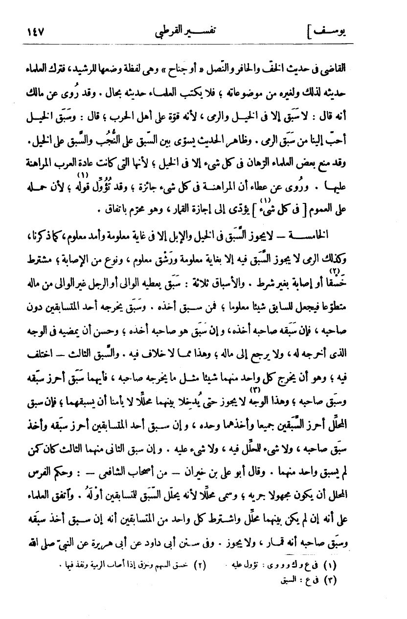 الْقَاضِي فِي حَدِيثِ الْخُفِّ وَالْحَافِرِ وَالنَّصْلِ" أَوْ جَنَاحٍ" وَهِيَ لَفْظَةٌ وَضَعَهَا لِلرَّشِيدِ، فَتَرَكَ الْعُلَمَاءُ حَدِيثَهُ لِذَلِكَ وَلِغَيْرِهِ مِنْ مَوْضُوعَاتِهِ، فَلَا يَكْتُبُ الْعُلَمَاءُ حَدِيثَهُ بِحَالٍ. وَقَدْ رُوِيَ عَنْ مَالِكٍ أَنَّهُ قَالَ: لَا سَبَقَ إِلَّا فِي الْخَيْلِ وَالرَّمْيِ، لِأَنَّهُ قُوَّةٌ عَلَى أَهْلِ الْحَرْبِ، قَالَ: وَسَبَقُ الْخَيْلِ أَحَبُّ إِلَيْنَا مِنْ سَبَقِ الرَّمْيِ. وظاهر الحديث يستوي بَيْنَ السَّبَقِ عَلَى النُّجُبِ وَالسَّبَقِ عَلَى الْخَيْلِ. وَقَدْ مَنَعَ بَعْضُ الْعُلَمَاءِ الرِّهَانَ فِي كُلِّ شي إِلَّا فِي الْخَيْلِ، لِأَنَّهَا الَّتِي كَانَتْ عَادَةُ الْعَرَبِ الْمُرَاهَنَةَ عَلَيْهَا. وَرُوِيَ عَنْ عَطَاءٍ أَنَّ المراهنة في كل شي جَائِزَةٌ، وَقَدْ تُؤُوِّلَ قَوْلُهُ، لِأَنَّ حَمْلَهُ عَلَى العموم [في كل شي «١»] يُؤَدِّي إِلَى، إِجَازَةِ الْقِمَارِ، وَهُوَ مُحَرَّمٌ بِاتِّفَاقٍ. الْخَامِسَةُ- لَا يَجُوزُ السَّبَقُ فِي الْخَيْلِ وَالْإِبِلِ إِلَّا فِي غَايَةٍ مَعْلُومَةٍ وَأَمَدٍ مَعْلُومٍ، كَمَا ذَكَرْنَا، وَكَذَلِكَ الرَّمْيُ لَا يَجُوزُ السَّبَقُ فِيهِ إِلَّا بِغَايَةٍ مَعْلُومَةٍ وَرَشْقٍ مَعْلُومٍ، وَنَوْعٍ مِنَ الْإِصَابَةِ، مُشْتَرَطٍ خَسْقًا «٢» أَوْ إِصَابَةٍ بِغَيْرِ شَرْطٍ. وَالْأَسْبَاقُ ثَلَاثَةٌ: سَبَقٌ يُعْطِيهِ الْوَالِي أَوِ الرَّجُلُ غَيْرُ الْوَالِي مِنْ مَالِهِ مُتَطَوِّعًا فَيَجْعَلُ لِلسَّابِقِ شَيْئًا مَعْلُومًا، فَمَنْ سَبَقَ أَخَذَهُ. وَسَبَقٌ يُخْرِجُهُ أَحَدُ الْمُتَسَابِقَيْنِ دُونَ صَاحِبِهِ، فَإِنْ سَبَقَهُ صَاحِبُهُ أَخَذَهُ، وَإِنْ سَبَقَ هُوَ صَاحِبَهُ أَخَذَهُ، وَحَسَنٌ أَنْ يُمْضِيَهُ فِي الْوَجْهِ الَّذِي أَخْرَجَهُ لَهُ، وَلَا يَرْجِعُ إِلَى مَالِهِ، وَهَذَا مِمَّا لَا خِلَافَ فِيهِ. وَالسَّبَقُ الثَّالِثُ- اخْتُلِفَ فِيهِ، وَهُوَ أَنْ يُخْرِجَ كُلٌّ وَاحِدٌ مِنْهُمَا شَيْئًا مِثْلَ مَا يُخْرِجُهُ صَاحِبُهُ، فَأَيُّهمَا سَبَقَ أَحْرَزَ سَبَقَهُ وَسَبَقَ صَاحِبِهِ، وَهَذَا الْوَجْهُ «٣» لَا يَجُوزُ حَتَّى يُدْخِلَا بَيْنَهُمَا مُحَلِّلًا لَا يَأْمَنَا أَنْ يَسْبِقَهُمَا، فَإِنْ سَبَقَ الْمُحَلِّلُ أَحْرَزَ السَّبَقَيْنِ جَمِيعًا وَأَخَذَهُمَا وَحْدَهُ، وَإِنْ سَبَقَ أَحَدُ الْمُتَسَابِقَيْنِ أَحْرَزَ سَبَقَهُ واخذ سبق صاحبه، ولا شي للمحلل فيه، ولا شي عَلَيْهِ. وَإِنْ سَبَقَ الثَّانِي مِنْهُمَا الثَّالِثَ كَانَ كَمَنْ لَمْ يَسْبِقْ وَاحِدٌ مِنْهُمَا. وَقَالَ أَبُو عَلِيِّ بْنُ خَيْرَانَ- مِنْ أَصْحَابِ الشَّافِعِيِّ-: وَحُكْمُ الْفَرَسِ الْمُحَلِّلِ أَنْ يَكُونَ مَجْهُولًا جَرْيُهُ، وَسُمِّيَ مُحَلِّلًا لِأَنَّهُ يُحَلِّلُ السَّبَقَ لِلْمُتَسَابِقَيْنِ أَوْ لَهُ. وَاتَّفَقَ الْعُلَمَاءُ عَلَى أَنَّهُ إِنْ لَمْ يَكُنْ بَيْنَهُمَا مُحَلِّلٌ وَاشْتَرَطَ كُلُّ وَاحِدٍ مِنَ الْمُتَسَابِقَيْنِ أَنَّهُ إِنْ سَبَقَ أَخَذَ سَبَقَهُ وَسَبَقَ صَاحِبُهُ أَنَّهُ قِمَارٌ، وَلَا يَجُوزُ. وَفِي سُنَنِ أَبِي دَاوُدَ عَنْ أَبِي هُرَيْرَةَ عَنِ النَّبِيِّ صَلَّى اللَّهُ