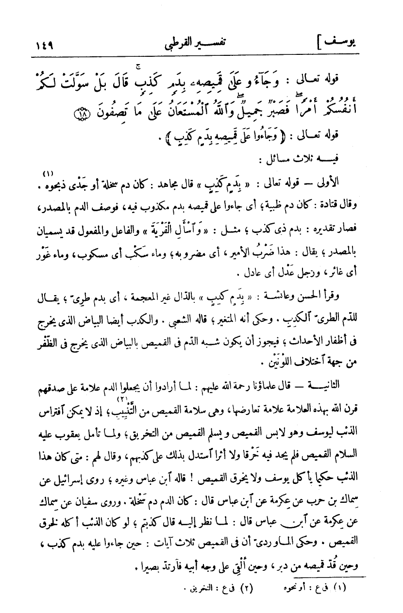 قوله تعالى: (وَجاؤُ عَلى قَمِيصِهِ بِدَمٍ كَذِبٍ). فِيهِ ثَلَاثُ مَسَائِلَ الْأُولَى- قَوْلُهُ تَعَالَى:" بِدَمٍ كَذِبٍ" قَالَ مُجَاهِدٌ: كَانَ دَمَ سَخْلَةٍ أَوْ جَدْيٍ ذَبَحُوهُ «١». وَقَالَ قَتَادَةُ: كَانَ دَمَ ظَبْيَةٍ، أَيْ جَاءُوا عَلَى قَمِيصِهِ بِدَمٍ مَكْذُوبٍ فِيهِ، فَوَصَفَ الدَّمَ بِالْمَصْدَرِ، فصار تقديره: بدم ذي كذب، مثل:" وَسْئَلِ الْقَرْيَةَ" [يوسف: ٨٢] وَالْفَاعِلُ وَالْمَفْعُولُ قَدْ يُسَمَّيَانِ بِالْمَصْدَرِ، يُقَالُ: هَذَا ضَرْبُ الْأَمِيرِ، أَيْ مَضْرُوبُهُ وَمَاءٌ سَكْبٌ أَيْ مَسْكُوبٌ، وَمَاءٌ غَوْرٌ أَيْ غَائِرٌ، وَرَجُلٌ عَدْلٌ أَيْ عَادِلٌ. وَقَرَأَ الْحَسَنُ وَعَائِشَةُ:" بِدَمٍ كَدِبٍ" بِالدَّالِ غَيْرَ الْمُعْجَمَةِ، أَيْ بِدَمٍ طَرِيٍّ، يُقَالُ لِلدَّمِ الطَّرِيِّ الْكَدِبُ. وَحُكِيَ أَنَّهُ الْمُتَغَيِّرُ، قَالَهُ الشَّعْبِيُّ. وَالْكَدِبُ أَيْضًا الْبَيَاضُ الَّذِي يَخْرُجُ فِي أَظْفَارِ الْأَحْدَاثِ، فَيَجُوزُ أَنْ يَكُونَ شُبِّهَ الدَّمُ فِي الْقَمِيصِ بِالْبَيَاضِ الَّذِي يَخْرُجُ فِي الظُّفْرِ مِنْ جِهَةِ اخْتِلَافِ اللَّوْنَيْنِ. الثَّانِيَةُ- قَالَ عُلَمَاؤُنَا رَحْمَةُ اللَّهِ عَلَيْهِمْ: لَمَّا أَرَادُوا أَنْ يَجْعَلُوا الدَّمَ عَلَامَةً عَلَى صِدْقِهِمْ قَرَنَ اللَّهُ بِهَذِهِ الْعَلَامَةِ عَلَامَةً تُعَارِضُهَا، وَهِيَ سَلَامَةُ الْقَمِيصِ مِنَ التَّنْيِيبِ «٢»، إِذْ لَا يُمْكِنُ افْتِرَاسُ الذِّئْبِ لِيُوسُفَ وَهُوَ لَابِسٌ الْقَمِيصَ وَيَسْلَمُ الْقَمِيصُ مِنَ التَّخْرِيقِ، وَلَمَّا تَأَمَّلَ يَعْقُوبُ عَلَيْهِ السَّلَامُ الْقَمِيصَ فَلَمْ يَجِدْ فِيهِ خَرْقًا وَلَا أَثَرًا اسْتَدَلَّ بِذَلِكَ عَلَى كَذِبِهِمْ، وَقَالَ لَهُمْ: مَتَى كَانَ هَذَا الذِّئْبُ حَكِيمًا يَأْكُلُ يُوسُفَ وَلَا يَخْرِقُ الْقَمِيصَ! قَالَهُ ابْنُ عَبَّاسٍ وَغَيْرُهُ، رَوَى إِسْرَائِيلُ عَنْ سِمَاكُ بْنُ حَرْبٍ عَنْ عِكْرِمَةَ عَنِ ابْنِ عَبَّاسٍ قَالَ: كَانَ الدَّمُ دَمَ سَخْلَةٍ. وَرَوَى سُفْيَانُ عَنْ سِمَاكٍ عَنْ عِكْرِمَةَ عَنِ ابْنِ عَبَّاسٍ قَالَ: لَمَّا نَظَرَ إِلَيْهِ قَالَ كَذَبْتُمْ، لَوْ كَانَ الذِّئْبُ أَكَلَهُ لَخَرَقَ الْقَمِيصَ. وَحَكَى الْمَاوَرْدِيُّ أَنَّ فِي الْقَمِيصِ ثَلَاثَ آيَاتٍ: حِينَ جَاءُوا عَلَيْهِ بِدَمٍ كَذِبٍ، وَحِينَ قُدَّ قَمِيصُهُ مِنْ دُبُرٍ، وَحِينَ أُلْقِيَ عَلَى وَجْهِ أَبِيهِ فارتد بصيرا.