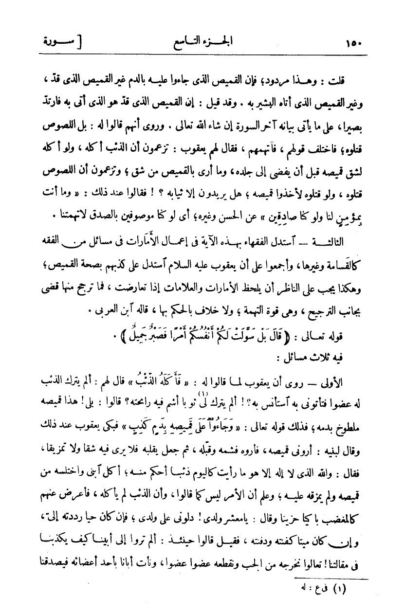 قُلْتُ: وَهَذَا مَرْدُودٌ، فَإِنَّ الْقَمِيصَ الَّذِي جَاءُوا عَلَيْهِ بِالدَّمِ غَيْرُ الْقَمِيصِ الَّذِي قُدَّ، وَغَيْرُ الْقَمِيصِ الَّذِي أَتَاهُ الْبَشِيرُ بِهِ. وَقَدْ قِيلَ: إِنَّ الْقَمِيصَ الَّذِي قُدَّ هُوَ الَّذِي أُتِيَ بِهِ فَارْتَدَّ بَصِيرًا، عَلَى مَا يَأْتِي بَيَانُهُ آخِرَ السُّورَةِ إِنْ شَاءَ اللَّهُ تَعَالَى. وَرُوِيَ أَنَّهُمْ قَالُوا لَهُ: بَلِ اللُّصُوصُ قَتَلُوهُ، فَاخْتَلَفَ قَوْلُهُمْ، فَاتَّهَمَهُمْ، فَقَالَ لَهُمْ يَعْقُوبُ: تَزْعُمُونَ أَنَّ الذِّئْبَ أَكَلَهُ، وَلَوْ أَكَلَهُ لَشَقَّ قَمِيصَهُ قَبْلَ أَنْ يُفْضِيَ إِلَى جِلْدِهِ، وَمَا أَرَى بِالْقَمِيصِ مِنْ شَقٍّ، وَتَزْعُمُونَ أَنَّ اللُّصُوصَ قَتَلُوهُ، وَلَوْ قَتَلُوهُ لَأَخَذُوا قَمِيصَهُ، هَلْ يُرِيدُونَ إِلَّا ثِيَابَهُ؟! فَقَالُوا عِنْدَ ذَلِكَ:" وَما أَنْتَ بِمُؤْمِنٍ لَنا وَلَوْ كُنَّا صادِقِينَ" عَنِ الْحَسَنِ وَغَيْرِهِ، أَيْ لو كنا موصوفين بالصدق لا تهمتنا. الثَّالِثَةُ- اسْتَدَلَّ الْفُقَهَاءُ بِهَذِهِ الْآيَةِ فِي إِعْمَالِ الْأَمَارَاتِ فِي مَسَائِلَ مِنَ الْفِقْهِ كَالْقَسَامَةِ وَغَيْرِهَا، وَأَجْمَعُوا عَلَى أَنَّ يَعْقُوبَ عَلَيْهِ السَّلَامُ اسْتَدَلَّ عَلَى كَذِبِهِمْ بِصِحَّةِ الْقَمِيصِ، وَهَكَذَا يَجِبُ عَلَى النَّاظِرِ أَنْ يَلْحَظَ الْأَمَارَاتِ وَالْعَلَامَاتِ إِذَا تَعَارَضَتْ، فَمَا تَرَجَّحَ مِنْهَا قَضَى بِجَانِبِ التَّرْجِيحِ، وَهِيَ قُوَّةُ التُّهْمَةِ، وَلَا خِلَافَ بِالْحُكْمِ بِهَا، قَالَهُ بن الْعَرَبِيِّ. قَوْلُهُ تَعَالَى: (قالَ بَلْ سَوَّلَتْ لَكُمْ أَنْفُسُكُمْ أَمْراً فَصَبْرٌ جَمِيلٌ). فِيهِ ثَلَاثُ مَسَائِلَ: الْأُولَى- رُوِيَ أَنَّ يَعْقُوبَ لَمَّا قَالُوا لَهُ:" فَأَكَلَهُ الذِّئْبُ" قَالَ لَهُمْ: أَلَمْ يَتْرُكِ الذِّئْبُ لَهُ عُضْوًا فَتَأْتُونِي بِهِ أَسْتَأْنِسُ بِهِ؟! أَلَمْ يَتْرُكْ لِي ثَوْبًا «١» أَشُمُّ فِيهِ رَائِحَتَهُ؟ قَالُوا: بَلَى! هَذَا قَمِيصُهُ مَلْطُوخٌ بِدَمِهِ، فَذَلِكَ قَوْلُهُ تعالى:" وَجاؤُ عَلى قَمِيصِهِ بِدَمٍ كَذِبٍ" فَبَكَى يَعْقُوبُ عِنْدَ ذَلِكَ وَقَالَ، لِبَنِيهِ: أَرُونِي قَمِيصَهُ، فَأَرَوْهُ فَشَمَّهُ وَقَبَّلَهُ، ثُمَّ جَعَلَ يُقَلِّبُهُ فَلَا يَرَى فِيهِ شَقًّا وَلَا تَمْزِيقًا، فَقَالَ: وَاللَّهِ الَّذِي لَا إِلَهَ إِلَّا هُوَ مَا رَأَيْتُ كَالْيَوْمِ ذِئْبًا أَحْكَمَ مِنْهُ، أَكَلَ ابْنِي وَاخْتَلَسَهُ مِنْ قَمِيصِهِ وَلَمْ يُمَزِّقْهُ عَلَيْهِ، وَعَلِمَ أَنَّ الْأَمْرَ لَيْسَ كَمَا قَالُوا، وَأَنَّ الذِّئْبَ لَمْ يَأْكُلْهُ، فَأَعْرَضَ عَنْهُمْ كَالْمُغْضَبِ بَاكِيًا حَزِينًا وَقَالَ: يَا مَعْشَرَ وَلَدِي! دُلُّونِي عَلَى وَلَدِي، فَإِنْ كَانَ حَيًّا رَدَدْتُهُ إِلَيَّ، وَإِنْ كَانَ مَيِّتًا كَفَّنْتُهُ وَدَفَنْتُهُ، فَقِيلَ قَالُوا حِينَئِذٍ: أَلَمْ تَرَوْا إِلَى أَبِينَا كَيْفَ يُكَذِّبُنَا فِي مَقَالَتِنَا! تَعَالَوْا نُخْرِجْهُ مِنَ الْجُبِّ وَنَقْطَعْهُ عُضْوًا عُضْوًا، وَنَأْتِ أَبَانَا بِأَحَدِ أعضائه فيصدقنا