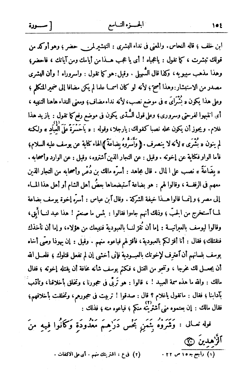 بن خلف، قال النَّحَّاسُ. وَالْمَعْنَى فِي نِدَاءِ الْبُشْرَى: التَّبْشِيرُ لِمَنْ حَضَرَ، وَهُوَ أَوْكَدُ مِنْ قَوْلِكَ تَبَشَّرْتُ، كَمَا تَقُولُ: يَا عَجَبَاهُ! أَيْ يَا عَجَبُ هَذَا مِنْ أَيَّامِكَ وَمِنْ آيَاتِكَ، فَاحْضُرْ، وَهَذَا مَذْهَبُ سِيبَوَيْهِ، وَكَذَا قَالَ السُّهَيْلِيُّ. وَقِيلَ: هُوَ كَمَا تقول: وا سروراه! وَأَنَّ الْبُشْرَى مَصْدَرٌ مِنَ الِاسْتِبْشَارِ: وَهَذَا أَصَحُّ، لِأَنَّهُ لَوْ كَانَ اسْمًا عَلَمًا لَمْ يَكُنْ مُضَافًا إِلَى ضَمِيرِ الْمُتَكَلِّمِ، وَعَلَى هَذَا يَكُونُ" بُشْرى " فِي مَوْضِعِ نَصْبٍ، لِأَنَّهُ نِدَاءٌ مُضَافٌ، وَمَعْنَى النِّدَاءِ هَاهُنَا التَّنْبِيهُ، أَيِ انْتَبِهُوا لِفَرْحَتِي وَسُرُورِي، وَعَلَى قَوْلِ السُّدِّيِّ يَكُونُ فِي مَوْضِعِ رَفْعٍ كَمَا تَقُولُ: يَا زَيْدُ هَذَا غُلَامٌ. وَيَجُوزُ أَنْ يَكُونَ مَحَلُّهُ نَصْبًا كَقَوْلِكَ: يَا رَجُلًا، وقوله:" يا حَسْرَةً عَلَى الْعِبادِ" «١» [يس: ٣٠] وَلَكِنَّهُ لَمْ يُنَوِّنْ" بُشْرَى" لِأَنَّهُ لَا يَنْصَرِفُ. (وَأَسَرُّوهُ بِضاعَةً) الْهَاءُ كِنَايَةٌ عَنْ يُوسُفَ عَلَيْهِ السَّلَامُ، فَأَمَّا الْوَاوُ فَكِنَايَةٌ عَنْ إِخْوَتِهِ. وَقِيلَ: عَنِ التُّجَّارِ الَّذِينَ اشْتَرَوْهُ، وَقِيلَ: عَنِ الْوَارِدِ وَأَصْحَابِهِ." بِضاعَةً" نُصِبَ عَلَى الْحَالِ. قَالَ مُجَاهِدٌ: أَسَرَّهُ مَالِكُ بْنُ دُعْرٍ وَأَصْحَابُهُ مِنَ التُّجَّارِ الَّذِينَ مَعَهُمْ فِي الرُّفْقَةِ، وَقَالُوا لَهُمْ: هُوَ بِضَاعَةٌ اسْتَبْضَعْنَاهَا بَعْضُ أَهْلِ الشَّامِ أَوْ أَهْلِ هَذَا الْمَاءِ إِلَى مِصْرَ، وَإِنَّمَا قَالُوا هَذَا خِيفَةَ الشَّرِكَةِ. وَقَالَ ابْنُ عَبَّاسٍ: أَسَرَّهُ إِخْوَةُ يُوسُفَ بِضَاعَةً لَمَّا اسْتُخْرِجَ مِنَ الْجُبِّ، وَذَلِكَ أَنَّهُمْ جَاءُوا فَقَالُوا: بِئْسَ مَا صَنَعْتُمْ! هَذَا عَبْدٌ لَنَا أَبَقَ، وَقَالُوا لِيُوسُفَ بِالْعِبْرَانِيَّةِ: إِمَّا أَنْ تُقِرَّ لَنَا بِالْعُبُودِيَّةِ فَنَبِيعَكَ مِنْ هَؤُلَاءِ، وَإِمَّا أَنْ نَأْخُذَكَ فَنَقْتُلَكَ، فَقَالَ: أَنَا أُقِرُّ لَكُمْ بِالْعُبُودِيَّةِ، فَأَقَرَّ لَهُمْ فَبَاعُوهُ مِنْهُمْ. وَقِيلَ: إِنَّ يَهُوذَا وَصَّى أَخَاهُ يُوسُفَ بِلِسَانِهِمْ أَنِ اعْتَرِفْ لِإِخْوَتِكَ بِالْعُبُودِيَّةِ فَإِنِّي أَخْشَى إِنْ لَمْ تَفْعَلْ قَتَلُوكَ، فَلَعَلَّ اللَّهَ أَنْ يَجْعَلَ لَكَ مَخْرَجًا، وَتَنْجُوَ مِنَ الْقَتْلِ، فَكَتَمَ يُوسُفُ شَأْنَهُ مَخَافَةَ أَنْ يَقْتُلَهُ إِخْوَتُهُ، فَقَالَ مَالِكٌ: وَاللَّهِ مَا هَذِهِ سِمَةُ الْعَبِيدِ!، قَالُوا: هُوَ تَرَبَّى فِي حُجُورِنَا، وَتَخَلَّقَ بِأَخْلَاقِنَا، وَتَأَدَّبَ بِآدَابِنَا، فَقَالَ: مَا تَقُولُ يَا غُلَامُ؟ قَالَ: صَدَقُوا! تَرَبَّيْتُ فِي حُجُورِهِمْ، وَتَخَلَّقْتُ بِأَخْلَاقِهِمْ، فَقَالَ مَالِكٌ: إِنْ بعتموه مني اشتريته «٢» منكم، فباعوه منه، فذلك:.