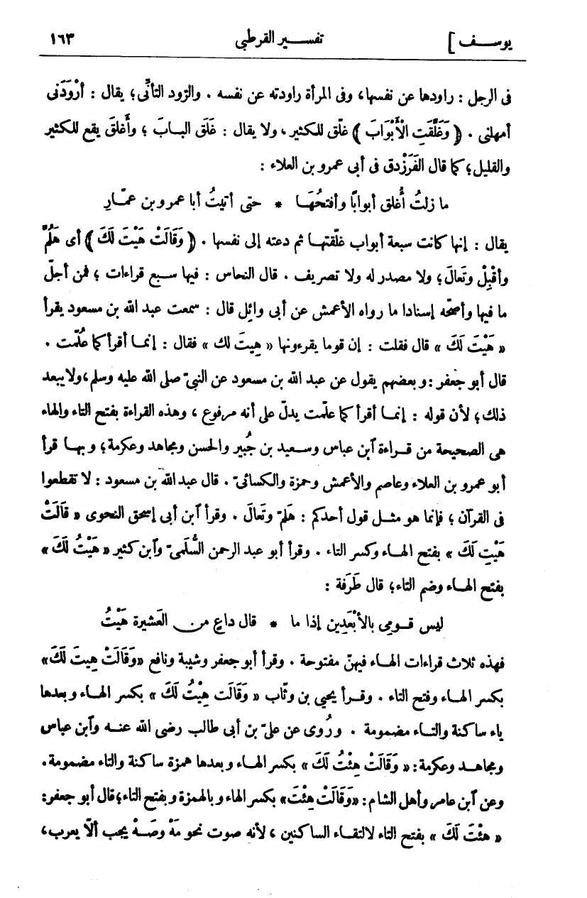 يُقَالُ: إِنَّهَا كَانَتْ سَبْعَةَ أَبْوَابٍ غَلَّقَتْهَا ثُمَّ دَعَتْهُ إِلَى نَفْسِهَا. (وَقالَتْ هَيْتَ لَكَ) أَيْ هَلُمَّ وَأَقْبِلْ وَتَعَالَ، وَلَا مَصْدَرَ لَهُ وَلَا تَصْرِيفَ. قَالَ النَّحَّاسُ: فِيهَا سَبْعُ قِرَاءَاتٍ، فَمِنْ أَجَلِّ مَا فِيهَا وَأَصَحِّهِ إِسْنَادًا مَا رَوَاهُ الْأَعْمَشُ عَنْ أَبِي وَائِلٍ قَالَ: سَمِعْتُ عَبْدَ اللَّهِ بْنَ مَسْعُودٍ يَقْرَأُ" هَيْتَ لَكَ" قَالَ فَقُلْتُ: إِنَّ قَوْمًا يَقْرَءُونَهَا" هِيتَ لَكَ" فَقَالَ: إِنَّمَا أَقْرَأُ كَمَا عُلِّمْتُ. قَالَ أَبُو جَعْفَرٍ: وَبَعْضُهُمْ يَقُولُ عَنْ عَبْدِ اللَّهِ بْنِ مَسْعُودٍ عَنِ النَّبِيِّ صَلَّى اللَّهُ عَلَيْهِ وَسَلَّمَ، وَلَا يَبْعُدُ ذَلِكَ، لِأَنَّ قَوْلَهُ: إِنَّمَا أَقْرَأُ كَمَا عُلِّمْتُ يَدُلُّ عَلَى أَنَّهُ مَرْفُوعٌ، وَهَذِهِ الْقِرَاءَةُ بِفَتْحِ التَّاءِ وَالْهَاءِ هِيَ الصَّحِيحَةُ مِنْ قِرَاءَةِ ابْنِ عَبَّاسٍ وَسَعِيدِ بْنِ جُبَيْرٍ وَالْحَسَنِ وَمُجَاهِدٍ وَعِكْرِمَةَ، وَبِهَا قَرَأَ أَبُو عَمْرِو بْنُ الْعَلَاءِ وَعَاصِمٌ وَالْأَعْمَشُ وَحَمْزَةُ والكسائي. قال عبد الله ابن مَسْعُودٍ: لَا تَقْطَعُوا فِي الْقُرْآنِ، فَإِنَّمَا هُوَ مِثْلُ، قَوْلِ أَحَدُكُمْ: هَلُمَّ وَتَعَالَ. وَقَرَأَ ابْنُ أَبِي إِسْحَاقَ النَّحْوِيُّ" قَالَتْ هَيْتِ لَكَ" بِفَتْحِ الْهَاءِ وَكَسْرِ التَّاءِ. وَقَرَأَ أَبُو عَبْدِ الرَّحْمَنِ السُّلَمِيُّ وَابْنُ كَثِيرٍ" هَيْتُ لَكَ" بِفَتْحِ الْهَاءِ وَضَمِّ التَّاءِ، قَالَ طَرَفَةُ:
