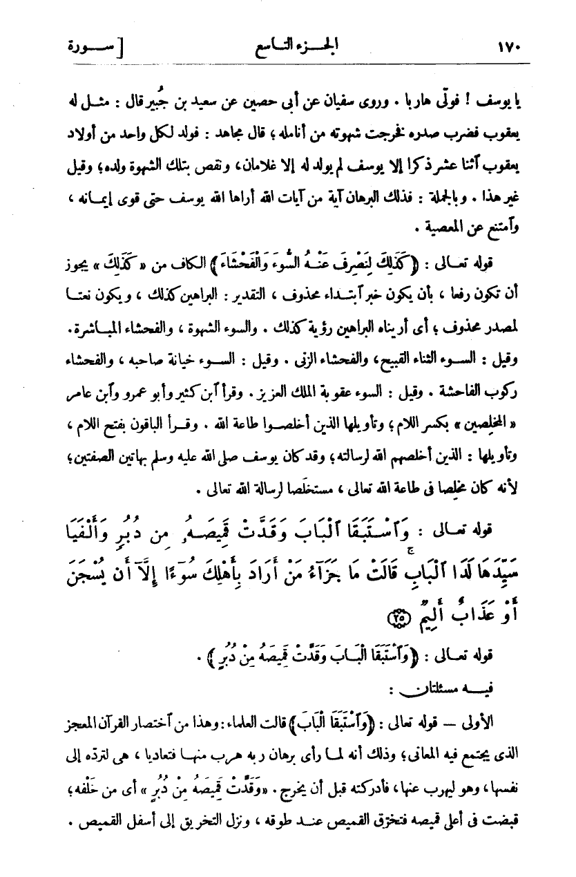 يَا يُوسُفَ! فَوَلَّى هَارِبًا. وَرَوَى سُفْيَانُ عَنْ أَبِي حُصَيْنٍ عَنْ سَعِيدِ بْنِ جُبَيْرٍ قَالَ: مُثِّلَ لَهُ يَعْقُوبُ فَضَرَبَ صَدْرَهُ فَخَرَجَتْ شَهْوَتُهُ مِنْ أَنَامِلِهِ، قَالَ مُجَاهِدٌ: فَوُلِدَ لِكُلٍ وَاحِدٍ مِنْ أَوْلَادِ يَعْقُوبَ اثْنَا عَشَرَ ذَكَرًا إِلَّا يُوسُفَ لَمْ يُولَدْ لَهُ إِلَّا غُلَامَانِ، وَنَقَصَ بِتِلْكَ الشَّهْوَةِ وَلَدُهُ، وَقِيلَ غَيْرُ هَذَا. وَبِالْجُمْلَةِ: فَذَلِكَ الْبُرْهَانُ آيَةٌ مِنْ آيَاتِ اللَّهِ أَرَاهَا اللَّهُ يُوسُفَ حَتَّى قَوِيَ إِيمَانُهُ، وَامْتَنَعَ عَنِ الْمَعْصِيَةِ. قَوْلُهُ تَعَالَى: (كَذلِكَ لِنَصْرِفَ عَنْهُ السُّوءَ وَالْفَحْشاءَ) الْكَافُ مِنْ" كَذلِكَ" يَجُوزُ أَنْ تَكُونَ رَفْعًا، بِأَنْ يَكُونَ خَبَرَ ابْتِدَاءٍ مَحْذُوفٍ، التَّقْدِيرُ.: الْبَرَاهِينُ كَذَلِكَ، وَيَكُونُ نَعْتًا لِمَصْدَرٍ مَحْذُوفٍ، أَيْ أَرَيْنَاهُ الْبَرَاهِينَ رُؤْيَةً كَذَلِكَ. وَالسُّوءُ الشَّهْوَةُ، وَالْفَحْشَاءُ المباشرة. وقيل: السوء الثناء القبيح، والفحشاء الزنى. وَقِيلَ: السُّوءُ خِيَانَةُ صَاحِبِهِ، وَالْفَحْشَاءُ رُكُوبُ الْفَاحِشَةِ. وقيل: السوء عقوبة الملك العزيز. وَقَرَأَ ابْنُ كَثِيرٍ وَأَبُو عَمْرٍو وَابْنُ عَامِرٍ" الْمُخْلِصِينَ" بِكَسْرِ اللَّامِ، وَتَأْوِيلُهَا الَّذِينَ أَخْلَصُوا طَاعَةَ اللَّهِ. وَقَرَأَ الْبَاقُونَ بِفَتْحِ اللَّامِ، وَتَأْوِيلُهَا: الَّذِينَ أَخْلَصَهُمُ اللَّهُ لِرِسَالَتِهِ، وَقَدْ كَانَ يُوسُفُ صَلَّى اللَّهُ عَلَيْهِ وَسَلَّمَ بِهَاتَيْنِ الصِّفَتَيْنِ، لِأَنَّهُ كَانَ مُخْلِصًا فِي طَاعَةِ اللَّهِ تَعَالَى، مُسْتَخْلَصًا لِرِسَالَةِ الله تعالى.