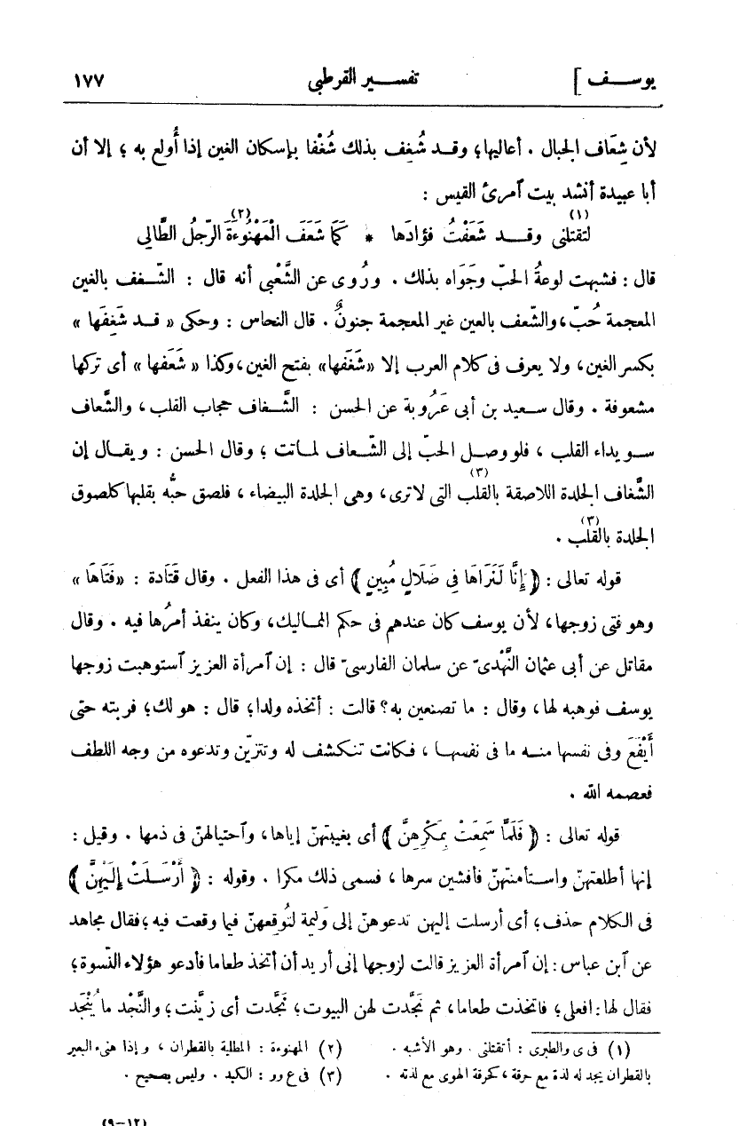 قَالَ: فَشُبِّهَتْ لَوْعَةُ الْحُبِّ وَجَوَاهُ بِذَلِكَ. وَرُوِيَ عَنِ الشَّعْبِيِّ أَنَّهُ قَالَ: الشَّغَفُ بالغا لمعجمة حُبٌّ، وَالشَّعَفُ بِالْعَيْنِ غَيْرِ الْمُعْجَمَةِ جُنُونٌ. قَالَ النَّحَّاسُ: وَحُكِيَ" قَدْ شَغِفَهَا" بِكَسْرِ الْغَيْنِ، وَلَا يُعْرَفُ فِي كَلَامِ الْعَرَبِ إِلَّا" شَغَفَها" بِفَتْحِ الْغَيْنِ، وَكَذَا" شَعَفَهَا" أَيْ تَرَكَهَا مَشْعُوفَةً. وَقَالَ سَعِيدُ بْنُ أَبِي عَرُوبَةَ عَنِ الْحَسَنِ: الشَّغَافُ حِجَابُ الْقَلْبِ، وَالشَّعَافُ سُوَيْدَاءُ الْقَلْبِ، فَلَوْ وَصَلَ الْحُبُّ إِلَى الشَّعَافِ لَمَاتَتْ، وَقَالَ الْحَسَنُ: وَيُقَالُ إِنَّ الشَّغَافَ الْجِلْدَةُ اللَّاصِقَةُ بِالْقَلْبِ «٣» الَّتِي لَا تُرَى، وَهِيَ الْجِلْدَةُ الْبَيْضَاءُ، فَلَصِقَ حُبُّهُ بِقَلْبِهَا كَلُصُوقِ الْجِلْدَةِ بِالْقَلْبِ «٤». قَوْلُهُ تَعَالَى: (إِنَّا لَنَراها فِي ضَلالٍ مُبِينٍ) أَيْ فِي هَذَا الْفِعْلِ. وَقَالَ قَتَادَةُ:" فَتاها" وَهُوَ فَتَى زَوْجِهَا، لِأَنَّ يُوسُفَ كَانَ عِنْدَهُمْ فِي حُكْمِ الْمَمَالِيكِ، وَكَانَ يَنْفُذُ أَمْرُهَا فِيهِ. وَقَالَ مُقَاتِلٌ عَنْ أَبِي عُثْمَانَ النَّهْدِيِّ عَنْ سَلْمَانَ الْفَارِسِيِّ قَالَ: إِنَّ امْرَأَةَ الْعَزِيزِ اسْتَوْهَبَتْ زَوْجَهَا يُوسُفَ فَوَهَبَهُ لَهَا، وَقَالَ: مَا تَصْنَعِينَ بِهِ؟ قَالَتْ أَتَّخِذُهُ وَلَدًا، قَالَ: هُوَ لَكِ، فَرَبَّتْهُ حَتَّى أَيْفَعَ وَفِي نَفْسِهَا مِنْهُ مَا فِي نَفْسِهَا، فَكَانَتْ تَنْكَشِفُ لَهُ وَتَتَزَيَّنُ وَتَدْعُوهُ مِنْ وَجْهِ اللُّطْفِ فَعَصَمَهُ اللَّهُ. قَوْلُهُ تَعَالَى: (فَلَمَّا سَمِعَتْ بِمَكْرِهِنَّ) أَيْ بِغِيبَتِهِنَّ إِيَّاهَا، وَاحْتِيَالِهِنَّ فِي ذَمِّهَا. وَقِيلَ: إِنَّهَا أَطْلَعَتْهُنَّ وَاسْتَأْمَنَتْهُنَّ فَأَفْشَيْنَ سِرَّهَا، فَسُمِّيَ ذَلِكَ مَكْرًا. وقوله: (أَرْسَلَتْ إِلَيْهِنَّ) فِي الْكَلَامِ حَذْفٌ، أَيْ أَرْسَلَتْ إِلَيْهِنَّ تَدْعُوهُنَّ إِلَى وَلِيمَةٍ لِتُوقِعَهُنَّ فِيمَا وَقَعَتْ فِيهِ، فَقَالَ مُجَاهِدٌ عَنِ ابْنِ عَبَّاسٍ: إِنَّ امْرَأَةَ الْعَزِيزِ قَالَتْ لِزَوْجِهَا إِنِّي أُرِيدُ أَنْ أَتَّخِذَ طَعَامًا فَأَدْعُوَ هَؤُلَاءِ النِّسْوَةَ، فَقَالَ لَهَا: افْعَلِي، فَاتَّخَذَتْ طَعَامًا، ثُمَّ نَجَّدَتْ لَهُنَّ الْبُيُوتَ، نجدت أي زينت، والنجد ما ينجد