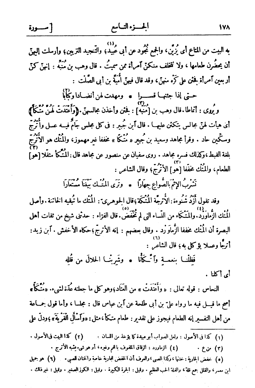 وَقَدْ تَقُولُ أَزْدُ شَنُوءَةَ: الْأُتْرُجَّةُ الْمُتْكَةُ، قَالَ الْجَوْهَرِيُّ: الْمُتْكُ مَا تُبْقِيهِ الْخَاتِنَةُ. وَأَصْلُ الْمُتْكِ الزُّمَاوَرْدُ «٦». وَالْمَتْكَاءُ مِنَ النِّسَاءِ الَّتِي لَمْ تُخْفَضْ «٧». قَالَ الْفَرَّاءُ: حَدَّثَنِي شَيْخٌ مِنْ ثِقَاتِ أَهْلِ الْبَصْرَةِ أَنَّ الْمُتْكَ مُخَفَّفًا الزُّمَاوَرْدُ. وَقَالَ بَعْضُهُمْ: إِنَّهُ الْأُتْرُجُّ، حَكَاهُ الْأَخْفَشُ. ابْنُ زَيْدٍ: أُتْرُجًّا وَعَسَلًا يُؤْكَلُ بِهِ، قال الشاعر «٨»:
