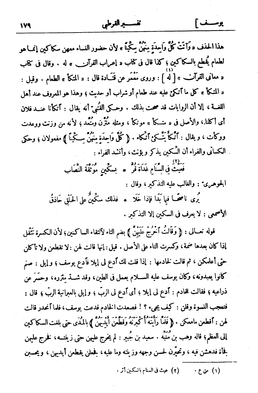 هَذَا الْحَذْفُ" وَآتَتْ كُلَّ واحِدَةٍ مِنْهُنَّ سِكِّيناً" لِأَنَّ حُضُورَ النِّسَاءِ مَعَهُنَّ سَكَاكِينُ إِنَّمَا هُوَ لِطَعَامٍ يُقَطَّعُ بِالسَّكَاكِينِ، كَذَا قَالَ فِي كِتَابِ" إِعْرَابِ الْقُرْآنِ" لَهُ. وَقَالَ فِي كِتَابِ" مَعَانِي الْقُرْآنِ" [لَهُ «١»]: وَرَوَى مَعْمَرٌ عَنْ قَتَادَةَ قَالَ:" الْمُتَّكَأُ" الطَّعَامُ. وَقِيلَ:" الْمُتَّكَأُ" كُلُّ مَا اتُّكِئَ عَلَيْهِ عِنْدَ طَعَامٍ أَوْ شَرَابٍ أَوْ حَدِيثٍ، وَهَذَا هُوَ الْمَعْرُوفُ عِنْدَ أَهْلِ اللُّغَةِ، إِلَّا أَنَّ الرِّوَايَاتِ قَدْ صَحَّتْ بِذَلِكَ. وَحَكَى الْقُتَبِيُّ أَنَّهُ يُقَالُ: اتَّكَأْنَا عِنْدَ فُلَانٍ أَيْ أَكَلْنَا، وَالْأَصْلُ فِي" مُتَّكَأً" مَوْتَكَأٌ، وَمِثْلُهُ مُتَّزِنٌ وَمُتَّعِدٌ، لأنه من وزنت ووعدت وكات، ويقال: اتكأ يتكئ اتكاء. (كُلَّ واحِدَةٍ مِنْهُنَّ سِكِّيناً) مَفْعُولَانِ، وَحَكَى الْكِسَائِيُّ وَالْفَرَّاءُ أَنَّ السِّكِّينَ يُذَكَّرُ وَيُؤَنَّثُ، وَأَنْشَدَ الْفَرَّاءُ: