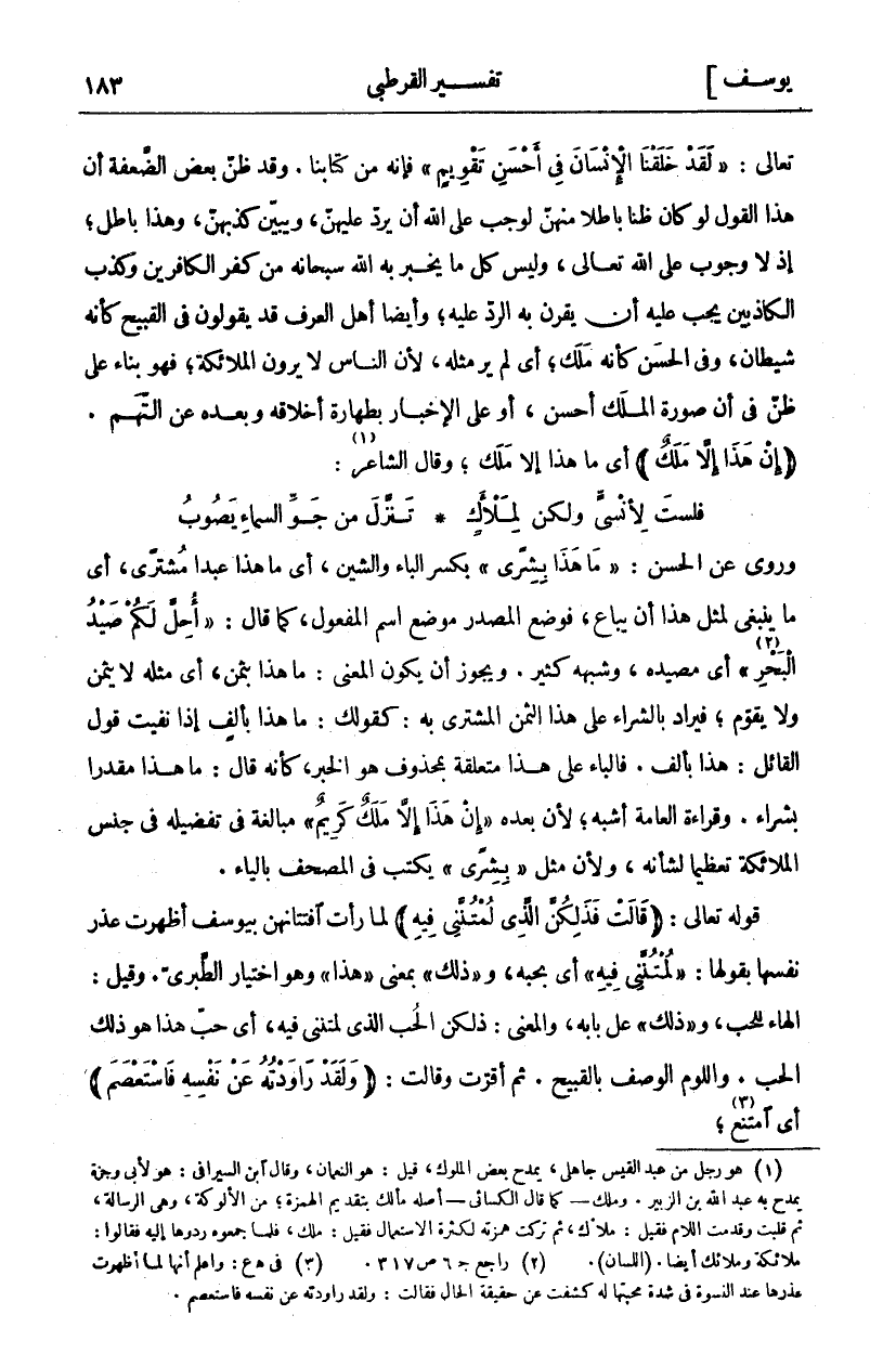 تَعَالَى:" لَقَدْ خَلَقْنَا الْإِنْسانَ فِي أَحْسَنِ تَقْوِيمٍ" [التين: ٤] فَإِنَّهُ مِنْ كِتَابِنَا. وَقَدْ ظَنَّ بَعْضُ الضَّعَفَةِ أَنَّ هَذَا الْقَوْلَ لَوْ كَانَ ظَنًّا بَاطِلًا مِنْهُنَّ لَوَجَبَ عَلَى اللَّهِ أَنْ يَرُدَّ عَلَيْهِنَّ، وَيُبَيِّنَ كَذِبَهُنَّ، وَهَذَا بَاطِلٌ، إِذْ لَا وُجُوبَ عَلَى اللَّهِ تَعَالَى، وَلَيْسَ كُلَّ مَا يُخْبِرُ بِهِ اللَّهُ سُبْحَانَهُ مِنْ كُفْرِ الْكَافِرِينَ وَكَذِبِ الْكَاذِبِينَ يَجِبُ عَلَيْهِ أَنْ يَقْرُنَ بِهِ الرَّدَّ عَلَيْهِ، وَأَيْضًا أَهْلُ الْعُرْفِ قَدْ يَقُولُونَ فِي الْقَبِيحِ كَأَنَّهُ شَيْطَانٌ، وَفِي الْحُسْنِ كَأَنَّهُ مَلَكٌ، أَيْ لَمْ يُرَ مِثْلُهُ، لِأَنَّ النَّاسَ لَا يَرَوْنَ الْمَلَائِكَةَ، فَهُوَ بِنَاءٌ عَلَى ظَنٍّ فِي أَنَّ صُورَةَ الْمَلَكِ أَحْسَنُ، أَوْ عَلَى الْإِخْبَارِ بِطَهَارَةِ أَخْلَاقِهِ وَبُعْدِهِ عَنِ التُّهَمِ. (إِنْ هَذَا إِلَّا مَلَكٌ) أَيْ مَا هَذَا إِلَّا مَلَكٌ، وَقَالَ الشَّاعِرُ «١»:
