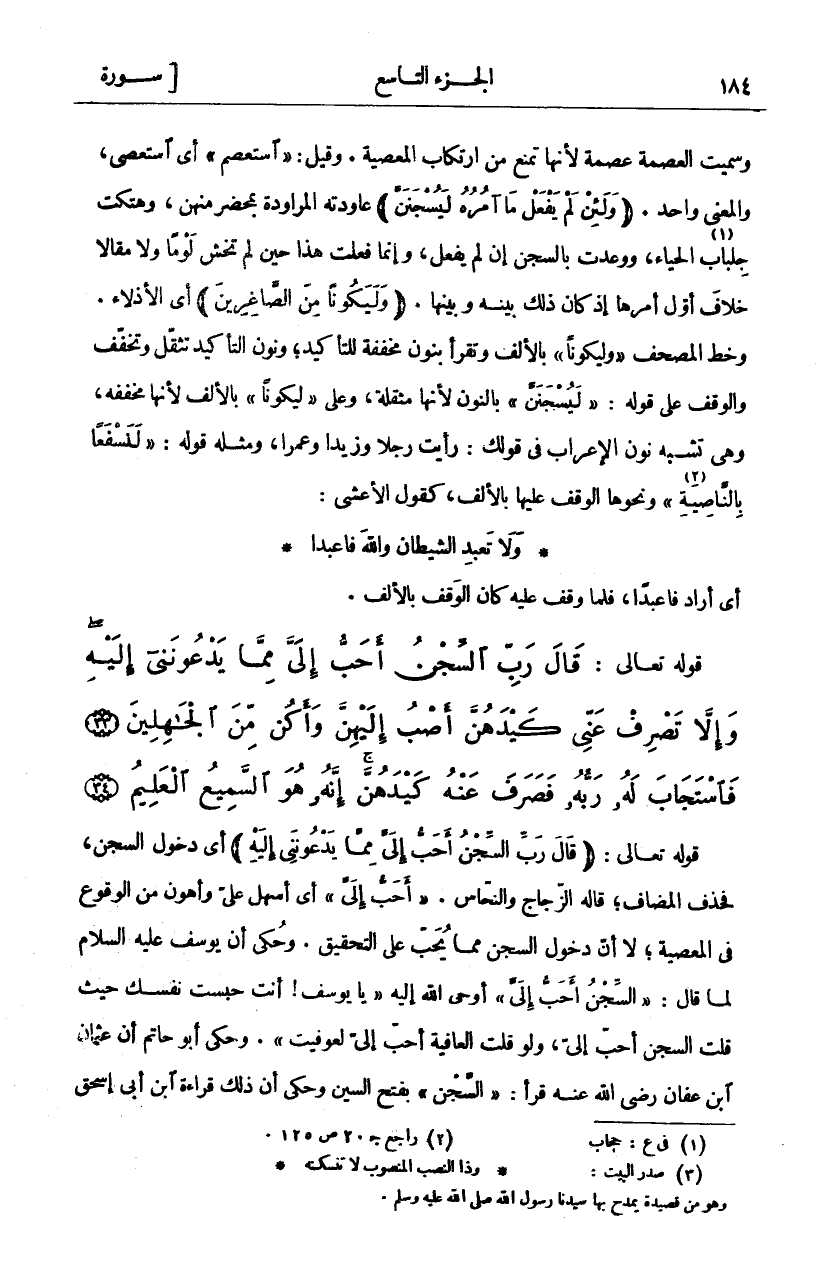 قالَ رَبِّ السِّجْنُ أَحَبُّ إِلَيَّ مِمَّا يَدْعُونَنِي إِلَيْهِ وَإِلاَّ تَصْرِفْ عَنِّي كَيْدَهُنَّ أَصْبُ إِلَيْهِنَّ وَأَكُنْ مِنَ الْجاهِلِينَ (٣٣) فَاسْتَجابَ لَهُ رَبُّهُ فَصَرَفَ عَنْهُ كَيْدَهُنَّ إِنَّهُ هُوَ السَّمِيعُ الْعَلِيمُ (٣٤)