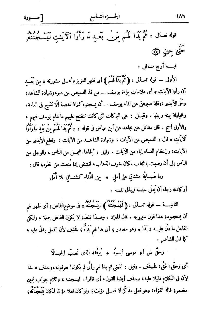 فِيهِ أَرْبَعُ مَسَائِلَ: الْأُولَى- قَوْلُهُ تَعَالَى: (ثُمَّ بَدا لَهُمْ) أَيْ ظهر للعزيز واهل مشورته" مِنْ بَعْدِ ما رَأَوُا الْآياتِ" أَيْ عَلَامَاتِ بَرَاءَةِ يُوسُفَ- مِنْ قَدِّ الْقَمِيصِ مِنْ دُبُرٍ، وَشَهَادَةِ الشَّاهِدِ، وَحَزِّ الْأَيْدِي، وَقِلَّةِ صَبْرِهِنَّ عَنْ لِقَاءِ يُوسُفَ- أَنْ يَسْجُنُوهُ كِتْمَانًا لِلْقِصَّةِ أَلَّا تَشِيعَ فِي الْعَامَّةِ، وَلِلْحَيْلُولَةِ بَيْنَهُ وَبَيْنَهَا. وَقِيلَ: هِيَ الْبَرَكَاتُ الَّتِي كَانَتْ تَنْفَتِحُ عَلَيْهِمْ مَا دَامَ يُوسُفُ فِيهِمْ، وَالْأَوَّلُ أَصَحُّ. قَالَ مُقَاتِلٌ عَنْ مُجَاهِدٍ عَنِ ابْنِ عَبَّاسٍ فِي قَوْلِ:" ثُمَّ بَدا لَهُمْ مِنْ بَعْدِ مَا رَأَوُا الْآياتِ" قَالَ: الْقَمِيصُ مِنَ الْآيَاتِ، وَشَهَادَةُ الشَّاهِدِ مِنَ الْآيَاتِ، وَقَطْعُ الْأَيْدِي مِنَ الْآيَاتِ، وَإِعْظَامُ النِّسَاءِ إِيَّاهُ مِنَ الْآيَاتِ. وَقِيلَ: أَلْجَأَهَا الْخَجَلُ مِنَ النَّاسِ، وَالْوَجَلُ مِنَ الْيَأْسِ إِلَى أَنْ رَضِيَتْ بِالْحِجَابِ مَكَانَ خَوْفِ الذَّهَابِ، لِتَشْتَفِيَ إِذَا مُنِعَتْ مِنْ نَظَرِهِ، قَالَ: