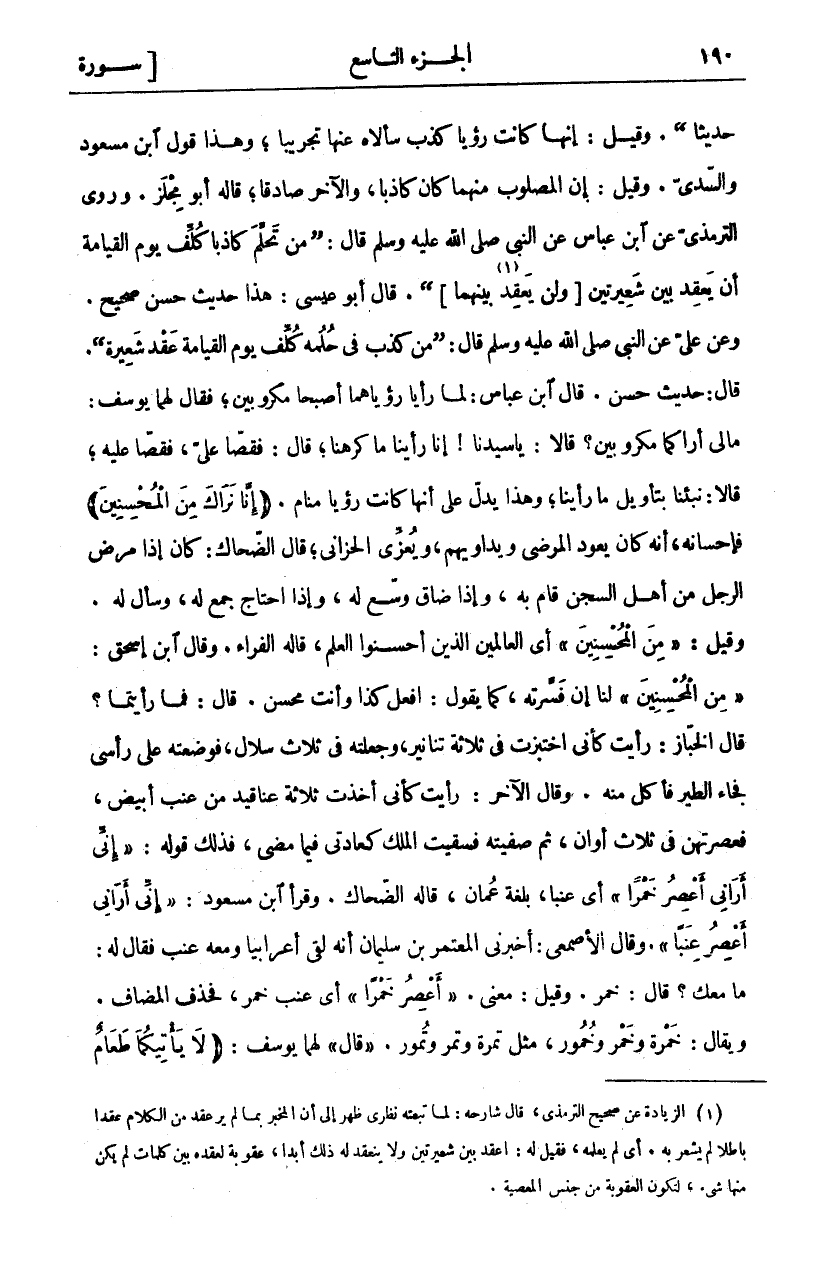 حَدِيثًا". وَقِيلَ: إِنَّهَا كَانَتْ رُؤْيَا كَذِبٍ سَأَلَاهُ عَنْهَا تَجْرِيبًا، وَهَذَا قَوْلُ ابْنِ مَسْعُودٍ وَالسُّدِّيِّ. وَقِيلَ: إِنَّ الْمَصْلُوبَ مِنْهُمَا كَانَ كَاذِبًا، وَالْآخَرُ صَادِقًا، قَالَهُ أَبُو مِجْلَزٍ. وَرَوَى التِّرْمِذِيُّ عَنِ ابْنِ عَبَّاسٍ عَنِ النَّبِيِّ صَلَّى اللَّهُ عَلَيْهِ وَسَلَّمَ: قَالَ:" مَنْ تَحَلَّمَ كَاذِبًا كُلِّفَ يَوْمَ الْقِيَامَةِ أَنْ يَعْقِدَ بَيْنَ شَعِيرَتَيْنِ [وَلَنْ يَعْقِدَ «١» بَيْنَهُمَا] ". قَالَ أَبُو عِيسَى: هَذَا حَدِيثٌ حَسَنٌ صَحِيحٌ. وَعَنْ عَلِيٍّ عَنِ النَّبِيِّ صَلَّى اللَّهُ عَلَيْهِ وَسَلَّمَ قَالَ:" مَنْ كَذَبَ فِي حُلُمِهِ كُلِّفَ يَوْمَ الْقِيَامَةِ عَقْدَ شَعِيرَةٍ". قَالَ: حَدِيثٌ حَسَنٌ. قَالَ ابْنُ عَبَّاسٍ: لَمَّا رَأَيَا رُؤْيَاهُمَا أصبحا مكروبين، فقال لهما يوسف: مالي أَرَاكُمَا مَكْرُوبَيْنِ؟ قَالَا: يَا سَيِّدَنَا! إِنَّا رَأَيْنَا مَا كَرِهْنَا، قَالَ: فَقُصَّا عَلَيَّ، فَقَصَّا عَلَيْهِ، قَالَا: نَبِّئْنَا بِتَأْوِيلِ مَا رَأَيْنَا، وَهَذَا يَدُلُّ عَلَى أَنَّهَا كَانَتْ رُؤْيَا مَنَامٍ. (إِنَّا نَراكَ مِنَ الْمُحْسِنِينَ) فَإِحْسَانُهُ، أَنَّهُ كَانَ يَعُودُ الْمَرْضَى وَيُدَاوِيهِمْ، وَيُعَزِّي الْحَزَانَى، قَالَ الضَّحَّاكُ: كَانَ إِذَا مَرِضَ الرَّجُلُ مِنْ أَهْلِ السِّجْنِ قَامَ بِهِ، وَإِذَا ضَاقَ وَسَّعَ لَهُ، وَإِذَا احْتَاجَ جَمَعَ لَهُ، وَسَأَلَ لَهُ. وَقِيلَ:" مِنَ الْمُحْسِنِينَ" أَيِ الْعَالِمِينَ الَّذِينَ أَحْسَنُوا الْعِلْمَ، قَالَهُ الْفَرَّاءُ. وَقَالَ ابْنُ إِسْحَاقَ:" مِنَ الْمُحْسِنِينَ" لَنَا إِنْ فَسَّرْتَهُ، كَمَا يَقُولُ: افْعَلْ كَذَا وَأَنْتَ مُحْسِنٌ. قَالَ: فَمَا رَأَيْتُمَا؟ قَالَ الْخَبَّازُ: رَأَيْتُ كَأَنِّي اخْتَبَزْتُ في ثلاث تَنَانِيرَ، وَجَعَلْتُهُ فِي ثَلَاثِ سِلَالٍ، فَوَضَعْتُهُ عَلَى رَأْسِي فَجَاءَ الطَّيْرُ فَأَكَلَ مِنْهُ. وَقَالَ الْآخَرُ: رأيت كأني أخذت عَنَاقِيدَ مِنْ عِنَبٍ أَبْيَضَ، فَعَصَرَتُهُنَّ فِي ثَلَاثِ أَوَانٍ، ثُمَّ صَفَّيْتُهُ فَسَقَيْتُ الْمَلِكَ كَعَادَتِي فِيمَا مَضَى، فَذَلِكَ قَوْلُهُ:" إِنِّي أَرانِي أَعْصِرُ خَمْراً" أَيْ عِنَبًا، بِلُغَةِ عُمَانَ، قَالَهُ الضَّحَّاكُ. وَقَرَأَ ابْنُ مَسْعُودٍ:" إِنِّي أَرَانِي أَعْصِرُ عِنَبًا". وَقَالَ الْأَصْمَعِيُّ: أَخْبَرَنِي الْمُعْتَمِرُ بْنُ سُلَيْمَانَ أَنَّهُ لَقِيَ أَعْرَابِيًّا وَمَعَهُ عِنَبٌ فَقَالَ لَهُ: مَا مَعَكَ؟ قَالَ: خَمْرٌ. وَقِيلَ: مَعْنَى." أَعْصِرُ خَمْراً" أَيْ عنب، فَحَذَفَ الْمُضَافَ. وَيُقَالُ خَمْرَةٌ وَخَمْرٌ وَخُمُورٌ، مِثْلَ تَمْرَةٍ وَتَمْرٍ وَتُمُورٍ." قالَ" لَهُمَا يُوسُفُ: (لَا يَأْتِيكُما طَعامٌ تُرْزَقانِهِ)