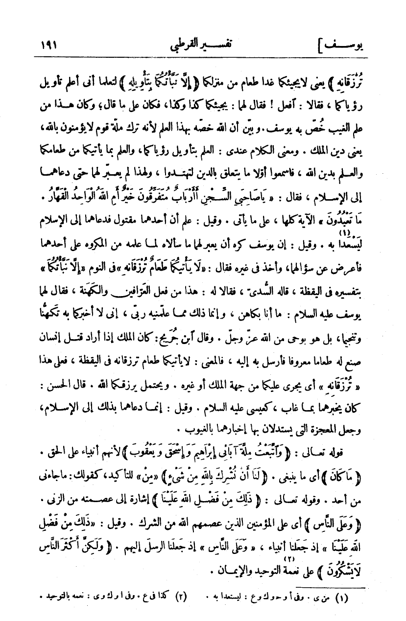 يَعْنِي لَا يَجِيئُكُمَا غَدًا طَعَامٌ مِنْ مَنْزِلِكُمَا (إِلَّا نَبَّأْتُكُما بِتَأْوِيلِهِ) لِتَعْلَمَا أَنِّي أَعْلَمُ تَأْوِيلَ رُؤْيَاكُمَا، فَقَالَا: افْعَلْ! فَقَالَ لَهُمَا: يَجِيئُكُمَا كَذَا وكذا، فكان على ما قال، وَكَانَ هَذَا مِنْ عِلْمِ الْغَيْبِ خُصَّ بِهِ يُوسُفَ. وَبَيَّنَ أَنَّ اللَّهَ خَصَّهُ بِهَذَا الْعِلْمِ لِأَنَّهُ تَرَكَ مِلَّةَ قَوْمٍ لَا يُؤْمِنُونَ بِاللَّهِ، يَعْنِي دِينَ الْمَلِكِ. وَمَعْنَى الْكَلَامِ عِنْدِي: الْعِلْمُ بِتَأْوِيلِ رُؤْيَاكُمَا، وَالْعِلْمُ بِمَا يَأْتِيكُمَا مِنْ طَعَامِكُمَا وَالْعِلْمُ بِدِينِ اللَّهِ، فَاسْمَعُوا أَوَّلًا مَا يَتَعَلَّقُ بِالدِّينِ لِتَهْتَدُوا، وَلِهَذَا لَمْ يُعَبِّرْ لَهُمَا حَتَّى دَعَاهُمَا إِلَى الْإِسْلَامِ، فَقَالَ:" يَا صاحِبَيِ السِّجْنِ أَأَرْبابٌ مُتَفَرِّقُونَ خَيْرٌ أَمِ اللَّهُ الْواحِدُ الْقَهَّارُ. ما تَعْبُدُونَ" [يوسف: ٤٠ - ٣٩] الْآيَةَ كُلَّهَا، عَلَى مَا يَأْتِي. وَقِيلَ: عَلِمَ أَنَّ أَحَدَهُمَا مَقْتُولٌ فَدَعَاهُمَا إِلَى الْإِسْلَامِ لِيَسْعَدَا «١» بِهِ. وَقِيلَ: إِنَّ يُوسُفَ كَرِهَ أَنْ يَعْبُرَ لَهُمَا مَا سَأَلَاهُ لِمَا عَلِمَهُ مِنَ الْمَكْرُوهِ عَلَى أَحَدِهِمَا فَأَعْرَضَ عَنْ سُؤَالِهِمَا، وَأَخَذَ فِي غَيْرِهِ فَقَالَ:" لَا يَأْتِيكُما طَعامٌ تُرْزَقانِهِ" فِي النَّوْمِ" إِلَّا نَبَّأْتُكُما" بِتَفْسِيرِهِ فِي الْيَقَظَةِ، قَالَهُ السُّدِّيُّ، فَقَالَا لَهُ: هَذَا مِنْ فِعْلِ الْعَرَّافِينَ وَالْكَهَنَةِ، فَقَالَ لَهُمَا يُوسُفُ عَلَيْهِ السَّلَامُ: مَا أَنَا بِكَاهِنٍ، وَإِنَّمَا ذَلِكَ مِمَّا عَلَّمَنِيهِ رَبِّي، إِنِّي لَا أُخْبِرُكُمَا بِهِ تَكَهُّنًا وَتَنْجِيمًا، بَلْ هُوَ بِوَحْيٍ مِنَ اللَّهِ عَزَّ وَجَلَّ. وَقَالَ ابْنُ جُرَيْجٍ: كَانَ الْمَلِكُ إِذَا أَرَادَ قَتْلَ إِنْسَانٍ صَنَعَ لَهُ طَعَامًا مَعْرُوفًا فَأَرْسَلَ بِهِ إِلَيْهِ، فَالْمَعْنَى: لَا يَأْتِيكُمَا طَعَامٌ تُرْزَقَانِهِ فِي الْيَقَظَةِ، فَعَلَى هَذَا" تُرْزَقانِهِ" أَيْ يَجْرِي عَلَيْكُمَا مِنْ جِهَةِ الْمَلِكِ أَوْ غَيْرِهِ. وَيَحْتَمِلُ يَرْزُقُكُمَا اللَّهُ. قَالَ الْحَسَنُ: كَانَ يُخْبِرُهُمَا بِمَا غَابَ، كَعِيسَى عَلَيْهِ السَّلَامُ. وَقِيلَ: إِنَّمَا دَعَاهُمَا بِذَلِكَ إِلَى الْإِسْلَامِ، وَجَعَلَ الْمُعْجِزَةَ الَّتِي يَسْتَدِلَّانِ بِهَا إِخْبَارُهُمَا بِالْغُيُوبِ. قَوْلُهُ تَعَالَى: (وَاتَّبَعْتُ مِلَّةَ آبائِي إِبْراهِيمَ وَإِسْحاقَ وَيَعْقُوبَ) لِأَنَّهُمْ أَنْبِيَاءُ عَلَى الْحَقِّ. (ما كانَ) أي ما ينبغي لنا. (لَنا أَنْ نُشْرِكَ بِاللَّهِ مِنْ شَيْءٍ) " مِنْ" للتأكيد، كقولك: ما جاءني من أحد. وقوله تعالى: (ذلِكَ مِنْ فَضْلِ اللَّهِ عَلَيْنا) إِشَارَةٌ إِلَى عصمته من الزنى. (وَعَلَى النَّاسِ) أَيْ عَلَى الْمُؤْمِنِينَ الَّذِينَ عَصَمَهُمُ اللَّهُ مِنَ الشِّرْكِ. وَقِيلَ:" ذلِكَ مِنْ فَضْلِ اللَّهِ عَلَيْنا" إِذْ جَعَلْنَا أَنْبِيَاءَ،" وَعَلَى النَّاسِ" إِذْ جَعَلْنَا الرُّسُلَ إِلَيْهِمْ. (وَلكِنَّ أَكْثَرَ النَّاسِ لا يَشْكُرُونَ) على نعمة «٢» التوحيد والإيمان.