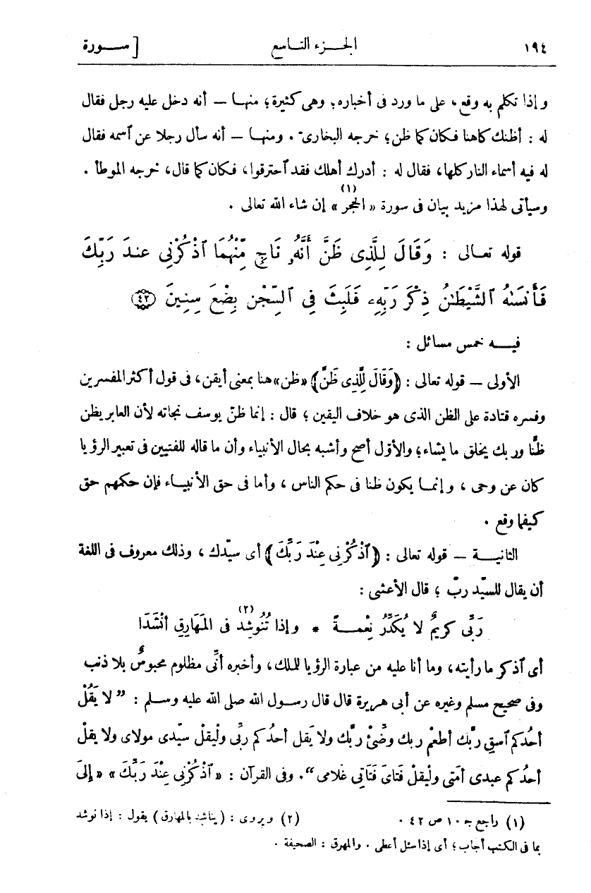 فِيهِ خَمْسُ مَسَائِلَ: الْأُولَى- قَوْلُهُ تَعَالَى: (وَقالَ لِلَّذِي ظَنَّ) "" ظَنَّ" هُنَا بِمَعْنَى أَيْقَنَ، فِي قَوْلِ أَكْثَرِ الْمُفَسِّرِينَ وَفَسَّرَهُ قَتَادَةُ عَلَى الظَّنِّ الَّذِي هُوَ خِلَافُ الْيَقِينِ، قَالَ: إِنَّمَا ظَنَّ يُوسُفُ نَجَاتَهُ لِأَنَّ الْعَابِرَ يَظُنُّ ظَنَّا وَرَبُّكَ يَخْلُقُ مَا يَشَاءُ، وَالْأَوَّلُ أَصَحُّ وَأَشْبَهُ بِحَالِ الْأَنْبِيَاءِ وَأَنَّ مَا قَالَهُ لِلْفَتَيَيْنِ فِي تَعْبِيرِ الرُّؤْيَا كَانَ عَنْ وَحْيٍ، وَإِنَّمَا يَكُونُ ظَنًّا فِي حُكْمِ النَّاسِ، وَأَمَّا فِي حَقِّ الْأَنْبِيَاءِ فَإِنَّ حُكْمَهُمْ حَقٌّ كَيْفَمَا وَقَعَ. الثَّانِيَةُ- قَوْلُهُ تَعَالَى:" (اذْكُرْنِي عِنْدَ رَبِّكَ) " أَيْ سَيِّدِكَ، وَذَلِكَ مَعْرُوفٌ فِي اللُّغَةِ أَنْ يُقَالَ لِلسَّيِّدِ رَبٌّ، قَالَ الْأَعْشَى: