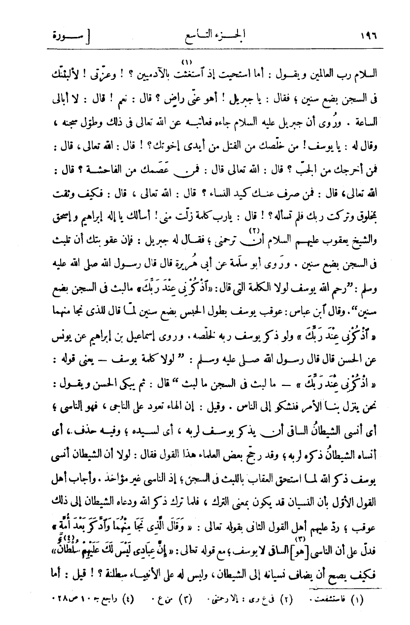 السَّلَامَ رَبُّ الْعَالَمِينَ وَيَقُولُ: أَمَا اسْتَحَيْتَ إِذِ اسْتَغَثْتَ «١» بِالْآدَمِيِّينَ؟! وَعِزَّتِي! لَأُلْبِثَنَّكَ فِي السِّجْنِ بِضْعَ سِنِينَ، فَقَالَ: يَا جِبْرِيلُ! أَهُوَ عَنِّي رَاضٍ؟ قَالَ: نَعَمْ! قَالَ: لَا أُبَالِي السَّاعَةَ. وَرُوِيَ أَنَّ جِبْرِيلَ عَلَيْهِ السَّلَامُ جَاءَهُ فَعَاتَبَهُ عَنِ اللَّهِ تَعَالَى فِي ذَلِكَ وَطُولِ سِجْنِهِ، وَقَالَ لَهُ: يَا يُوسُفُ! مَنْ خَلَّصَكَ مِنَ الْقَتْلِ مِنْ أَيْدِي إِخْوَتِكَ؟! قَالَ: اللَّهُ تَعَالَى، قَالَ: فَمَنْ أَخْرَجَكَ مِنَ الْجُبِّ؟ قَالَ: اللَّهُ تَعَالَى قَالَ: فَمَنْ عَصَمَكَ مِنَ الْفَاحِشَةِ؟ قَالَ: اللَّهُ تَعَالَى، قَالَ: فَمَنْ صَرَفَ عَنْكَ كَيْدَ النِّسَاءِ؟ قَالَ: اللَّهُ تَعَالَى، قَالَ: فَكَيْفَ وَثِقْتَ بِمَخْلُوقٍ وَتَرَكْتَ رَبَّكَ فَلَمْ تَسْأَلْهُ؟! قَالَ: يَا رَبِّ كَلِمَةٌ زَلَّتْ مِنِّي! أَسْأَلُكَ يَا إِلَهَ إِبْرَاهِيمَ وَإِسْحَاقَ وَالشَّيْخِ يَعْقُوبَ عَلَيْهِمُ السَّلَامُ أَنْ «٢» تَرْحَمَنِي، فَقَالَ لَهُ جِبْرِيلُ: فَإِنَّ عُقُوبَتَكَ أَنْ تَلْبَثَ فِي السِّجْنِ بِضْعَ سِنِينَ. وَرَوَى أَبُو سَلَمَةَ عَنْ أَبِي هُرَيْرَةَ قَالَ قَالَ رَسُولُ اللَّهِ صَلَّى اللَّهُ عَلَيْهِ وَسَلَّمَ:" رَحِمَ اللَّهُ يُوسُفَ لَوْلَا الْكَلِمَةُ الَّتِي قَالَ:" اذْكُرْنِي عِنْدَ رَبِّكَ" مَا لَبِثَ فِي السِّجْنِ بِضْعَ سِنِينَ". وَقَالَ ابْنُ عَبَّاسٍ: عُوقِبَ يُوسُفُ بِطُولِ الْحَبْسِ بِضْعَ سِنِينَ لَمَّا قَالَ لِلَّذِي نَجَا مِنْهُمَا" اذْكُرْنِي عِنْدَ رَبِّكَ" وَلَوْ ذَكَرَ يُوسُفُ رَبَّهُ لَخَلَّصَهُ. وَرَوَى إِسْمَاعِيلُ بْنُ إِبْرَاهِيمَ عَنْ يُونُسَ عَنِ الْحَسَنِ قَالَ قَالَ رَسُولُ اللَّهِ صَلَّى اللَّهُ عَلَيْهِ وَسَلَّمَ:" لَوْلَا كَلِمَةُ يُوسُفَ- يَعْنِي قَوْلَهُ:" اذْكُرْنِي عِنْدَ رَبِّكَ"- مَا لَبِثَ فِي السِّجْنِ مَا لَبِثَ" قَالَ: ثُمَّ يَبْكِي الْحَسَنُ وَيَقُولُ: نَحْنُ يَنْزِلُ بِنَا الْأَمْرُ فَنَشْكُو إِلَى النَّاسِ. وَقِيلَ: إِنَّ الْهَاءَ تَعُودُ عَلَى النَّاجِي، فَهُوَ النَّاسِي، أَيْ أَنْسَى الشَّيْطَانُ السَّاقِيَ أَنْ يَذْكُرَ يُوسُفَ لِرَبِّهِ، أَيْ لِسَيِّدِهِ، وَفِيهِ حَذْفٌ، أَيْ أَنْسَاهُ الشَّيْطَانُ ذِكْرَهُ لِرَبِّهِ، وَقَدْ رَجَّحَ بَعْضُ الْعُلَمَاءِ هَذَا الْقَوْلَ فَقَالَ: لَوْلَا أَنَّ الشَّيْطَانَ أَنْسَى يُوسُفَ ذِكْرَ اللَّهِ لَمَا اسْتَحَقَّ الْعِقَابَ بِاللَّبْثِ فِي السِّجْنِ، إِذِ النَّاسِي غَيْرُ مُؤَاخَذٍ. وَأَجَابَ أَهْلُ الْقَوْلِ الْأَوَّلِ بِأَنَّ النِّسْيَانَ قَدْ يَكُونُ بِمَعْنَى التَّرْكِ، فَلَمَّا تَرَكَ ذِكْرَ اللَّهِ وَدَعَاهُ الشَّيْطَانُ إِلَى ذَلِكَ عُوقِبَ، رَدَّ عَلَيْهِمْ أَهْلُ الْقَوْلِ الثَّانِي بِقَوْلِهِ تَعَالَى:" وَقالَ الَّذِي نَجا مِنْهُما وَادَّكَرَ بَعْدَ أُمَّةٍ" [يوسف: ٤٥] فَدَلَّ عَلَى أَنَّ النَّاسِيَ [هُوَ «٣»] السَّاقِي لَا يُوسُفُ، مَعَ قَوْلِهِ تَعَالَى:" إِنَّ عِبادِي لَيْسَ لَكَ عَلَيْهِمْ سُلْطانٌ" «٤» [الحجر: ٤٢] فَكَيْفَ يَصِحُّ أَنْ يُضَافَ نِسْيَانُهُ إِلَى الشَّيْطَانِ، وَلَيْسَ لَهُ عَلَى الْأَنْبِيَاءِ سَلْطَنَةٌ؟! قِيلَ: أَمَّا