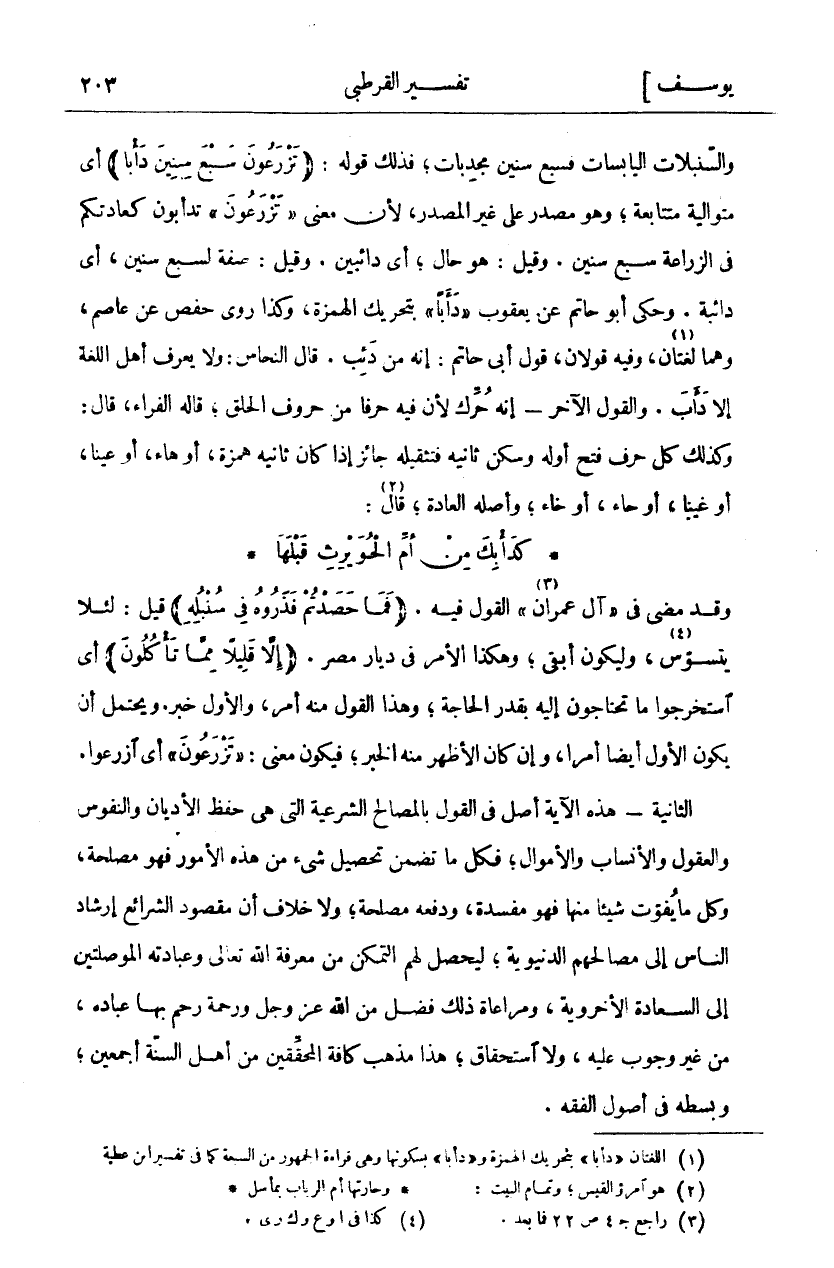 وَقَدْ مَضَى فِي" آلِ عِمْرَانَ" «٣» الْقَوْلُ فِيهِ. (فَما حَصَدْتُمْ فَذَرُوهُ فِي سُنْبُلِهِ) قِيلَ: لِئَلَّا يَتَسَوَّسُ «٤»، وَلِيَكُونَ أَبْقَى، وَهَكَذَا الْأَمْرُ فِي دِيَارِ مِصْرَ. (إِلَّا قَلِيلًا مِمَّا تَأْكُلُونَ) أَيِ اسْتَخْرِجُوا مَا تَحْتَاجُونَ إِلَيْهِ بِقَدْرِ الْحَاجَةِ، وَهَذَا الْقَوْلُ مِنْهُ أَمْرٌ، وَالْأَوَّلُ خَبَرٌ. وَيَحْتَمِلُ أَنْ يَكُونَ الْأَوَّلُ أَيْضًا أَمْرًا، وَإِنْ كَانَ الْأَظْهَرُ مِنْهُ الْخَبَرَ، فَيَكُونُ مَعْنَى:" تَزْرَعُونَ" أَيِ ازْرَعُوا. الثَّانِيَةُ- هَذِهِ الْآيَةُ أَصْلٌ فِي الْقَوْلِ بِالْمَصَالِحِ الشَّرْعِيَّةِ الَّتِي هِيَ حِفْظُ الْأَدْيَانِ وَالنُّفُوسِ وَالْعُقُولِ وَالْأَنْسَابِ وَالْأَمْوَالِ، فَكُلُّ مَا تَضَمَّنَ تَحْصِيلَ شي مِنْ هَذِهِ الْأُمُورِ فَهُوَ مَصْلَحَةٌ، وَكُلُّ مَا يُفَوِّتُ شَيْئًا مِنْهَا فَهُوَ مَفْسَدَةٌ، وَدَفْعُهُ مَصْلَحَةٌ، وَلَا خِلَافَ أَنَّ مَقْصُودَ الشَّرَائِعِ إِرْشَادُ النَّاسِ إِلَى مَصَالِحِهِمُ الدُّنْيَوِيَّةِ، لِيَحْصُلَ لَهُمُ التَّمَكُّنُ مِنْ مَعْرِفَةِ اللَّهِ تَعَالَى وَعِبَادَتِهِ الْمُوَصِّلَتَيْنِ إِلَى السَّعَادَةِ الْأُخْرَوِيَّةِ، وَمُرَاعَاةُ ذَلِكَ فَضْلٌ مِنَ اللَّهِ عَزَّ وَجَلَّ وَرَحْمَةٌ رَحِمَ بِهَا عِبَادَهُ، مِنْ غَيْرِ وُجُوبٍ عَلَيْهِ، وَلَا اسْتِحْقَاقٍ، هَذَا مَذْهَبُ كَافَّةِ الْمُحَقِّقِينَ مِنْ أَهْلِ السُّنَّةِ أَجْمَعِينَ، وَبَسْطُهُ فِي أصول الفقه.