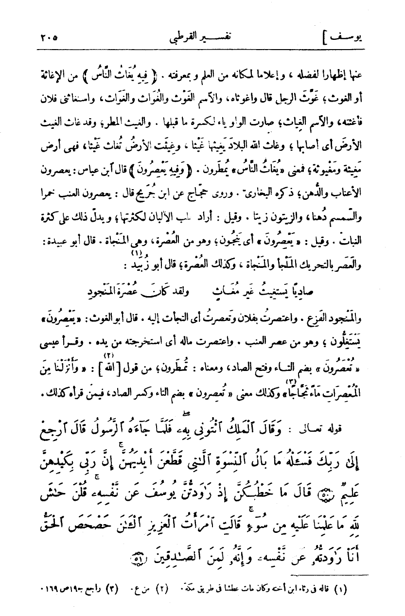 عَنْهَا إِظْهَارًا لِفَضْلِهِ، وَإِعْلَامًا لِمَكَانِهِ مِنَ الْعِلْمِ وَبِمَعْرِفَتِهِ. (فِيهِ يُغاثُ النَّاسُ) مِنَ الْإِغَاثَةِ أَوِ الغوث، غوث الرجل فال وا غوثاه، وَالِاسْمُ الْغَوْثُ وَالْغُوَاثُ وَالْغَوَاثُ، وَاسْتَغَاثَنِي فُلَانٌ فَأَغَثْتُهُ، وَالِاسْمُ الْغِيَاثُ، صَارَتِ الْوَاوُ يَاءً لِكَسْرَةِ مَا قَبْلَهَا. وَالْغَيْثُ الْمَطَرُ، وَقَدْ غَاثَ الْغَيْثُ الْأَرْضَ أَيْ أَصَابَهَا، وَغَاثَ اللَّهُ الْبِلَادَ يَغِيثُهَا غَيْثًا، وَغِيثَتِ الْأَرْضُ تُغَاثُ غَيْثًا، فَهِيَ أَرْضٌ مَغِيثَةٌ وَمَغْيُوثَةٌ، فَمَعْنَى" يُغاثُ النَّاسُ" يُمْطَرُونَ. (وَفِيهِ يَعْصِرُونَ) قَالَ ابْنُ عَبَّاسٍ: يَعْصِرُونَ الْأَعْنَابَ وَالدُّهْنَ، ذَكَرَهُ البخاري. وروى حجاج عن ابن جريح قَالَ: يَعْصِرُونَ الْعِنَبَ خَمْرًا وَالسِّمْسِمَ دُهْنًا، وَالزَّيْتُونَ زَيْتًا. وَقِيلَ: أَرَادَ حَلْبَ الْأَلْبَانِ لِكَثْرَتِهَا، وَيَدُلُّ ذَلِكَ عَلَى كَثْرَةِ النَّبَاتِ. وَقِيلَ:" يَعْصِرُونَ" أَيْ يَنْجُونَ، وَهُوَ مِنَ الْعُصْرَةِ، وَهِيَ الْمَنْجَاةُ. قَالَ أَبُو عُبَيْدَةَ: وَالْعَصَرُ بِالتَّحْرِيكِ الْمَلْجَأُ وَالْمَنْجَاةُ، وَكَذَلِكَ الْعُصْرَةُ، قَالَ أَبُو زُبَيْدٍ «١»: