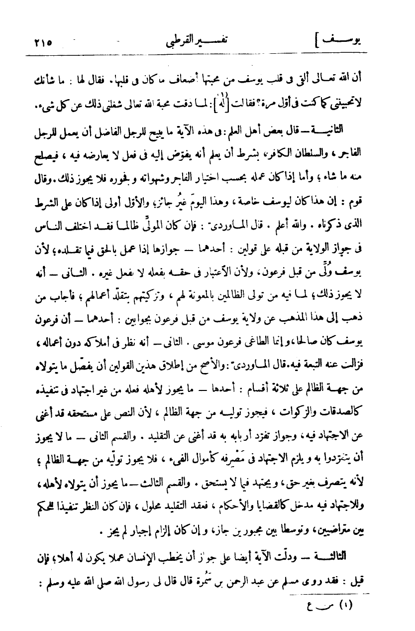 أَنَّ اللَّهَ تَعَالَى أَلْقَى فِي قَلْبِ يُوسُفَ مِنْ مَحَبَّتِهَا أَضْعَافَ مَا كَانَ فِي قَلْبِهَا، فَقَالَ لَهَا: مَا شَأْنُكِ لَا تُحِبِّينَنِي كَمَا كُنْتِ فِي أَوَّلِ مَرَّةٍ؟ فَقَالَتْ [لَهُ] «١»: لَمَّا ذُقْتُ مَحَبَّةَ اللَّهِ تَعَالَى شَغَلَنِي ذَلِكَ عَنْ كل شي. الثَّانِيَةُ- قَالَ بَعْضُ أَهْلِ الْعِلْمِ: فِي هَذِهِ الْآيَةِ مَا يُبِيحُ لِلرَّجُلِ الْفَاضِلِ أَنْ يَعْمَلَ لِلرَّجُلِ الْفَاجِرِ، وَالسُّلْطَانِ الْكَافِرِ، بِشَرْطِ أَنْ يَعْلَمَ أَنَّهُ يُفَوِّضُ إِلَيْهِ فِي فِعْلٍ لَا يُعَارِضُهُ فِيهِ، فَيُصْلِحُ مِنْهُ مَا شَاءَ، وَأَمَّا إِذَا كَانَ عَمَلُهُ بِحَسَبِ اخْتِيَارِ الْفَاجِرِ وَشَهَوَاتِهِ وَفُجُورِهِ فَلَا يَجُوزُ ذَلِكَ. وَقَالَ قَوْمٌ: إِنَّ هَذَا كَانَ لِيُوسُفَ خَاصَّةً، وَهَذَا الْيَوْمُ غَيْرُ جَائِزٍ، وَالْأَوَّلُ أَوْلَى إِذَا كَانَ عَلَى الشَّرْطِ الَّذِي ذَكَرْنَاهُ. وَاللَّهُ أَعْلَمُ. قَالَ الْمَاوَرْدِيُّ: فَإِنْ كَانَ الْمُوَلِّي ظَالِمًا فَقَدِ اخْتَلَفَ النَّاسُ فِي جَوَازِ الْوِلَايَةِ مِنْ قِبَلِهِ عَلَى قَوْلَيْنِ: أَحَدُهُمَا- جَوَازُهَا إِذَا عَمِلَ بِالْحَقِّ فِيمَا تَقَلَّدَهُ، لِأَنَّ يُوسُفَ وُلِّيَ مِنْ قِبَلِ فِرْعَوْنَ، وَلِأَنَّ الِاعْتِبَارَ فِي حَقِّهِ بِفِعْلِهِ لَا بِفِعْلِ غَيْرِهِ. الثَّانِي- أَنَّهُ لَا يَجُوزُ ذَلِكَ، لِمَا فِيهِ مِنْ تَوَلِّي الظَّالِمِينَ بِالْمَعُونَةِ لَهُمْ، وَتَزْكِيَتِهِمْ بِتَقَلُّدِ أَعْمَالِهِمْ، فَأَجَابَ مَنْ ذَهَبَ إِلَى هَذَا الْمَذْهَبِ عَنْ وِلَايَةِ يُوسُفَ مِنْ قِبَلِ فِرْعَوْنَ بِجَوَابَيْنِ: أَحَدُهُمَا- أَنَّ فِرْعَوْنَ يُوسُفَ كَانَ صَالِحًا، وَإِنَّمَا الطَّاغِي فِرْعَوْنُ مُوسَى. الثَّانِي- أَنَّهُ نَظَرَ فِي أَمْلَاكِهِ دُونَ أَعْمَالِهِ، فَزَالَتْ عَنْهُ التَّبِعَةُ فِيهِ. قَالَ الْمَاوَرْدِيُّ: وَالْأَصَحُّ مِنْ إِطْلَاقِ هَذَيْنَ الْقَوْلَيْنِ أَنْ يُفَصَّلَ مَا يَتَوَلَّاهُ مِنْ جِهَةِ الظَّالِمِ عَلَى ثَلَاثَةِ أَقْسَامٍ: أَحَدُهَا- مَا يَجُوزُ لِأَهْلِهِ فِعْلُهُ مِنْ غَيْرِ اجْتِهَادٍ فِي تَنْفِيذِهِ كَالصَّدَقَاتِ وَالزَّكَوَاتِ، فَيَجُوزُ تَوَلِّيهِ مِنْ جِهَةِ الظَّالِمِ، لِأَنَّ النَّصَّ عَلَى مُسْتَحِقِّهِ قَدْ أَغْنَى عَنِ الِاجْتِهَادِ فِيهِ، وَجَوَازُ تَفَرُّدِ أَرْبَابِهِ بِهِ قَدْ أَغْنَى عَنِ التَّقْلِيدِ. وَالْقِسْمُ الثَّانِي- مَا لَا يَجُوزُ أَنْ يَتَفَرَّدُوا بِهِ وَيَلْزَمُ الِاجْتِهَادُ فِي مَصْرِفِهِ كَأَمْوَالِ الْفَيْءِ، فَلَا يَجُوزُ تَوَلِّيهِ مِنْ جِهَةِ الظَّالِمِ، لِأَنَّهُ يَتَصَرَّفُ بِغَيْرِ حَقٍّ، وَيَجْتَهِدُ فِيمَا لَا يَسْتَحِقُّ. وَالْقِسْمُ الثَّالِثُ- مَا يَجُوزُ أَنْ يَتَوَلَّاهُ لِأَهْلِهِ، وَلِلِاجْتِهَادِ فِيهِ مَدْخَلٌ كَالْقَضَايَا وَالْأَحْكَامِ، فَعَقْدُ التَّقْلِيدِ مَحْلُولٌ، فَإِنْ كَانَ النَّظَرُ تَنْفِيذًا لِلْحُكْمِ بَيْنَ مُتَرَاضِيَيْنِ، وَتَوَسُّطًا بَيْنَ مَجْبُورَيْنِ جَازَ، وَإِنْ كَانَ إِلْزَامُ إِجْبَارٍ لَمْ يَجُزْ. الثَّالِثَةُ- وَدَلَّتِ الْآيَةُ أَيْضًا عَلَى جَوَازِ أَنْ يَخْطُبَ الْإِنْسَانُ عَمَلًا يَكُونُ لَهُ أَهْلًا، فَإِنْ قِيلَ: فَقَدْ رَوَى مُسْلِمٌ عَنْ عَبْدِ الرَّحْمَنِ بْنِ سَمُرَةَ قَالَ قَالَ لِي رَسُولُ اللَّهِ صَلَّى اللَّهُ عَلَيْهِ وَسَلَّمَ: