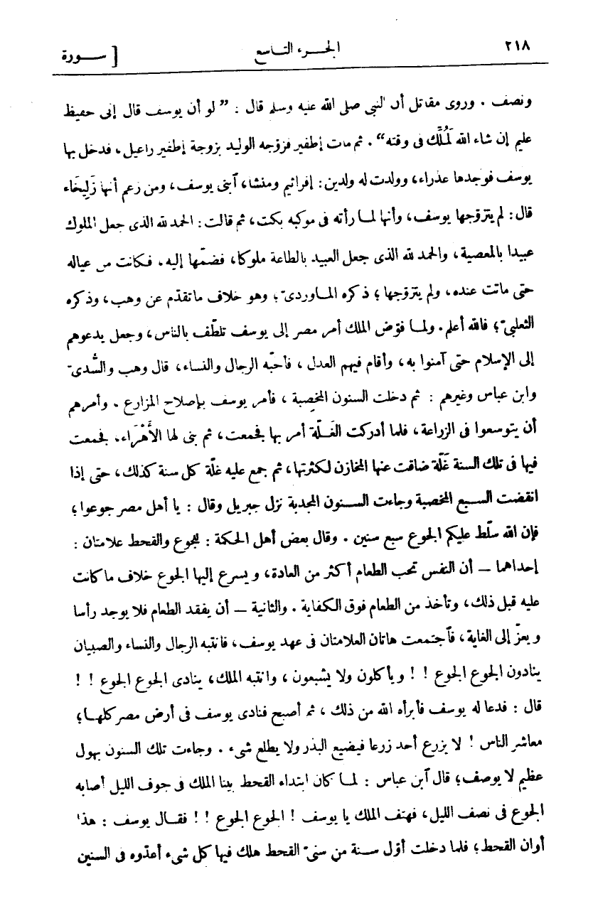 وَنِصْفٍ. وَرَوَى مُقَاتِلٌ إِنَّ النَّبِيَّ صَلَّى اللَّهُ عَلَيْهِ وَسَلَّمَ قَالَ:" لَوْ أَنَّ يُوسُفُ قَالَ إِنِّي حَفِيظٌ عَلِيمٌ إِنْ شَاءَ اللَّهُ لَمُلِّكَ فِي وَقْتِهِ". ثُمَّ مَاتَ إِطْفِيرُ فَزَوَّجَهُ الْوَلِيدُ بِزَوْجَةِ إِطْفِيرَ رَاعِيلَ، فَدَخَلَ بِهَا يُوسُفُ فَوَجَدَهَا عَذْرَاءَ، وَوَلَدَتْ لَهُ وَلَدَيْنِ: إِفْرَاثِيمَ ومنشا، ابْنَيْ يُوسُفَ، وَمَنْ زَعَمَ أَنَّهَا زَلِيخَاءُ قَالَ: لَمْ يَتَزَوَّجْهَا يُوسُفُ، وَأَنَّهَا لَمَّا رَأَتْهُ فِي مَوْكِبِهِ بَكَتْ، ثُمَّ قَالَتِ: الْحَمْدُ لِلَّهِ الَّذِي جَعَلَ الْمُلُوكَ عَبِيدًا بِالْمَعْصِيَةِ، وَالْحَمْدِ لِلَّهِ الَّذِي جَعَلَ الْعَبِيدَ بِالطَّاعَةِ مُلُوكًا، فَضَمَّهَا إِلَيْهِ، فَكَانَتْ مِنْ عِيَالِهِ حَتَّى مَاتَتْ عِنْدَهُ، وَلَمْ يَتَزَوَّجْهَا، ذَكَرَهُ الْمَاوَرْدِيُّ، وَهُوَ خِلَافُ مَا تَقَدَّمَ عَنْ وَهْبٍ، وَذَكَرَهُ الثَّعْلَبِيُّ، فَاللَّهُ أَعْلَمُ. وَلَمَّا فَوَّضَ الْمَلِكُ أَمْرَ مِصْرَ إِلَى يُوسُفَ تَلَطَّفَ بِالنَّاسِ، وَجَعَلَ يَدْعُوهُمْ إِلَى الْإِسْلَامِ حَتَّى آمَنُوا بِهِ، وَأَقَامَ فِيهِمُ الْعَدْلَ، فَأَحَبَّهُ الرِّجَالُ وَالنِّسَاءُ، قَالَ وَهْبٌ وَالسُّدِّيُّ وَابْنُ عَبَّاسٍ وَغَيْرُهُمْ: ثُمَّ دَخَلَتِ السُّنُونَ الْمُخْصِبَةُ، فَأَمَرَ يُوسُفُ بِإِصْلَاحِ الْمَزَارِعِ، وَأَمَرَهُمْ أَنْ يَتَوَسَّعُوا فِي الزِّرَاعَةِ، فَلَمَّا أَدْرَكَتِ الْغَلَّةُ أَمَرَ بِهَا فَجُمِعَتْ، ثُمَّ بَنَى لَهَا الْأَهْرَاءَ، فَجُمِعَتْ فِيهَا فِي تِلْكَ السَّنَةِ غَلَّةٌ ضَاقَتْ عَنْهَا الْمَخَازِنُ لِكَثْرَتِهَا، ثُمَّ جَمَعَ عَلَيْهِ غَلَّةَ كُلِّ سَنَةٍ كَذَلِكَ، حَتَّى إِذَا انْقَضَتِ السَّبْعُ الْمُخْصِبَةُ وَجَاءَتِ السُّنُونَ الْمُجْدِبَةُ نَزَلَ جِبْرِيلُ وَقَالَ: يَا أَهْلَ مِصْرَ جُوعُوا، فَإِنَّ اللَّهَ سَلَّطَ عَلَيْكُمُ الْجُوعَ سَبْعَ سِنِينَ. وَقَالَ بَعْضُ أَهْلِ الْحِكْمَةِ: لِلْجُوعِ وَالْقَحْطِ عَلَامَتَانِ: إِحْدَاهُمَا- أَنَّ النَّفْسَ تُحِبُّ الطَّعَامَ أَكْثَرُ مِنَ الْعَادَةِ، وَيُسْرِعُ إِلَيْهَا الْجُوعُ خِلَافَ مَا كَانَتْ عَلَيْهِ قَبْلَ ذَلِكَ، وَتَأْخُذُ مِنَ الطَّعَامِ فَوْقَ الْكِفَايَةِ. وَالثَّانِيَةُ- أَنْ يُفْقَدَ الطَّعَامُ فَلَا يُوجَدُ رَأْسًا وَيَعِزُّ إِلَى الْغَايَةِ، فَاجْتَمَعَتْ هَاتَانِ الْعَلَامَتَانِ فِي عَهْدِ يُوسُفَ، فَانْتَبَهَ الرِّجَالُ وَالنِّسَاءُ وَالصِّبْيَانُ يُنَادُونَ الْجُوعَ الْجُوعَ!! وَيَأْكُلُونَ وَلَا يَشْبَعُونَ، وَانْتَبَهَ الْمَلِكُ، يُنَادِي الْجُوعَ الْجُوعَ!! قَالَ: فَدَعَا لَهُ يُوسُفُ فَأَبْرَأَهُ اللَّهُ مِنْ ذَلِكَ، ثُمَّ أَصْبَحَ فَنَادَى يُوسُفُ فِي أَرْضِ مِصْرَ كُلِّهَا، مَعَاشِرَ النَّاسِ! لَا يَزْرَعُ أَحَدٌ زرعا فيضيع الذر ولا يطلع شي. وَجَاءَتْ تِلْكَ السُّنُونَ بِهَوْلٍ عَظِيمٍ لَا يُوصَفُ، قَالَ ابْنُ عَبَّاسٍ: لَمَّا كَانَ ابْتِدَاءُ الْقَحْطِ بَيْنَا الْمَلِكُ فِي جَوْفِ اللَّيْلِ أَصَابَهُ الْجُوعُ فِي نِصْفِ اللَّيْلِ، فَهَتَفَ الْمَلِكُ يَا يُوسُفُ! الْجُوعَ الْجُوعَ!! فَقَالَ يُوسُفُ: هَذَا أَوَانُ الْقَحْطِ، فَلَمَّا دَخَلَتْ أَوَّلُ سَنَةٍ مِنْ سِنِي الْقَحْطِ هلك فيها كل شي أَعَدُّوهُ فِي السِّنِينَ