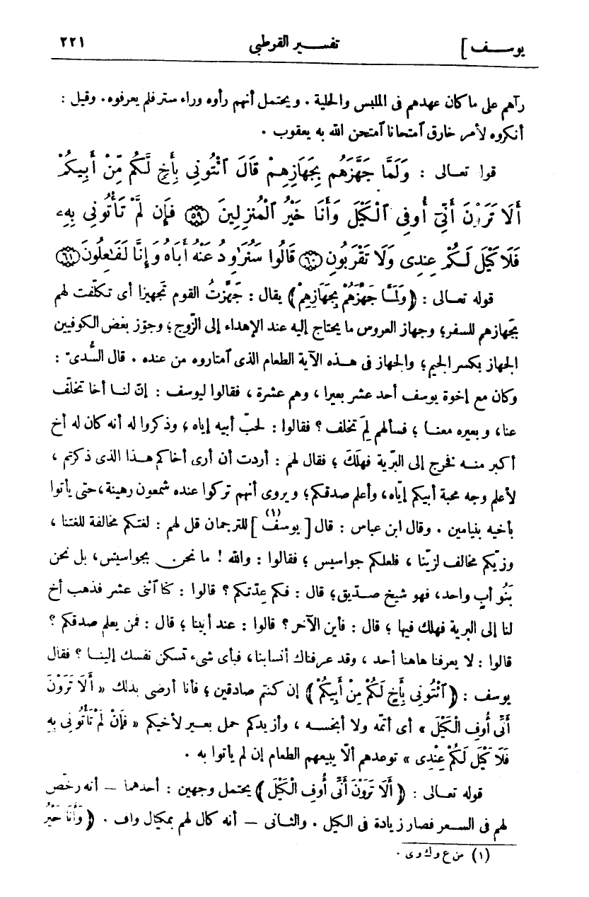 قَوْلُهُ تَعَالَى: (وَلَمَّا جَهَّزَهُمْ بِجَهازِهِمْ) يُقَالُ: جَهَّزْتُ الْقَوْمَ تَجْهِيزًا أَيْ تَكَلَّفْتُ لَهُمْ بِجَهَازِهِمْ لِلسَّفَرِ، وَجَهَازُ الْعَرُوسِ مَا يُحْتَاجُ إِلَيْهِ عِنْدَ الْإِهْدَاءِ إِلَى الزَّوْجِ، وَجَوَّزَ بَعْضُ الْكُوفِيِّينَ الْجِهَازَ بِكَسْرِ الْجِيمِ، وَالْجَهَازِ فِي هَذِهِ الْآيَةِ الطَّعَامُ الَّذِي امْتَارُوهُ مِنْ عِنْدِهِ. قَالَ السُّدِّيُّ: وَكَانَ مَعَ إِخْوَةِ يُوسُفَ أَحَدَ عَشَرَ بَعِيرًا، وَهُمْ عَشَرَةٌ، فَقَالُوا لِيُوسُفَ: إِنَّ لَنَا أَخًا تَخَلَّفَ عَنَّا، وَبَعِيرُهُ مَعَنَا، فَسَأَلَهُمْ لِمَ تَخَلَّفَ؟ فَقَالُوا: لِحُبِ أَبِيهِ إِيَّاهُ، وَذَكَرُوا لَهُ أَنَّهُ كَانَ لَهُ أَخٌ أَكْبَرُ مِنْهُ فَخَرَجَ إِلَى الْبَرِّيَّةِ فَهَلَكَ، فَقَالَ لَهُمْ: أَرَدْتُ أَنْ أَرَى أَخَاكُمْ هَذَا الَّذِي ذَكَرْتُمْ، لِأَعْلَمَ وَجْهَ مَحَبَّةِ أَبِيكُمْ إِيَّاهُ، وَأَعْلَمَ صِدْقَكُمْ، وَيُرْوَى أَنَّهُمْ تَرَكُوا عِنْدَهُ شَمْعُونَ رَهِينَةً، حَتَّى يَأْتُوا بِأَخِيهِ بِنْيَامِينَ. وَقَالَ ابْنُ عَبَّاسٍ: قَالَ [يُوسُفُ «١»] لِلتُّرْجُمَانِ قُلْ لَهُمْ: لُغَتُكُمْ مُخَالِفَةٌ لِلُغَتِنَا، وَزِيُّكُمْ مُخَالِفٌ لِزِيِّنَا، فَلَعَلَّكُمْ جَوَاسِيسُ، فَقَالُوا: وَاللَّهِ! مَا نَحْنُ بِجَوَاسِيسَ، بَلْ نَحْنُ بَنُو أَبٍ وَاحِدٍ، فَهُوَ شَيْخٌ صِدِّيقٌ، قَالَ: فَكَمْ عِدَّتُكُمْ؟ قَالُوا: كُنَّا اثْنَيْ عَشَرَ فَذَهَبَ أَخٌ لَنَا إِلَى الْبَرِّيَّةِ فَهَلَكَ فِيهَا، قَالَ: فَأَيْنَ الْآخَرُ؟ قَالُوا: عِنْدَ أَبِينَا، قَالَ: فَمَنْ يَعْلَمُ صِدْقَكُمْ؟ قَالُوا: لَا يَعْرِفُنَا هَاهُنَا أَحَدٌ، وَقَدْ عَرَّفْنَاكَ أنسابنا، فبأي شي تَسْكُنُ نَفْسُكُ إِلَيْنَا؟ فَقَالَ يُوسُفُ: (ائْتُونِي بِأَخٍ لَكُمْ مِنْ أَبِيكُمْ) إِنْ كُنْتُمْ صَادِقِينَ، فَأَنَا أَرْضَى بِذَلِكَ" أَلا تَرَوْنَ أَنِّي أُوفِي الْكَيْلَ" أَيْ أُتِمُّهُ وَلَا أَبْخَسُهُ، وَأَزِيدُكُمْ حِمْلَ بَعِيرٍ لِأَخِيكُمْ" فَإِنْ لَمْ تَأْتُونِي بِهِ فَلا كَيْلَ لَكُمْ عِنْدِي" تَوَعَّدَهُمْ أَلَّا يَبِيعَهُمُ الطَّعَامَ إِنْ لَمْ يَأْتُوا بِهِ. قَوْلُهُ تَعَالَى: (أَلا تَرَوْنَ أَنِّي أُوفِي الْكَيْلَ) يحتمل وَجْهَيْنِ: أَحَدُهُمَا- أَنَّهُ رَخَّصَ لَهُمْ فِي السِّعْرِ فَصَارَ زِيَادَةً فِي الْكَيْلِ. وَالثَّانِي- أَنَّهُ كَالَ لهم بمكيال واف. (وَأَنَا خَيْرُ الْمُنْزِلِينَ)