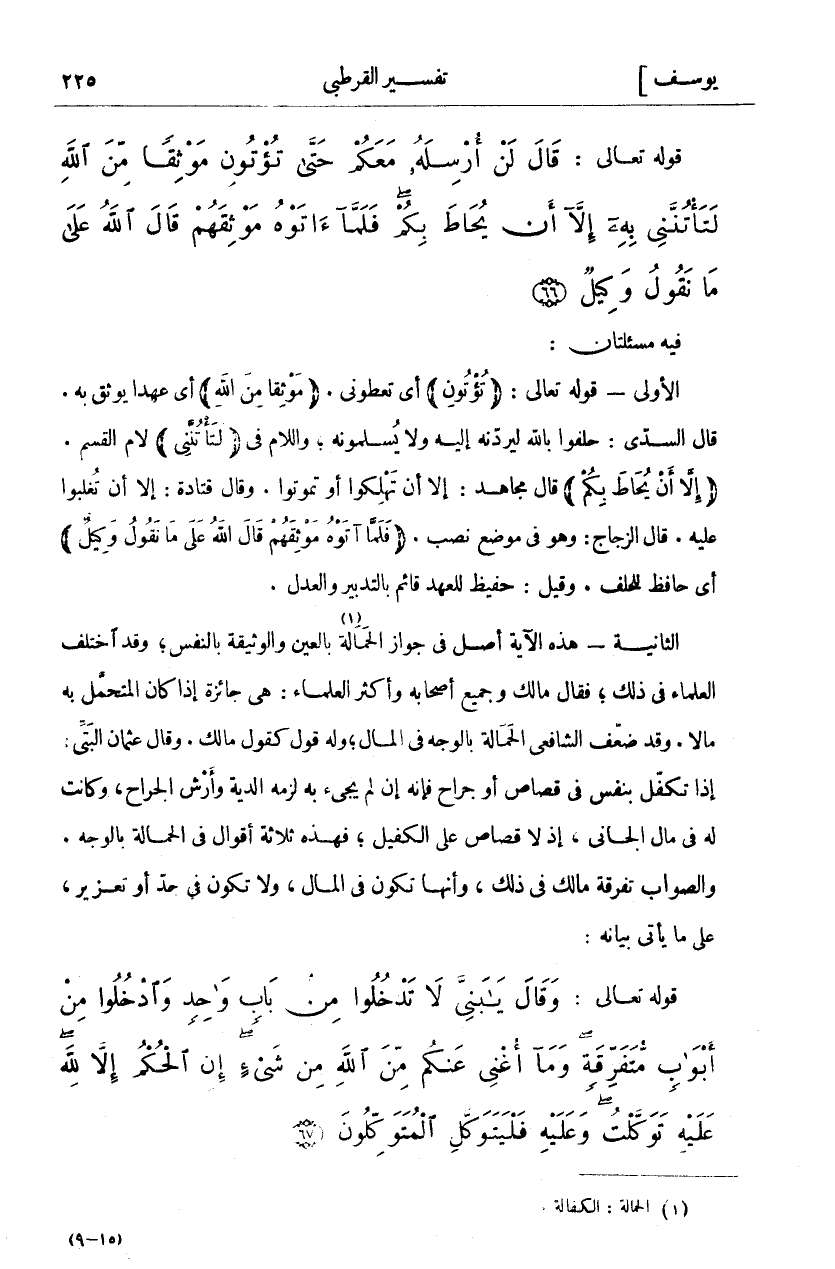 فِيهِ مَسْأَلَتَانِ: الْأُولَى- قَوْلُهُ تَعَالَى: (تُؤْتُونِ) أَيْ تُعْطُونِي. (مَوْثِقاً مِنَ اللَّهِ) أَيْ عَهْدًا يُوثَقُ بِهِ. قَالَ السُّدِّيُّ: حَلَفُوا بِاللَّهِ لَيَرُدُّنَّهُ إِلَيْهِ وَلَا يُسْلِمُونَهُ، وَاللَّامُ فِي (لَتَأْتُنَّنِي) لَامُ الْقَسَمِ. (إِلَّا أَنْ يُحاطَ بِكُمْ) قَالَ مُجَاهِدٌ: إِلَّا أَنْ تَهْلِكُوا أَوْ تَمُوتُوا. وَقَالَ قَتَادَةُ: إِلَّا أَنْ تُغْلَبُوا عَلَيْهِ. قَالَ الزَّجَّاجُ: وَهُوَ فِي مَوْضِعِ نَصْبٍ. (فَلَمَّا آتَوْهُ مَوْثِقَهُمْ قالَ اللَّهُ عَلى مَا نَقُولُ وَكِيلٌ) أَيْ حَافِظٌ لِلْحَلِفِ. وَقِيلَ: حَفِيظٌ لِلْعَهْدِ قَائِمٌ بِالتَّدْبِيرِ وَالْعَدْلِ. الثَّانِيَةُ- هَذِهِ الْآيَةُ أَصْلٌ فِي جَوَازِ الْحَمَالَةِ «١» بِالْعَيْنِ وَالْوَثِيقَةِ بِالنَّفْسِ، وَقَدِ اخْتَلَفَ الْعُلَمَاءُ فِي ذَلِكَ، فَقَالَ مَالِكٌ وَجَمِيعُ أَصْحَابِهِ وَأَكْثَرُ الْعُلَمَاءِ: هِيَ جَائِزَةٌ إِذَا كَانَ الْمُتَحَمَّلُ بِهِ مَالًا وَقَدْ ضَعَّفَ الشَّافِعِيُّ الْحَمَالَةَ بِالْوَجْهِ فِي الْمَالِ، وَلَهُ قَوْلٌ كَقَوْلِ مَالِكٍ. وَقَالَ عُثْمَانُ الْبَتِّيُّ: إِذَا تَكَفَّلَ بِنَفْسٍ فِي قِصَاصٍ أَوْ جِرَاحٍ فَإِنَّهُ إِنْ لَمْ يَجِئْ بِهِ لَزِمَهُ الدِّيَةُ وَأَرْشُ الْجِرَاحِ، وَكَانَتْ لَهُ فِي مَالِ الْجَانِي، إِذْ لَا قِصَاصَ عَلَى الْكَفِيلِ، فَهَذِهِ ثَلَاثَةُ أَقْوَالٍ فِي الْحَمَالَةِ بِالْوَجْهِ. وَالصَّوَابُ تَفْرِقَةُ مَالِكٍ فِي ذَلِكَ، وَأَنَّهَا تَكُونُ فِي الْمَالِ، وَلَا تَكُونُ فِي حَدٍّ أَوْ تَعْزِيرٍ، على ما يأتي بيانه.
