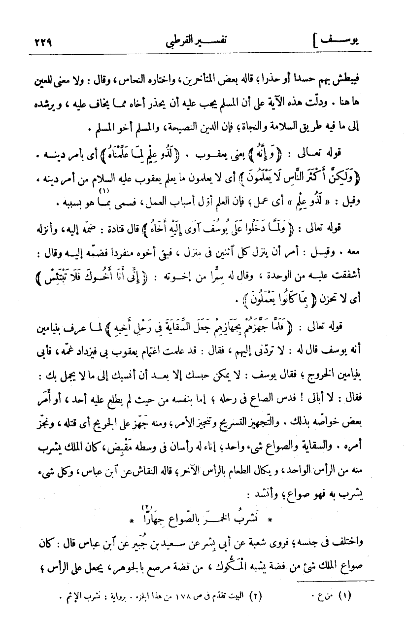 فَيَبْطِشُ بِهِمْ حَسَدًا أَوْ حَذَرًا، قَالَهُ بَعْضُ الْمُتَأَخِّرِينَ، وَاخْتَارَهُ النَّحَّاسُ، وَقَالَ: وَلَا مَعْنَى لِلْعَيْنِ هَاهُنَا. وَدَلَّتْ هَذِهِ الْآيَةُ عَلَى أَنَّ الْمُسْلِمَ يَجِبُ عَلَيْهِ أَنْ يُحَذِّرَ أَخَاهُ مِمَّا يَخَافُ عَلَيْهِ، وَيُرْشِدَهُ إِلَى مَا فِيهِ طَرِيقُ السَّلَامَةِ وَالنَّجَاةِ، فَإِنَّ الدِّينَ النَّصِيحَةُ، وَالْمُسْلِمُ أَخُو الْمُسْلِمِ. قَوْلُهُ تَعَالَى: (وَإِنَّهُ) يَعْنِي يَعْقُوبَ. (لَذُو عِلْمٍ لِما عَلَّمْناهُ) أَيْ بِأَمْرِ دِينِهِ. (وَلكِنَّ أَكْثَرَ النَّاسِ لَا يَعْلَمُونَ) أَيْ لَا يَعْلَمُونَ مَا يَعْلَمُ يَعْقُوبَ عَلَيْهِ السَّلَامُ مِنْ أَمْرِ دِينِهِ. وَقِيلَ:" لَذُو عِلْمٍ" أَيْ عَمَلٍ، فَإِنَّ الْعِلْمَ أَوَّلُ أَسْبَابِ الْعَمَلِ، فَسُمِّيَ بِمَا «١» هُوَ بِسَبَبِهِ. قَوْلُهُ تَعَالَى: (وَلَمَّا دَخَلُوا عَلى يُوسُفَ آوَى إِلَيْهِ أَخاهُ) قَالَ قَتَادَةُ: ضَمَّهُ إِلَيْهِ، وَأَنْزَلَهُ مَعَهُ. وَقِيلَ: أَمَرَ أَنْ يَنْزِلَ كُلُّ اثْنَيْنِ فِي مَنْزِلٍ، فَبَقِيَ أَخُوهُ مُنْفَرِدًا فَضَمَّهُ إِلَيْهِ وَقَالَ: أَشْفَقْتُ عَلَيْهِ مِنَ الْوَحْدَةِ، قَالَ لَهُ سِرًّا مِنْ إِخْوَتِهِ: (إِنِّي أَنَا أَخُوكَ فَلا تَبْتَئِسْ) أَيْ لَا تَحْزَنْ (بِما كانُوا يَعْمَلُونَ). قَوْلُهُ تَعَالَى: (فَلَمَّا جَهَّزَهُمْ بِجَهازِهِمْ جَعَلَ السِّقايَةَ فِي رَحْلِ أَخِيهِ) لَمَّا عَرَفَ بِنْيَامِينُ أَنَّهُ يُوسُفَ قَالَ لَهُ: لَا تَرُدَّنِي إِلَيْهِمْ، فَقَالَ: قَدْ عَلِمْتُ اغْتِمَامَ يَعْقُوبَ بِي فَيَزْدَادُ غَمُّهُ، فَأَبَى بِنْيَامِينُ الْخُرُوجَ، فَقَالَ يُوسُفُ: لَا يُمْكِنُ حَبْسُكَ إِلَّا بَعْدَ أَنْ أَنْسُبَكَ إِلَى مَا لَا يَجْمُلُ بِكَ: فَقَالَ: لَا أُبَالِي! فَدَسَّ الصَّاعَ فِي رَحْلِهِ، إِمَّا بِنَفْسِهِ مِنْ حَيْثُ لَمْ يَطَّلِعْ عَلَيْهِ أَحَدٌ، أَوْ أَمَرَ بَعْضَ خَوَاصِّهِ بِذَلِكَ. وَالتَّجْهِيزُ التَّسْرِيحُ وَتَنْجِيزُ الْأَمْرِ، وَمِنْهُ جَهَّزَ عَلَى الْجَرِيحِ أَيْ قَتَلَهُ، وَنَجَزَّ أَمْرَهُ. والسقاية والصواع شي وَاحِدٌ، إِنَاءٌ لَهُ رَأْسَانِ فِي وَسَطِهِ مِقْبَضٌ، كَانَ الْمَلِكُ يَشْرَبُ مِنْهُ مِنَ الرَّأْسِ الْوَاحِدِ، وَيُكَالُ الطَّعَامُ بِالرَّأْسِ الْآخَرِ، قَالَهُ النَّقَّاشُ عَنِ ابن عباس، وكل شي يُشْرَبُ بِهِ فَهُوَ صُوَاعٌ، وَأَنْشَدَ:
