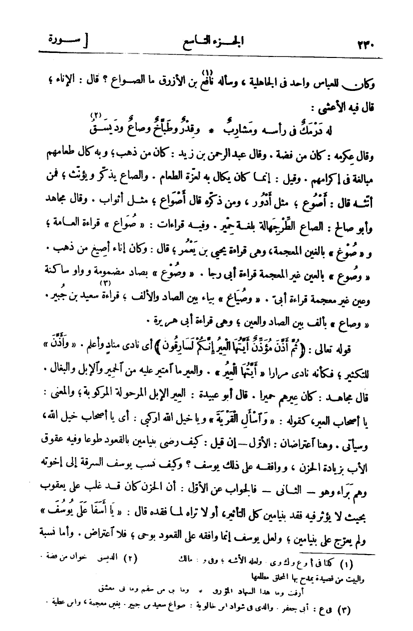 وَقَالَ عِكْرِمَةُ: كَانَ مِنْ فِضَّةٍ. وَقَالَ عَبْدُ الرَّحْمَنِ بْنُ زَيْدٍ: كَانَ مِنْ ذَهَبٍ، وَبِهِ كَالَ طَعَامُهُمْ مُبَالَغَةً فِي إِكْرَامِهِمْ. وَقِيلَ: إِنَّمَا كَانَ يُكَالُ بِهِ لِعِزَّةِ الطَّعَامِ. وَالصَّاعُ يُذَكَّرُ وَيُؤَنَّثُ، فَمَنْ أَنَّثَهُ قَالَ: أَصْوُعٌ، مِثْلُ أَدْوُرٍ، وَمَنْ ذَكَّرَهُ قَالَ أَصْوَاعٌ، مِثْلُ أَثْوَابٍ. وَقَالَ مُجَاهِدٌ وَأَبُو صَالِحٍ: الصَّاعُ الطِّرْجِهَالَةُ بِلُغَةِ حِمْيَرَ. وَفِيهِ قِرَاءَاتٌ:" صُواعَ" قِرَاءَةُ الْعَامَّةِ، وَ" صَوْغَ" بِالْغَيْنِ الْمُعْجَمَةِ، وَهِيَ قِرَاءَةُ يَحْيَى بْنِ يَعْمَرَ، قَالَ: وَكَانَ إِنَاءً أُصِيغَ مِنْ ذَهَبٍ." وَصَوْعَ" بِالْعَيْنِ غَيْرِ الْمُعْجَمَةِ قِرَاءَةُ أَبِي رَجَا." وَصُوعَ" بِصَادِ مَضْمُومَةٍ وَوَاوٍ سَاكِنَةٍ وَعَيْنٍ غَيْرِ مُعْجَمَةٍ قِرَاءَةُ أُبَيٍّ." وَصُيَاعَ" بِيَاءٍ بَيْنَ الصَّادِ وَالْأَلِفِ، قِرَاءَةُ «٣» سَعِيدِ بْنِ جُبَيْرٍ." وَصَاعَ" بِأَلِفٍ بَيْنَ الصَّادِ وَالْعَيْنِ، وَهِيَ قِرَاءَةُ أَبِي هُرَيْرَةَ. قَوْلُهُ تَعَالَى: (ثُمَّ أَذَّنَ مُؤَذِّنٌ أَيَّتُهَا الْعِيرُ إِنَّكُمْ لَسارِقُونَ) أَيْ نَادَى مناد وأعلم. و" أَذَّنَ" لِلتَّكْثِيرِ، فَكَأَنَّهُ نَادَى مِرَارًا" أَيَّتُهَا الْعِيرُ". وَالْعِيرُ مَا امْتِيرَ عَلَيْهِ مِنَ الْحَمِيرِ وَالْإِبِلِ وَالْبِغَالِ. قَالَ مُجَاهِدٌ: كَانَ عِيرُهُمْ حَمِيرًا. قَالَ أَبُو عُبَيْدَةَ: الْعِيرُ الْإِبِلُ الْمَرْحُولَةُ الْمَرْكُوبَةُ، وَالْمَعْنَى: يَا أصحاب العير، كقوله:" وَسْئَلِ الْقَرْيَةَ" [يوسف: ٨٢] وَيَا خَيْلَ اللَّهِ ارْكَبِي: أَيْ يَا أَصْحَابَ خَيْلِ اللَّهِ، وَسَيَأْتِي. وَهُنَا اعْتِرَاضَانِ: الْأَوَّلُ- إِنْ قِيلَ: كَيْفَ رَضِيَ بِنْيَامِينُ بِالْقُعُودِ طَوْعًا وَفِيهِ عُقُوقُ الْأَبِ بِزِيَادَةِ الْحُزْنِ، وَوَافَقَهُ عَلَى ذَلِكَ يُوسُفُ؟ وَكَيْفَ نَسَبَ يُوسُفُ السَّرِقَةَ إِلَى إِخْوَتِهِ وهم براء وهوالثاني- فَالْجَوَابُ عَنِ الْأَوَّلِ: أَنَّ الْحُزْنَ كَانَ قَدْ غَلَبَ عَلَى يَعْقُوبَ بِحَيْثُ لَا يُؤَثِّرُ فِيهِ فَقْدُ بِنْيَامِينَ كُلَّ التَّأْثِيرِ، أَوَلَا تَرَاهُ لَمَّا فقده قال:" يا أَسَفى عَلى يُوسُفَ" [يُوسُفَ: ٨٤] وَلَمْ يُعَرِّجْ عَلَى بِنْيَامِينَ، وَلَعَلَّ يُوسُفَ إِنَّمَا وَافَقَهُ عَلَى الْقُعُودِ بِوَحْيٍ، فَلَا اعْتِرَاضَ. وأما نسبة