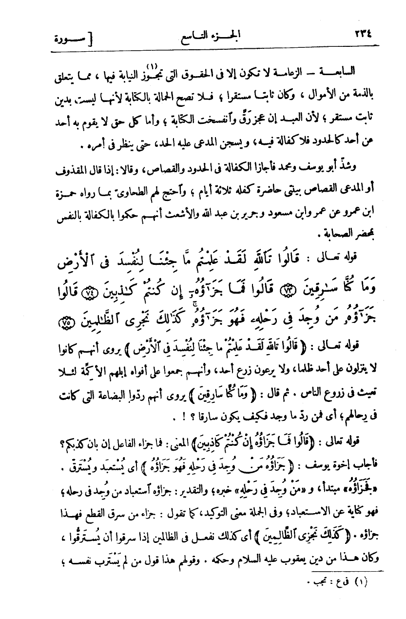 قَوْلُهُ تَعَالَى: (قالُوا تَاللَّهِ لَقَدْ عَلِمْتُمْ مَا جِئْنا لِنُفْسِدَ فِي الْأَرْضِ) يُرْوَى أَنَّهُمْ كَانُوا لَا يَنْزِلُونَ عَلَى أَحَدٍ ظُلْمًا، وَلَا يَرْعَوْنَ زَرْعَ أَحَدٍ، وَأَنَّهُمْ جَمَعُوا عَلَى أَفْوَاهِ إِبِلِهِمُ الْأَكِمَّةَ لِئَلَّا تَعِيثَ فِي زُرُوعِ النَّاسِ. ثم قال: (وَما كُنَّا سارِقِينَ) يُرْوَى أَنَّهُمْ رَدُّوا الْبِضَاعَةَ الَّتِي كَانَتْ فِي رِحَالِهِمْ، أَيْ فَمَنْ رَدَّ مَا وَجَدَ فَكَيْفَ يَكُونُ سَارِقًا؟!. قَوْلُهُ تَعَالَى: (قالُوا فَما جَزاؤُهُ إِنْ كُنْتُمْ كاذِبِينَ) الْمَعْنَى: فَمَا جَزَاءُ الْفَاعِلِ إِنْ بَانَ كَذِبُكُمْ؟ فَأَجَابَ إِخْوَةُ يُوسُفَ: (جَزاؤُهُ مَنْ وُجِدَ فِي رَحْلِهِ فَهُوَ جَزاؤُهُ) أَيْ يُسْتَعْبَدُ وَيُسْتَرَقُّ." فَجَزاؤُهُ" مُبْتَدَأٌ، وَ" مَنْ وُجِدَ فِي رَحْلِهِ" خَبَرُهُ، وَالتَّقْدِيرُ: جَزَاؤُهُ اسْتِعْبَادُ مَنْ وُجِدَ فِي رَحْلِهِ، فَهُوَ كِنَايَةٌ عَنِ الِاسْتِعْبَادِ، وَفِي الْجُمْلَةِ مَعْنَى التَّوْكِيدِ، كَمَا تَقُولُ: جَزَاءُ مَنْ سَرَقَ الْقَطْعُ فَهَذَا جَزَاؤُهُ. (كَذلِكَ نَجْزِي الظَّالِمِينَ) أَيْ كَذَلِكَ نَفْعَلُ فِي الظَّالِمِينَ إِذَا سَرَقُوا أَنْ يُسْتَرَقُّوا، وَكَانَ هَذَا مِنْ دِينِ يَعْقُوبَ عَلَيْهِ السَّلَامُ وَحُكْمِهِ. وَقَوْلُهُمْ هَذَا قَوْلُ مَنْ لَمْ يَسْتَرِبْ نَفْسَهُ،