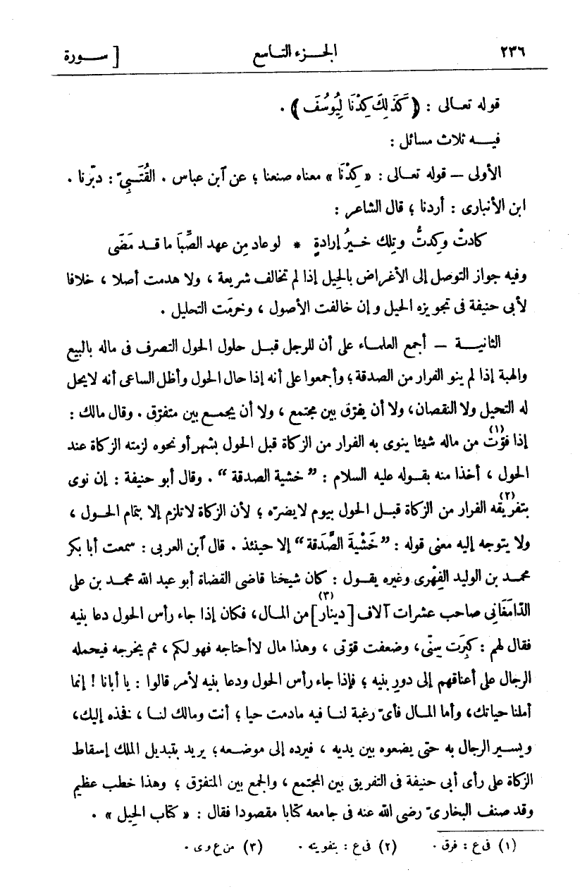 وَفِيهِ جَوَازُ التَّوَصُّلِ إِلَى الْأَغْرَاضِ بِالْحِيَلِ إِذَا لَمْ تُخَالِفْ شَرِيعَةً، وَلَا هَدَمَتْ أَصْلًا، خِلَافًا لِأَبِي حَنِيفَةَ فِي تَجْوِيزِهِ الْحِيَلَ وَإِنْ خَالَفَتِ الْأُصُولَ، وَخَرَمَتِ التَّحْلِيلَ. الثَّانِيَةُ- أَجْمَعَ الْعُلَمَاءُ عَلَى أَنَّ لِلرَّجُلِ قَبْلَ حُلُولِ الْحَوْلِ التَّصَرُّفَ فِي مَالِهِ بِالْبَيْعِ وَالْهِبَةِ إِذَا لَمْ يَنْوِ الْفِرَارَ مِنَ الصَّدَقَةِ، وَأَجْمَعُوا عَلَى أَنَّهُ إِذَا حَالَ الْحَوْلُ وَأَظَلَّ السَّاعِيَ أَنَّهُ لَا يَحِلُّ لَهُ التَّحَيُّلُ وَلَا النُّقْصَانُ، وَلَا أَنْ يُفَرِّقَ بَيْنَ مُجْتَمِعٍ، وَلَا أَنْ يَجْمَعَ بَيْنَ مُتَفَرِّقٍ. وَقَالَ مَالِكٌ: إِذَا فَوَّتَ «١» مِنْ مَالِهِ شَيْئًا يَنْوِي بِهِ الْفِرَارَ مِنَ الزَّكَاةِ قَبْلَ الْحَوْلِ بِشَهْرٍ أَوْ نَحْوِهِ لَزِمَتْهُ الزَّكَاةُ عِنْدَ الْحَوْلِ، أَخْذًا مِنْهُ بِقَوْلِهِ عَلَيْهِ السَّلَامُ:" خَشْيَةَ الصَّدَقَةِ". وَقَالَ أَبُو حَنِيفَةَ: إِنْ نَوَى بِتَفْرِيقِهِ «٢» الْفِرَارَ مِنَ الزَّكَاةِ قَبْلَ الْحَوْلِ بِيَوْمٍ لَا يَضُرُّهُ، لِأَنَّ الزَّكَاةَ لَا تَلْزَمُ إِلَّا بِتَمَامِ الْحَوْلِ، وَلَا يَتَوَجَّهُ إِلَيْهِ مَعْنَى قَوْلِهِ:" خَشْيَةَ الصَّدَقَةِ" إِلَّا حِينَئِذٍ. قَالَ ابْنُ الْعَرَبِيِّ: سَمِعْتُ أَبَا بَكْرٍ مُحَمَّدَ بْنَ الْوَلِيدِ الْفِهْرِيَّ وَغَيْرَهُ يَقُولُ: كَانَ شَيْخُنَا قَاضِي الْقُضَاةِ أَبُو عَبْدِ اللَّهِ مُحَمَّدُ بْنُ عَلِيٍّ الدَّامَغَانِيُّ صَاحِبَ عَشْرَاتِ آلَافِ [دِينَارٍ] «٣» مِنَ الْمَالِ، فَكَانَ إِذَا جَاءَ رَأْسُ الْحَوْلِ دَعَا بَنِيهِ فَقَالَ لَهُمْ: كَبِرَتْ سِنِي، وَضَعُفَتْ قُوَّتِي، وَهَذَا مَالٌ لَا أَحْتَاجُهُ فَهُوَ لَكُمْ، ثُمَّ يُخْرِجُهُ فَيَحْمِلُهُ الرِّجَالُ عَلَى أَعْنَاقِهِمْ إِلَى دُورِ بَنِيهِ، فَإِذَا جَاءَ رَأْسُ الْحَوْلِ وَدَعَا بَنِيهِ لِأَمْرٍ قَالُوا: يَا أَبَانَا! إِنَّمَا أَمَلْنَا حَيَاتَكَ، وَأَمَّا الْمَالُ فَأَيُّ رَغْبَةٍ لَنَا فِيهِ مَا دُمْتَ حَيًّا، أَنْتَ وَمَالُكَ لَنَا، فَخُذْهُ إِلَيْكَ، وَيَسِيرُ الرِّجَالُ بِهِ حَتَّى يَضَعُوهُ بَيْنَ يَدَيْهِ، فَيَرُدُّهُ إِلَى مَوْضِعِهِ، يُرِيدُ بِتَبْدِيلِ الْمِلْكِ إِسْقَاطَ الزَّكَاةِ عَلَى رَأْيِ أَبِي حَنِيفةَ فِي التَّفْرِيقِ بَيْنَ الْمُجْتَمِعِ، وَالْجَمْعِ بَيْنَ الْمُتَفَرِّقِ، وَهَذَا خَطْبٌ عَظِيمٌ وَقَدْ صَنَّفَ الْبُخَارِيُّ رَضِيَ اللَّهُ عَنْهُ فِي جامعه كتابا مقصود فقال:" كتاب الحيل".