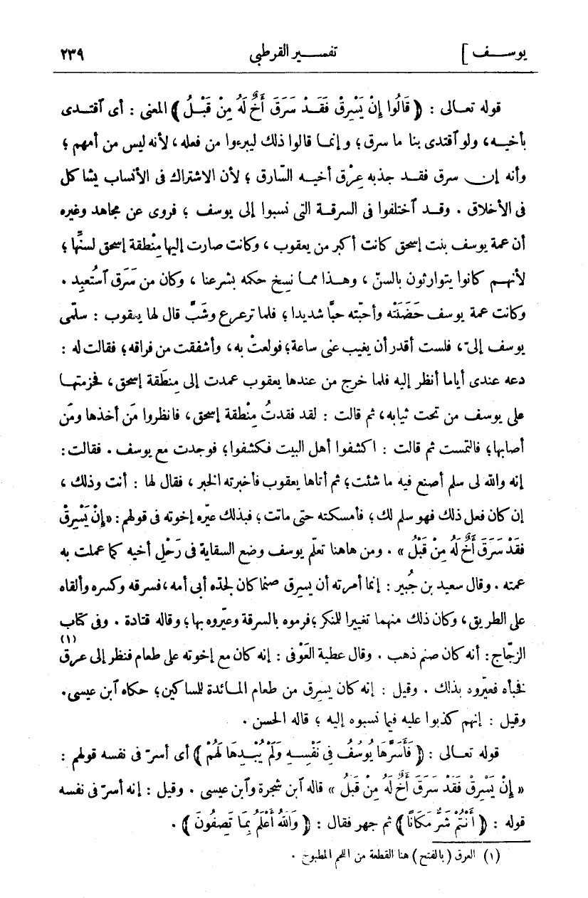 قَوْلُهُ تَعَالَى: (قالُوا إِنْ يَسْرِقْ فَقَدْ سَرَقَ أَخٌ لَهُ مِنْ قَبْلُ) الْمَعْنَى: أَيِ اقْتَدَى بِأَخِيهِ، وَلَوِ اقْتَدَى بِنَا مَا سَرَقَ، وَإِنَّمَا قَالُوا ذَلِكَ لِيَبْرَءُوا مِنْ فِعْلِهِ، لِأَنَّهُ لَيْسَ مِنْ أُمِّهِمْ، وَأَنَّهُ إِنْ سَرَقَ فَقَدْ جَذَبَهُ عِرْقُ أَخِيهِ السَّارِقِ، لِأَنَّ الِاشْتِرَاكَ فِي الْأَنْسَابِ يُشَاكِلُ فِي الْأَخْلَاقِ. وَقَدِ اخْتَلَفُوا فِي السَّرِقَةِ الَّتِي نَسَبُوا إِلَى يُوسُفَ، فَرُوِيَ عَنْ مُجَاهِدٍ وَغَيْرِهِ أَنَّ عَمَّةَ يُوسُفَ بِنْتَ إِسْحَاقَ كَانَتْ أَكْبَرَ مِنْ يَعْقُوبَ، وَكَانَتْ صَارَتْ إِلَيْهَا مِنْطَقَةُ إِسْحَاقَ لِسِنِّهَا، لِأَنَّهُمْ كَانُوا يَتَوَارَثُونَ بِالسِّنِّ، وَهَذَا مِمَّا نُسِخَ حُكْمُهُ بِشَرْعِنَا، وَكَانَ مَنْ سَرَقَ اسْتُعْبِدَ. وَكَانَتْ عَمَّةُ يُوسُفَ حَضَنَتْهُ وَأَحَبَّتْهُ حُبًّا شَدِيدًا، فَلَمَّا تَرَعْرَعَ وَشَبَّ قَالَ لَهَا يَعْقُوبُ: سَلِّمِي يُوسُفَ إِلَيَّ، فَلَسْتُ أَقْدِرُ أَنْ يَغِيبَ عَنِّي سَاعَةً، فَوَلِعَتْ بِهِ، وَأَشْفَقَتْ مِنْ فِرَاقِهِ، فَقَالَتْ لَهُ: دَعْهُ عِنْدِي أَيَّامًا أَنْظُرُ إِلَيْهِ فَلَمَّا خَرَجَ مِنْ عِنْدِهَا يَعْقُوبُ عَمَدَتْ إِلَى مِنْطَقَةِ إِسْحَاقَ، فَحَزَّمَتْهَا عَلَى يُوسُفَ مِنْ تَحْتِ ثِيَابِهِ، ثُمَّ قَالَتْ: لَقَدْ فَقَدْتُ مِنْطَقَةَ إِسْحَاقَ، فَانْظُرُوا مَنْ أَخَذَهَا وَمَنْ أَصَابَهَا، فَالْتَمَسَتْ ثُمَّ قَالَتِ: اكْشِفُوا أَهْلَ الْبَيْتِ فَكَشَفُوا، فَوُجِدَتْ مَعَ يُوسُفَ. فَقَالَتْ: إِنَّهُ وَاللَّهِ لِي سِلْمٌ أَصْنَعُ فِيهِ مَا شِئْتُ، ثُمَّ أَتَاهَا يَعْقُوبُ فَأَخْبَرَتْهُ الْخَبَرَ، فَقَالَ لَهَا: أَنْتِ وَذَلِكَ، إِنْ كَانَ فَعَلَ ذَلِكَ فَهُوَ سِلْمٌ لَكِ، فَأَمْسَكَتْهُ حَتَّى مَاتَتْ، فَبِذَلِكَ عَيَّرَهُ إِخْوَتُهُ فِي قَوْلِهِمْ:" إِنْ يَسْرِقْ فَقَدْ سَرَقَ أَخٌ لَهُ مِنْ قَبْلُ" وَمِنْ هَاهُنَا تَعَلَّمَ يُوسُفُ وَضْعَ السِّقَايَةِ فِي رَحْلِ أَخِيهِ كَمَا عَمِلَتْ بِهِ عَمَّتُهُ. وَقَالَ سَعِيدُ بْنُ جُبَيْرٍ: إِنَّمَا أَمَرَتْهُ أَنْ يَسْرِقَ صَنَمًا كَانَ لِجَدِّهِ أَبِي أُمِّهِ، فَسَرَقَهُ وَكَسَرَهُ وَأَلْقَاهُ عَلَى الطَّرِيقِ، وَكَانَ ذَلِكَ مِنْهُمَا تَغْيِيرًا للمنكر، فرموه بالسرقة وعيروه بها، وقاله قَتَادَةُ. وَفِي كِتَابِ الزَّجَّاجِ: أَنَّهُ كَانَ صَنَمُ ذَهَبٍ. وَقَالَ عَطِيَّةُ الْعَوْفِيُّ: إِنَّهُ كَانَ مَعَ إِخْوَتِهِ عَلَى طَعَامٍ فَنَظَرَ إِلَى عِرْقٍ «١» فَخَبَّأَهُ فغيره بِذَلِكَ. وَقِيلَ: إِنَّهُ كَانَ يَسْرِقُ مِنْ طَعَامِ المائدة للمساكين، حكاه ابن عسى. وَقِيلَ: إِنَّهُمْ كَذَبُوا عَلَيْهِ فِيمَا نَسَبُوهُ إِلَيْهِ، قَالَهُ الْحَسَنُ. قَوْلُهُ تَعَالَى: (فَأَسَرَّها يُوسُفُ فِي نَفْسِهِ وَلَمْ يُبْدِها لَهُمْ) أَيْ أَسَرَّ فِي نَفْسِهِ قَوْلَهُمْ:" إِنْ يَسْرِقْ فَقَدْ سَرَقَ أَخٌ لَهُ مِنْ قَبْلُ" قَالَهُ ابْنُ شَجَرَةَ وَابْنُ عِيسَى. وَقِيلَ: إِنَّهُ أَسَرَّ فِي نَفْسِهِ قَوْلَهُ:" أَنْتُمْ شَرٌّ مَكاناً" ثُمَّ جَهَرَ فَقَالَ:" وَاللَّهُ أَعْلَمُ بِما تَصِفُونَ".