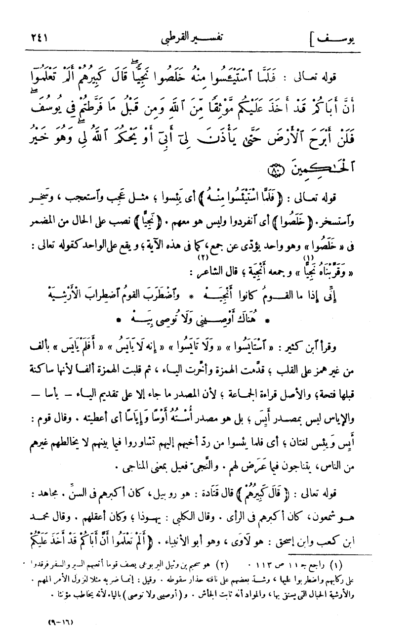 وَقَرَأَ ابْنُ كَثِيرٍ:" اسْتَايَسُوا"" وَلَا تَايَسَوا"" إِنَّهُ لَا يَايَسُ"" أَفَلَمْ يَايَسْ" بِأَلِفٍ مِنْ غَيْرِ هَمْزٍ عَلَى الْقَلْبِ، قُدِّمَتِ الْهَمْزَةُ وَأُخِّرَتِ الْيَاءُ، ثُمَّ قُلِبَتِ الْهَمْزَةُ أَلِفًا لِأَنَّهَا سَاكِنَةٌ قَبْلَهَا فَتْحَةٌ، وَالْأَصْلُ قِرَاءَةُ الْجَمَاعَةِ، لِأَنَّ الْمَصْدَرَ مَا جَاءَ إِلَّا عَلَى تَقْدِيمِ الْيَاءِ- يَأْسًا- وَالْإِيَاسَ لَيْسَ بِمَصْدَرِ أَيِسَ، بَلْ هُوَ مَصْدَرٌ أُسْتُهُ أَوْسًا وَإِيَاسًا أَيْ أَعْطَيْتُهُ. وَقَالَ قَوْمٌ: أَيِسَ وَيَئِسَ لُغَتَانِ، أَيْ فَلَمَّا يَئِسُوا مِنْ رَدِّ أَخِيهِمْ إِلَيْهِمْ تَشَاوَرُوا فِيمَا بَيْنَهُمْ لَا يُخَالِطُهُمْ غَيْرُهُمْ مِنَ النَّاسِ، يَتَنَاجَوْنَ فِيمَا عَرَضَ لَهُمْ. وَالنَّجِيُّ فَعِيلٌ بِمَعْنَى الْمُنَاجِي. قَوْلُهُ تَعَالَى: (قالَ كَبِيرُهُمْ) قَالَ قَتَادَةُ: وَهُوَ رُوبِيلُ، كَانَ أَكْبَرَهُمْ فِي السِّنِّ. مُجَاهِدٌ: هُوَ شَمْعُونُ، كَانَ أَكْبَرَهُمْ فِي الرَّأْيِ. وَقَالَ الْكَلْبِيُّ: يَهُوذَا، وَكَانَ أَعْقَلَهُمْ. وَقَالَ مُحَمَّدُ بْنُ كَعْبٍ وَابْنُ إِسْحَاقَ: هُوَ لَاوِي، وَهُوَ أَبُو الْأَنْبِيَاءِ. (أَلَمْ تَعْلَمُوا أَنَّ أَباكُمْ قَدْ أَخَذَ عَلَيْكُمْ مَوْثِقاً مِنَ اللَّهِ)