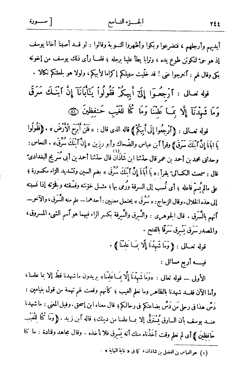قَوْلُهُ تَعَالَى: (ارْجِعُوا إِلى أَبِيكُمْ) قَالَهُ الَّذِي قَالَ:" فَلَنْ أَبْرَحَ الْأَرْضَ". (فَقُولُوا يَا أَبانا إِنَّ ابْنَكَ سَرَقَ) وَقَرَأَ ابْنُ عَبَّاسٍ وَالضَّحَّاكُ وَأَبُو رَزِينٍ" إِنَّ ابْنَكَ سُرِّقَ". النَّحَّاسُ: وَحَدَّثَنِي مُحَمَّدُ بْنُ أَحْمَدَ بْنِ عُمَرَ قَالَ حَدَّثَنَا ابْنُ شَاذَانَ «١» قَالَ حَدَّثَنَا أَحْمَدُ بْنُ أَبِي سُرَيْجٍ الْبَغْدَادِيُّ قَالَ: سَمِعْتُ، الْكِسَائِيَّ يَقْرَأُ:" يَا أَبانا إِنَّ ابْنَكَ سَرَقَ" بِضَمِّ السِّينِ وَتَشْدِيدِ الرَّاءِ مَكْسُورَةً، عَلَى مَا لَمْ يُسَمَّ فَاعِلُهُ، أَيْ نُسِبَ إِلَى السرقة ورمي بها، مثل خونته وفسقته وجرته إِذَا نَسَبْتُهُ إِلَى هَذِهِ الْخِلَالِ. وَقَالَ الزَّجَّاجُ:" سَرَقَ" يَحْتَمِلُ مَعْنَيَيْنِ: أَحَدُهُمَا- عُلِمَ مِنْهُ السَّرِقُ، وَالْآخَرُ- اتُّهِمَ بِالسَّرِقِ. قَالَ الْجَوْهَرِيُّ: وَالسَّرِقُ وَالسَّرِقَةُ بِكَسْرِ الرَّاءِ فِيهِمَا هُوَ اسْمُ الشَّيْءِ الْمَسْرُوقِ، وَالْمَصْدَرُ يَسْرِقُ سَرَقًا بِالْفَتْحِ. قَوْلُهُ تَعَالَى: (وَما شَهِدْنا إِلَّا بِما عَلِمْنا). فِيهِ أَرْبَعُ مَسَائِلَ: الْأُولَى- قَوْلُهُ تَعَالَى:" وَما شَهِدْنا إِلَّا بِما عَلِمْنا" يُرِيدُونَ مَا شَهِدْنَا قَطُّ إِلَّا بِمَا عَلِمْنَا، وَأَمَّا الْآنَ فَقَدْ شَهِدْنَا بِالظَّاهِرِ وَمَا نَعْلَمُ الْغَيْبَ، كَأَنَّهُمْ وَقَعَتْ لَهُمْ تُهْمَةٌ مِنْ قَوْلِ بِنْيَامِينَ: دَسَّ هَذَا فِي رَحْلِي مَنْ دَسَّ بِضَاعَتَكُمْ فِي رِحَالِكُمْ، قَالَ مَعْنَاهُ ابْنُ إِسْحَاقَ. وَقِيلَ الْمَعْنَى: مَا شَهِدْنَا عِنْدَ يُوسُفَ بِأَنَّ السَّارِقَ يُسْتَرَقُّ إِلَّا بِمَا عَلِمْنَا مِنْ دِينِكَ، قَالَهُ ابْنُ زَيْدٍ. (وَما كُنَّا لِلْغَيْبِ حافِظِينَ) أَيْ لَمْ نَعْلَمْ وَقْتَ أَخَذْنَاهُ مِنْكَ أَنَّهُ يَسْرِقُ فَلَا نَأْخُذُهُ. وَقَالَ مُجَاهِدٌ وَقَتَادَةُ: ما كنا