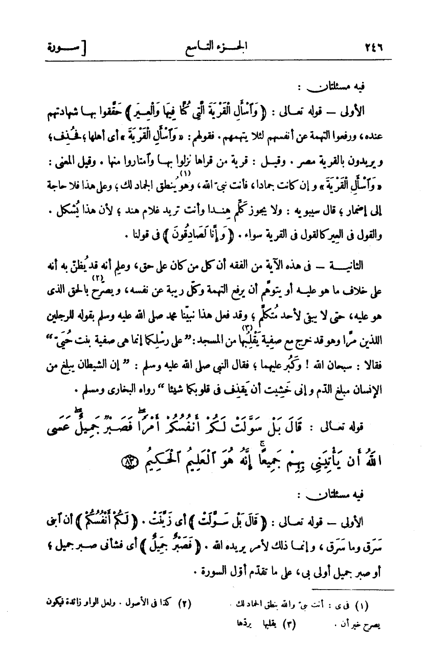 فِيهِ مَسْأَلَتَانِ: الْأُولَى- قَوْلُهُ تَعَالَى: (قالَ بَلْ سَوَّلَتْ) أَيْ زَيَّنَتْ. (لَكُمْ أَنْفُسُكُمْ) أَنَّ ابْنِي سَرَقَ وَمَا سَرَقَ، وَإِنَّمَا ذَلِكَ لِأَمْرٍ يُرِيدُهُ اللَّهُ. (فَصَبْرٌ جَمِيلٌ) أَيْ فَشَأْنِي صَبْرٌ جَمِيلٌ، أَوْ صَبْرٌ جَمِيلٌ أَوْلَى بِي، عَلَى مَا تَقَدَّمَ أَوَّلَ السُّورَةِ.