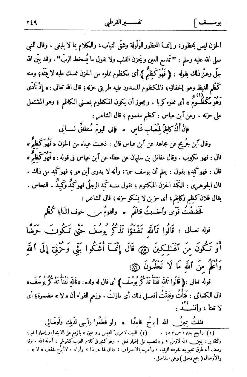 وَقَالَ ابْنُ جُرَيْجٍ عَنْ مُجَاهِدٍ عَنِ ابْنِ عَبَّاسٍ قَالَ: ذَهَبَتْ عَيْنَاهُ مِنَ الْحُزْنِ" فَهُوَ كَظِيمٌ" قَالَ: فَهُوَ مَكْرُوبٌ. وَقَالَ مُقَاتِلُ بْنُ سُلَيْمَانَ عَنْ عَطَاءٍ عَنِ ابْنِ عَبَّاسٍ فِي قَوْلِهِ:" فَهُوَ كَظِيمٌ" قَالَ: فَهُوَ كَمِدٌ، يَقُولُ: يَعْلَمُ أَنَّ يُوسُفَ حَيٌّ، وَأَنَّهُ لَا يَدْرِي أَيْنَ هُوَ، فَهُوَ كَمِدٌ مِنْ ذَلِكَ. قَالَ الْجَوْهَرِيُّ: الْكَمَدُ الْحُزْنُ الْمَكْتُومُ، تَقُولُ مِنْهُ كَمِدَ الرَّجُلُ فَهُوَ كَمِدٌ وَكَمِيدٌ. النَّحَّاسُ. يُقَالُ فُلَانٌ كَظِيمٌ وَكَاظِمٌ، أَيْ حَزِينٌ لَا يَشْكُو حُزْنَهُ، قَالَ الشَّاعِرُ: