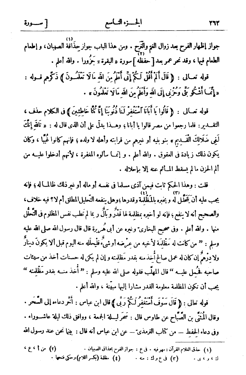 " [يوسف: ٨٦]. قَوْلُهُ تَعَالَى: (قالُوا يَا أَبانَا اسْتَغْفِرْ لَنا ذُنُوبَنا إِنَّا كُنَّا خاطِئِينَ) فِي الْكَلَامِ حَذْفٌ، التَّقْدِيرُ: فَلَمَّا رَجَعُوا مِنْ مِصْرَ قَالُوا يَا أَبَانَا، وَهَذَا يَدُلُّ عَلَى أَنَّ الَّذِي قَالَ لَهُ:" تَاللَّهِ إِنَّكَ لَفِي ضَلالِكَ الْقَدِيمِ" بَنُو بَنِيهِ أَوْ غَيْرُهُمْ مِنْ قَرَابَتِهِ وَأَهْلِهِ لَا وَلَدُهُ، فَإِنَّهُمْ كَانُوا غُيَّبًا، وَكَانَ يَكُونُ ذَلِكَ زِيَادَةً فِي الْعُقُوقِ. وَاللَّهُ أَعْلَمُ. وَإِنَّمَا سَأَلُوهُ الْمَغْفِرَةَ، لِأَنَّهُمْ أَدْخَلُوا عَلَيْهِ مِنْ أَلَمِ الْحُزْنِ مَا لَمْ يَسْقُطِ الْمَأْثَمُ عَنْهُ إِلَّا بِإِحْلَالِهِ. قُلْتُ: وَهَذَا الْحُكْمُ ثَابِتٌ فِيمَنْ آذَى مُسْلِمًا فِي نَفْسِهِ أَوْ مَالِهِ أَوْ غَيْرِ ذَلِكَ ظَالِمًا لَهُ، فَإِنَّهُ يَجِبُ عَلَيْهِ أَنْ يَتَحَلَّلَ لَهُ «٣» وَيُخْبِرَهُ بِالْمَظْلِمَةِ «٤» وَقَدْرِهَا، وَهَلْ يَنْفَعُهُ التَّحْلِيلُ الْمُطْلَقُ أَمْ لَا؟ فِيهِ خِلَافٌ، وَالصَّحِيحُ أَنَّهُ لَا يَنْفَعُ، فَإِنَّهُ لَوْ أَخْبَرَهُ بِمَظْلِمَةٍ لَهَا قَدْرٌ وَبَالٌ رُبَّمَا لَمْ تَطِبْ نَفْسُ الْمَظْلُومِ فِي التَّحَلُّلِ مِنْهَا. وَاللَّهُ أَعْلَمُ. وَفِي صَحِيحِ الْبُخَارِيِّ وَغَيْرِهِ عَنْ أَبِي هُرَيْرَةَ قَالَ قَالَ رَسُولُ صَلَّى اللَّهُ عَلَيْهِ وَسَلَّمَ:" مَنْ كَانَتْ لَهُ مظلمة لأخيه من عرضه أو شي فَلْيُحْلِلْهُ مِنْهُ الْيَوْمَ قَبْلَ أَلَّا يَكُونَ دِينَارٌ وَلَا دِرْهَمٌ إِنْ كَانَ لَهُ عَمَلٌ صَالِحٌ أُخِذَ مِنْهُ بِقَدْرِ مَظْلَمَتِهِ وَإِنْ لَمْ يَكُنْ لَهُ حَسَنَاتٌ أُخِذَ مِنْ سَيِّئَاتِ صَاحِبِهِ فَحُمِلَ عَلَيْهِ" قَالَ الْمُهَلَّبُ فَقَوْلُهُ صَلَّى اللَّهُ عَلَيْهِ وَسَلَّمَ:" أَخَذَ مِنْهُ بِقَدْرِ مَظْلِمَتِهِ" يَجِبُ أَنْ تَكُونَ الْمَظْلِمَةُ مَعْلُومَةَ الْقَدْرِ مُشَارًا إِلَيْهَا مُبَيَّنَةً، وَاللَّهُ أَعْلَمُ. قَوْلُهُ تَعَالَى: (قالَ سَوْفَ أَسْتَغْفِرُ لَكُمْ رَبِّي) قَالَ ابْنُ عَبَّاسٍ: أَخَّرَ دُعَاءَهُ إِلَى السَّحَرِ. وَقَالَ الْمُثَنَّى بْنُ الصَّبَّاحِ عَنْ طَاوُسٍ قَالَ: سَحَرُ لَيْلَةِ الْجُمْعَةِ، وَوَافَقَ ذَلِكَ لَيْلَةَ عَاشُورَاءَ. وَفِي دُعَاءِ الْحِفْظِ- مِنْ كِتَابِ التِّرْمِذِيِّ- عَنِ ابْنِ عَبَّاسٍ أَنَّهُ قَالَ: بَيْنَمَا نحن عند رسول الله