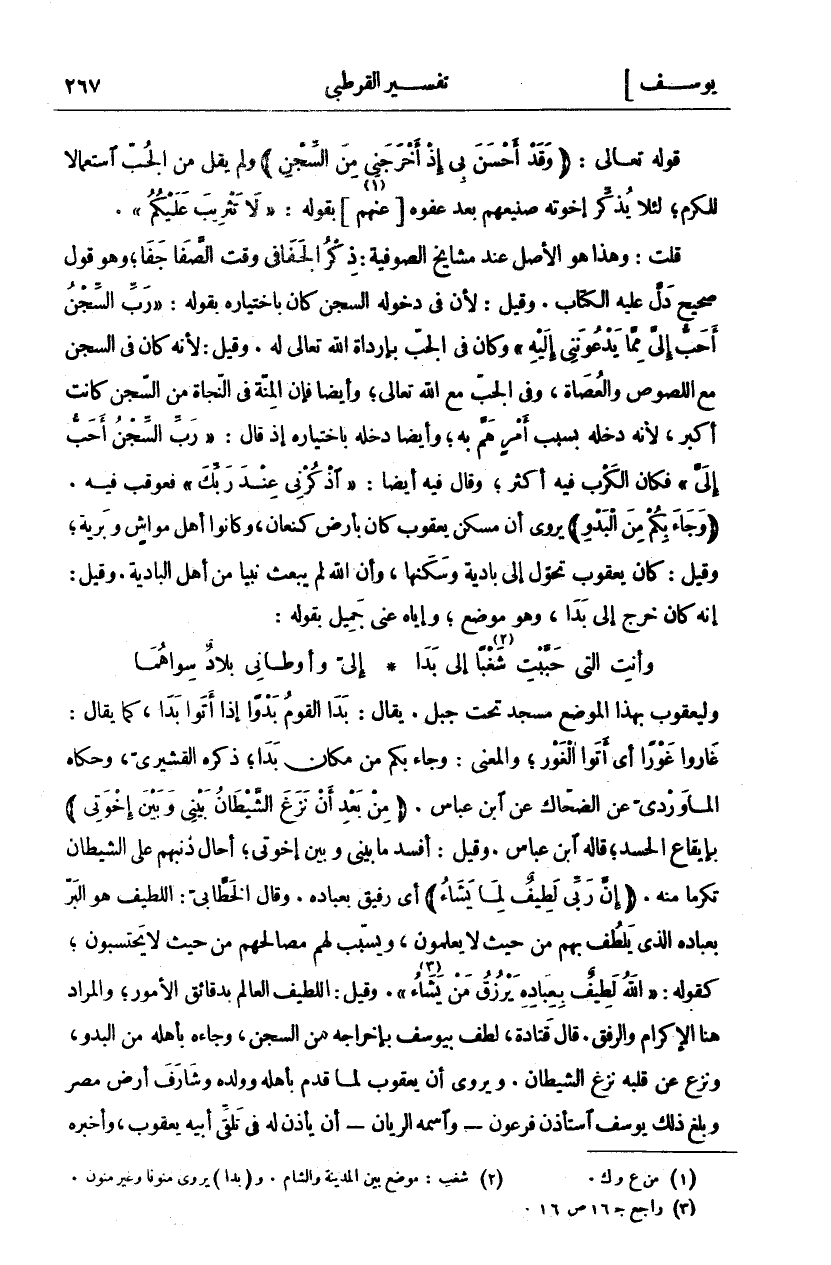 وَلِيَعْقُوبَ بِهَذَا الْمَوْضِعِ مَسْجِدٌ تَحْتَ جَبَلٍ. يُقَالُ: بَدَا الْقَوْمُ بَدْوًا إِذَا أَتَوْا بَدَا، كَمَا يُقَالُ: غَارُوا غَوْرًا أَيْ أَتَوُا الْغَوْرَ، وَالْمَعْنَى: وَجَاءَ بِكُمْ مِنْ مَكَانِ بَدَا، ذَكَرَهُ الْقُشَيْرِيُّ، وَحَكَاهُ الْمَاوَرْدِيُّ عَنِ الضَّحَّاكِ عَنِ ابْنِ عَبَّاسٍ. (مِنْ بَعْدِ أَنْ نَزَغَ الشَّيْطانُ بَيْنِي وَبَيْنَ إِخْوَتِي) بِإِيقَاعِ الْحَسَدِ، قَالَهُ ابْنُ عَبَّاسٍ. وَقِيلَ: أَفْسَدَ مَا بَيْنِي وَبَيْنَ إِخْوَتِي، أَحَالَ ذَنْبَهُمْ عَلَى الشَّيْطَانِ تَكَرُّمًا مِنْهُ. (إِنَّ رَبِّي لَطِيفٌ لِما يَشاءُ) أَيْ رَفِيقٌ بِعِبَادِهِ. وَقَالَ الْخَطَّابِيُّ: اللَّطِيفُ هُوَ الْبَرُّ بِعِبَادِهِ الَّذِي يَلْطُفُ بِهِمْ مِنْ حَيْثُ لَا يَعْلَمُونَ، وَيُسَبِّبُ لَهُمْ مَصَالِحَهُمْ مِنْ حَيْثُ لَا يَحْتَسِبُونَ، كَقَوْلِهِ:" اللَّهُ لَطِيفٌ بِعِبادِهِ يَرْزُقُ مَنْ يَشاءُ «٣» " [الشورى: ١٩]. وَقِيلَ: اللَّطِيفُ الْعَالِمُ بِدَقَائِقِ الْأُمُورِ، وَالْمُرَادُ هُنَا الْإِكْرَامُ وَالرِّفْقُ. قَالَ قَتَادَةُ، لَطَفَ بِيُوسُفَ بِإِخْرَاجِهِ مِنَ السِّجْنِ، وَجَاءَهُ بِأَهْلِهِ مِنَ الْبَدْوِ، وَنَزَعَ عَنْ قَلْبِهِ نَزْغَ الشَّيْطَانِ. وَيُرْوَى أَنَّ يَعْقُوبَ لَمَّا قَدِمَ بِأَهْلِهِ وَوَلَدِهِ وَشَارَفَ أَرْضَ مِصْرَ وَبَلَغَ ذَلِكَ يُوسُفَ اسْتَأْذَنَ فِرْعَوْنَ- وَاسْمُهُ الرَّيَّانُ- أَنْ يَأْذَنَ لَهُ فِي تَلَقِّي أَبِيهِ يَعْقُوبَ، وأخبره