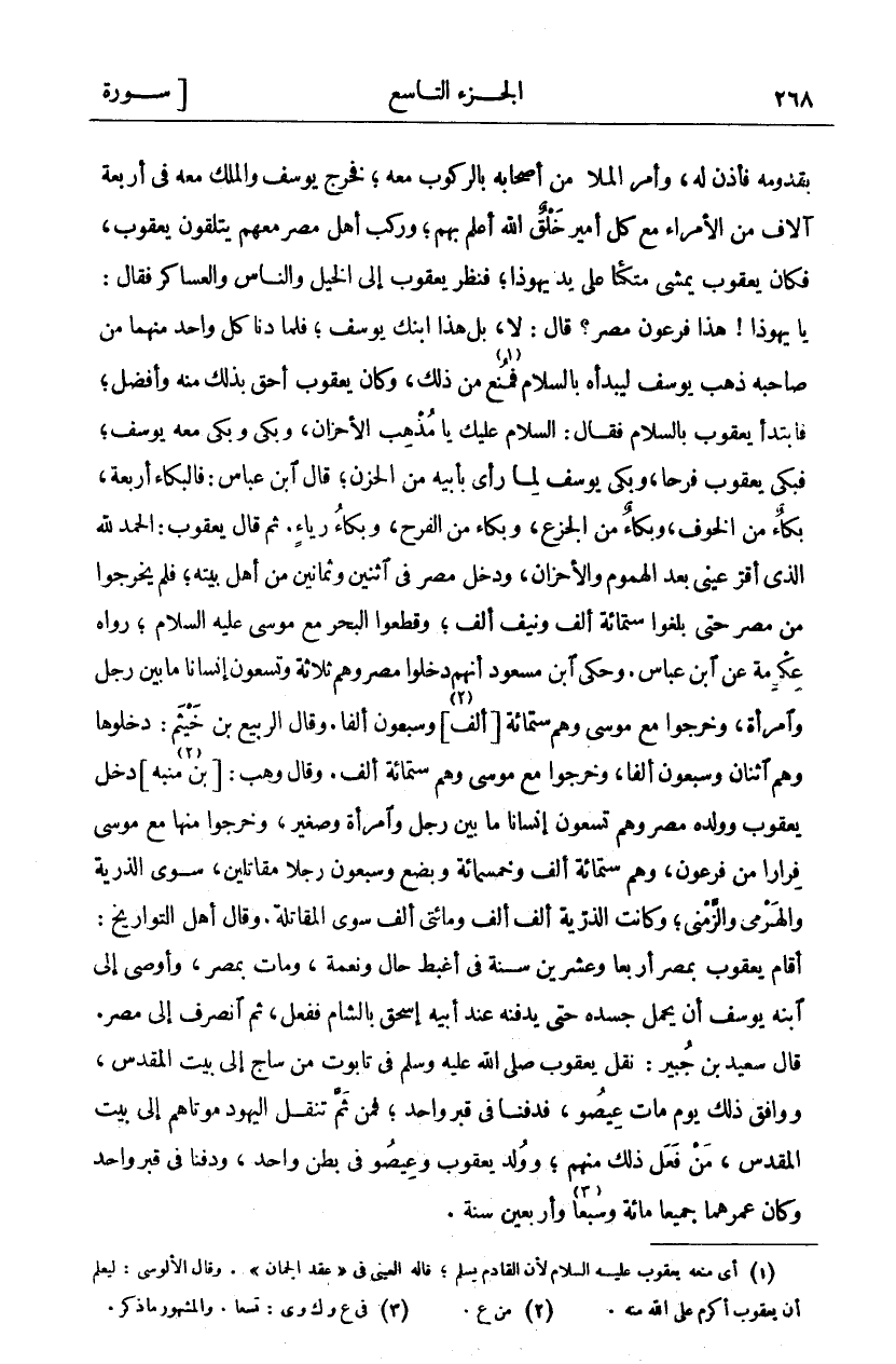 قدومه فَأَذِنَ لَهُ، وَأَمَرَ الْمَلَأَ مِنْ أَصْحَابِهِ بِالرُّكُوبِ مَعَهُ، فَخَرَجَ يُوسُفُ وَالْمَلِكُ مَعَهُ فِي أَرْبَعَةِ آلَافٍ مِنَ الْأُمَرَاءِ مَعَ كُلِّ أَمِيرٍ خَلْقٌ اللَّهُ أَعْلَمُ بِهِمْ، وَرَكِبَ أَهْلُ مِصْرَ مَعَهُمْ يَتَلَقَّوْنَ يَعْقُوبَ، فَكَانَ يَعْقُوبُ يَمْشِي مُتَّكِئًا عَلَى يَدِ يَهُوذَا، فَنَظَرَ يَعْقُوبُ إِلَى الْخَيْلِ وَالنَّاسِ وَالْعَسَاكِرِ فَقَالَ: يَا يَهُوذَا! هَذَا فِرْعَوْنُ مِصْرَ؟ قَالَ: لَا، بَلْ هَذَا ابْنُكَ يُوسُفُ، فَلَمَّا دَنَا كُلُّ وَاحِدٍ مِنْهُمَا مِنْ صَاحِبِهِ ذَهَبَ يُوسُفُ لِيَبْدَأهُ بِالسَّلَامِ فَمُنِعَ «١» مِنْ ذَلِكَ، وَكَانَ يَعْقُوبُ أَحَقَّ بِذَلِكَ مِنْهُ وَأَفْضَلَ، فَابْتَدَأَ يَعْقُوبُ بِالسَّلَامِ فَقَالَ: السَّلَامُ عَلَيْكَ يَا مُذْهِبَ الْأَحْزَانِ، وَبَكَى وَبَكَى مَعَهُ يُوسُفُ، فَبَكَى يَعْقُوبُ فَرَحًا، وَبَكَى يُوسُفُ لِمَا رَأَى بِأَبِيهِ مِنَ الْحُزْنِ، قَالَ ابْنُ عَبَّاسٍ: فَالْبُكَاءُ أَرْبَعَةٌ، بُكَاءٌ مِنَ الْخَوْفِ، وَبُكَاءٌ مِنَ الْجَزَعِ، وَبُكَاءٌ مِنَ الْفَرَحِ، وَبُكَاءُ رِيَاءٍ. ثُمَّ قَالَ يَعْقُوبُ: الْحَمْدُ لِلَّهِ الَّذِي أَقَرَّ عَيْنَيَّ بَعْدَ الْهُمُومِ وَالْأَحْزَانِ، وَدَخَلَ مِصْرَ فِي اثْنَيْنِ وَثَمَانِينَ مِنْ أَهْلِ بَيْتِهِ، فَلَمْ يَخْرُجُوا مِنْ مِصْرَ حَتَّى بَلَغُوا سِتَّمِائَةِ أَلْفٍ وَنَيِّفَ أَلْفٍ، وَقَطَعُوا الْبَحْرَ مَعَ مُوسَى عَلَيْهِ السَّلَامُ، رَوَاهُ عِكْرِمَةُ عَنِ ابْنِ عَبَّاسٍ. وَحَكَى ابْنُ مَسْعُودٍ أَنَّهُمْ دَخَلُوا مِصْرَ وَهُمْ ثَلَاثَةٌ وَتِسْعُونَ إِنْسَانًا مَا بَيْنَ رَجُلٍ وَامْرَأَةٍ، وَخَرَجُوا مَعَ مُوسَى وَهُمْ سِتُّمِائَةِ [أَلْفٍ] «٢» وَسَبْعُونَ أَلْفًا. وَقَالَ الرَّبِيعُ بْنُ خَيْثَمٍ: دَخَلُوهَا وَهُمُ اثْنَانِ وَسَبْعُونَ أَلْفًا، وَخَرَجُوا مَعَ مُوسَى وَهُمْ سِتُّمِائَةِ أَلْفٍ. وَقَالَ وَهْبُ: [بْنُ مُنَبِّهٍ] «٣» دَخَلَ يَعْقُوبُ وَوَلَدُهُ مِصْرَ وَهُمْ تِسْعُونَ إِنْسَانًا مَا بَيْنَ رَجُلٍ وَامْرَأَةٍ وَصَغِيرٍ، وَخَرَجُوا مِنْهَا مَعَ مُوسَى فِرَارًا مِنْ فِرْعَوْنَ، وَهُمْ سِتُّمِائَةِ أَلْفٍ وخمسمائة وبضع وسبعون رجل مُقَاتِلِينَ، سِوَى الذُّرِّيَّةِ وَالْهَرْمَى وَالزَّمْنَى، وَكَانَتِ الذُّرِّيَّةُ أَلْفُ أَلْفٍ وَمِائَتَيْ أَلْفٍ سِوَى الْمُقَاتِلَةِ، وَقَالَ أَهْلُ التَّوَارِيخِ: أَقَامَ يَعْقُوبُ بِمِصْرَ أَرْبَعًا وَعِشْرِينَ سَنَةً فِي أَغْبَطِ حَالٍ وَنِعْمَةٍ، وَمَاتَ بِمِصْرَ، وَأَوْصَى إِلَى ابْنِهِ يُوسُفَ أَنْ يَحْمِلَ جَسَدَهُ حَتَّى يَدْفِنَهُ عِنْدَ أَبِيهِ إِسْحَاقَ بِالشَّامِ فَفَعَلَ، ثُمَّ انْصَرَفَ إِلَى مِصْرَ. قَالَ سَعِيدُ بْنُ جُبَيْرٍ: نُقِلَ يَعْقُوبُ صَلَّى اللَّهُ عَلَيْهِ وَسَلَّمَ فِي تَابُوتٍ مِنْ سَاجٍ إِلَى بَيْتِ الْمَقْدِسِ، وَوَافَقَ ذَلِكَ يَوْمَ مَاتَ عِيصُو، فَدُفِنَا فِي قَبْرٍ وَاحِدٍ، فَمِنْ ثَمَّ تَنْقُلُ الْيَهُودُ مَوْتَاهُمْ إِلَى بَيْتِ الْمَقْدِسِ، مَنْ فَعَلَ ذَلِكَ مِنْهُمْ، وَوُلِدَ يَعْقُوبُ وَعِيصُو فِي بَطْنٍ وَاحِدٍ، وَدُفِنَا فِي قَبْرٍ وَاحِدٍ وَكَانَ عُمْرُهُمَا جَمِيعًا مِائَةً وسبعا «٤» وأربعين سنة.
