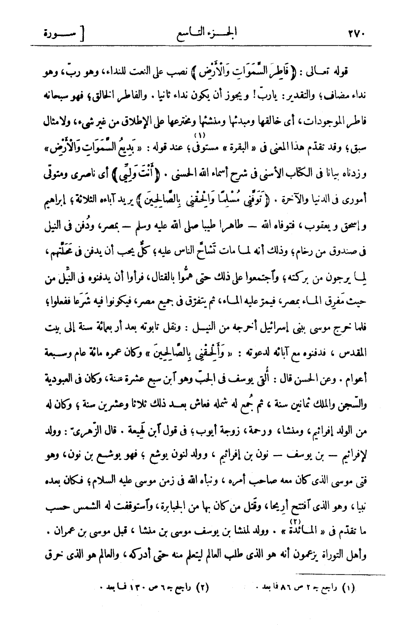 قَوْلُهُ تَعَالَى: (فاطِرَ السَّماواتِ وَالْأَرْضِ) نُصِبَ عَلَى النَّعْتِ لِلنِّدَاءِ، وَهُوَ رَبِّ، وَهُوَ نِدَاءٌ مُضَافٌ، وَالتَّقْدِيرُ: يَا رَبِّ! وَيَجُوزُ أَنْ يَكُونَ نِدَاءً ثَانِيًا. وَالْفَاطِرُ الْخَالِقُ، فَهُوَ سُبْحَانُهُ فَاطِرُ الْمَوْجُودَاتِ، أَيْ خَالِقُهَا وَمُبْدِئُهَا وَمُنْشِئُهَا وَمُخْتَرِعُهَا عَلَى الْإِطْلَاقِ من غير شي، وَلَا مِثَالٍ سَبَقَ، وَقَدْ تَقَدَّمَ هَذَا الْمَعْنَى فِي" الْبَقَرَةِ" مُسْتَوْفًى «١»، عِنْدَ قَوْلِهِ:" بَدِيعُ السَّماواتِ وَالْأَرْضِ" [البقرة: ١١٧] وَزِدْنَاهُ بَيَانًا فِي الْكِتَابِ الْأَسْنَى فِي شَرْحِ أَسْمَاءِ اللَّهِ الْحُسْنَى. (أَنْتَ وَلِيِّي) أَيْ نَاصِرِي وَمُتَوَلِّي أُمُورِي فِي الدُّنْيَا وَالْآخِرَةِ. (تَوَفَّنِي مُسْلِماً وَأَلْحِقْنِي بِالصَّالِحِينَ) يُرِيدُ آبَاءَهُ الثَّلَاثَةَ، إِبْرَاهِيمَ وَإِسْحَاقَ وَيَعْقُوبَ، فَتَوَفَّاهُ اللَّهُ- طَاهِرًا طَيِّبًا صَلَّى اللَّهُ عَلَيْهِ وَسَلَّمَ- بِمِصْرَ، وَدُفِنَ فِي النِّيلِ فِي صُنْدُوقٍ مِنْ رُخَامٍ، وَذَلِكَ أَنَّهُ لَمَّا مَاتَ تَشَاحَّ النَّاسُ عَلَيْهِ، كُلٌّ يُحِبُّ أَنْ يُدْفَنَ فِي مَحَلَّتِهِمْ، لِمَا يَرْجُونَ مِنْ بَرَكَتِهِ، وَاجْتَمَعُوا عَلَى ذَلِكَ حَتَّى هَمُّوا بِالْقِتَالِ، فَرَأَوْا أَنْ يَدْفِنُوهُ فِي النِّيلَ مِنْ حَيْثُ مَفْرِقُ الْمَاءِ بِمِصْرَ، فَيَمُرُّ عَلَيْهِ الْمَاءُ، ثُمَّ يَتَفَرَّقُ فِي جَمِيعِ مِصْرَ، فَيَكُونُوا فِيهِ شَرَعًا فَفَعَلُوا، فَلَمَّا خَرَجَ مُوسَى بِبَنِي إِسْرَائِيلَ أَخْرَجَهُ مِنَ النِّيلِ: وَنَقَلَ تَابُوتَهُ بَعْدَ أَرْبَعِمِائَةِ سَنَةٍ إِلَى بَيْتِ الْمَقْدِسِ، فَدَفَنُوهُ مَعَ آبَائِهِ لِدَعْوَتِهِ:" وَأَلْحِقْنِي بِالصَّالِحِينَ" وَكَانَ عُمْرُهُ مِائَةَ عَامٍ وَسَبْعَةَ أَعْوَامٍ. وَعَنِ الْحَسَنِ قَالَ: أُلْقِيَ يُوسُفُ فِي الْجُبِّ وَهُوَ ابْنُ سَبْعَ عَشْرَةَ سَنَةً، وَكَانَ فِي الْعُبُودِيَّةِ وَالسِّجْنِ وَالْمُلْكِ ثَمَانِينَ سَنَةً، ثُمَّ جُمِعَ لَهُ شَمْلُهُ فَعَاشَ بَعْدَ ذَلِكَ ثَلَاثًا وَعِشْرِينَ سَنَةً، وَكَانَ لَهُ مِنَ الْوَلَدِ إِفْرَاثِيمُ، وَمَنْشَا، وَرَحْمَةُ، زَوْجَةُ أَيُّوبَ، فِي قَوْلِ ابْنِ لَهِيعَةَ. قَالَ الزُّهْرِيُّ: وَوُلِدَ لِإِفْرَاثِيمَ- بْنِ يُوسُفَ- نُونُ بْنُ إِفْرَاثِيمَ، وَوُلِدَ لِنُونٍ يُوشَعُ، فَهُوَ يُوشَعُ بْنُ نُونٍ، وَهُوَ فَتَى مُوسَى الَّذِي كَانَ مَعَهُ صَاحِبُ أَمْرِهِ، وَنَبَّأَهُ اللَّهُ فِي زَمَنِ مُوسَى عَلَيْهِ السَّلَامُ، فَكَانَ بَعْدَهُ نَبِيًّا، وَهُوَ الَّذِي افْتَتَحَ أَرِيحَا، وَقَتَلَ مَنْ كَانَ بِهَا مِنَ الْجَبَابِرَةِ، وَاسْتَوْقِفَتْ لَهُ الشَّمْسُ حَسَبَ مَا تَقَدَّمَ فِي" الْمَائِدَةِ" «٢». وَوُلِدَ لَمَنْشَا بْنِ يُوسُفَ مُوسَى بْنُ مَنْشَا، قَبْلَ مُوسَى بْنِ عِمْرَانَ. وَأَهْلُ التَّوْرَاةِ يَزْعُمُونَ أَنَّهُ هُوَ الَّذِي طَلَبَ الْعَالِمَ لِيَتَعَلَّمَ مِنْهُ حَتَّى أَدْرَكَهُ، وَالْعَالِمُ هُوَ الَّذِي خرق