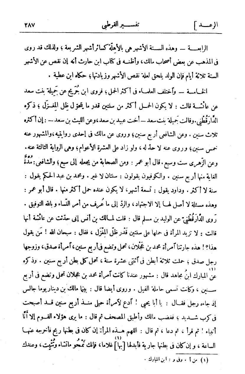 الرَّابِعَةُ- وَهَذِهِ السِّتَّةُ الْأَشْهُرُ هِيَ بِالْأَهِلَّةِ كَسَائِرِ أَشْهُرِ الشَّرِيعَةِ، وَلِذَلِكَ قَدْ رُوِيَ فِي الْمَذْهَبِ عَنْ بَعْضِ أَصْحَابِ مَالِكٍ، وَأَظُنُّهُ فِي كِتَابِ ابْنِ حَارِثٍ أَنَّهُ إِنْ نَقَصَ عَنِ الْأَشْهُرِ السِّتَّةِ ثَلَاثَةُ أَيَّامٍ فَإِنَّ الْوَلَدَ يَلْحَقُ لِعِلَّةِ نَقْصِ الْأَشْهُرِ وَزِيَادَتِهَا، حَكَاهُ ابْنُ عَطِيَّةَ. الْخَامِسَةُ- وَاخْتَلَفَ الْعُلَمَاءُ فِي أَكْثَرِ الْحَمْلِ، فَرَوَى ابْنُ جُرَيْجٍ عَنْ جَمِيلَةَ بِنْتِ سَعْدٍ عَنْ عَائِشَةَ قَالَتْ: يَكُونُ الْحَمْلُ أَكْثَرَ مِنْ سَنَتَيْنِ قَدْرَ مَا يَتَحَوَّلُ ظِلُّ الْمِغْزَلِ، ذَكَرَهُ الدَّارَقُطْنِيُّ. وَقَالَتْ جَمِيلَةُ بِنْتُ سَعْدٍ- أُخْتُ عُبَيْدِ بْنِ سَعْدٍ، وَعَنِ اللَّيْثِ بْنِ سَعْدٍ-: إِنَّ أَكْثَرَهُ ثَلَاثُ سِنِينَ. وَعَنِ الشَّافِعِيِّ أَرْبَعُ سِنِينَ، وَرُوِيَ عَنْ مَالِكٍ فِي إِحْدَى رِوَايَتَيْهِ، وَالْمَشْهُورُ عَنْهُ خَمْسُ سِنِينَ، وَرُوِيَ عَنْهُ لَا حَدَّ لَهُ، وَلَوْ زَادَ عَلَى الْعَشَرَةِ الْأَعْوَامِ، وَهِيَ الرِّوَايَةُ الثَّالِثَةُ عَنْهُ. وَعَنِ الزُّهْرِيِّ سِتٌّ وَسَبْعٌ. قَالَ أَبُو عُمَرَ: وَمِنَ الصَّحَابَةِ مَنْ يَجْعَلُهُ إِلَى سَبْعٍ، وَالشَّافِعِيُّ: مُدَّةُ الْغَايَةِ مِنْهَا أَرْبَعُ سِنِينَ. وَالْكُوفِيُّونَ يَقُولُونَ: سَنَتَانِ لَا غَيْرَ. وَمُحَمَّدُ بْنُ عَبْدِ الْحَكَمِ يَقُولُ: سَنَةٌ لَا أَكْثَرَ. وَدَاوُدُ يَقُولُ: تِسْعَةُ أَشْهُرٍ، لَا يَكُونُ عِنْدَهُ حَمْلٌ أَكْثَرَ مِنْهَا. قَالَ أَبُو عُمَرَ: وَهَذِهِ مَسْأَلَةٌ لَا أَصْلَ لَهَا إِلَّا الِاجْتِهَادُ، وَالرَّدُّ إِلَى مَا عُرِفَ مِنْ أَمْرِ النِّسَاءِ وَبِاللَّهِ التَّوْفِيقُ. رَوَى الدَّارَقُطْنِيُّ عَنِ الْوَلِيدِ بْنِ مُسْلِمٍ قَالَ: قُلْتُ لمالك ابن أَنَسٍ إِنِّي حُدِّثْتُ عَنْ عَائِشَةَ أَنَّهَا قَالَتْ: لَا تَزِيدُ الْمَرْأَةُ فِي حَمْلِهَا عَلَى سَنَتَيْنِ قَدْرَ ظِلِّ الْمِغْزَلِ، فَقَالَ: سُبْحَانَ اللَّهِ! مَنْ يَقُولُ هَذَا؟! هَذِهِ جَارَتُنَا امْرَأَةُ مُحَمَّدِ بْنِ عَجْلَانَ، تَحْمِلُ وَتَضَعُ فِي أَرْبَعِ سِنِينَ، امْرَأَةُ صِدْقٍ، وَزَوْجُهَا رَجُلُ صِدْقٍ، حَمَلَتْ ثَلَاثَةَ أَبْطُنٍ فِي اثْنَتَيْ عَشْرَةَ سَنَةٍ، تَحْمِلُ كُلَّ بَطْنٍ أربع سنين. وذكره عن «١» المبارك ابن مُجَاهِدٍ قَالَ: مَشْهُورٌ عِنْدَنَا كَانَتِ امْرَأَةُ مُحَمَّدِ ابن عَجْلَانَ تَحْمِلُ وَتَضَعُ فِي أَرْبَعِ سِنِينَ، وَكَانَتْ تُسَمَّى حَامِلَةُ الْفِيلِ. وَرَوَى أَيْضًا قَالَ: بَيْنَمَا مَالِكُ بْنُ دِينَارٍ يَوْمًا جَالِسٌ إِذْ جَاءَهُ رَجُلٌ فَقَالَ: يَا أَبَا يَحْيَى! ادْعُ لِامْرَأَةٍ حُبْلَى مُنْذُ أَرْبَعِ سِنِينَ قَدْ أَصْبَحَتْ فِي كَرْبٍ شَدِيدٍ، فَغَضِبَ مَالِكٌ وَأَطْبَقَ الْمُصْحَفَ ثُمَّ قَالَ: مَا يَرَى هَؤُلَاءِ الْقَوْمُ إِلَّا أَنَّا أَنْبِيَاءُ! ثُمَّ قَرَأَ، ثُمَّ دَعَا، ثُمَّ قَالَ: اللَّهُمَّ هَذِهِ الْمَرْأَةُ إِنْ كَانَ فِي بَطْنِهَا رِيحٌ فَأَخْرِجْهُ عَنْهَا السَّاعَةَ، وَإِنْ كَانَ فِي بَطْنِهَا جَارِيَةً فَأَبْدِلْهَا [بِهَا] «٢» غُلَامًا، فَإِنَّكَ تَمْحُو ما تشاء وتثبت، وعندك