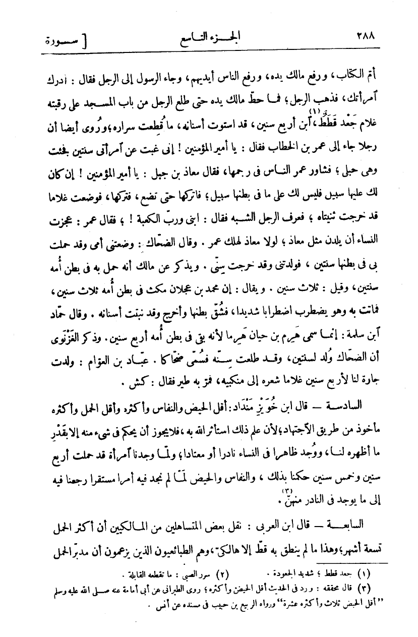 أُمُّ الْكِتَابِ، وَرَفَعَ مَالِكٌ يَدَهُ، وَرَفَعَ النَّاسُ أَيْدِيَهُمْ، وَجَاءَ الرَّسُولُ إِلَى الرَّجُلِ فَقَالَ: أَدْرِكِ امْرَأَتَكَ، فَذَهَبَ الرَّجُلُ، فَمَا حَطَّ مَالِكٌ يَدَهُ حَتَّى طَلَعَ الرَّجُلُ مِنْ بَابِ الْمَسْجِدِ عَلَى رَقَبَتِهِ غُلَامٌ جَعْدٌ قَطَطٌ «١»، ابْنُ أَرْبَعِ سِنِينَ، قَدِ اسْتَوَتْ أَسْنَانُهُ، مَا قُطِعَتْ سِرَارُهُ «٢»، وَرُوِيَ أَيْضًا أَنَّ رَجُلًا جَاءَ إِلَى عُمَرَ بْنِ الْخَطَّابِ فَقَالَ: يَا أَمِيرَ الْمُؤْمِنِينَ! إِنِّي غِبْتُ عَنِ امْرَأَتِي سَنَتَيْنِ فَجِئْتُ وَهِيَ حُبْلَى، فَشَاوَرَ عُمَرُ النَّاسَ فِي رَجْمِهَا، فَقَالَ مُعَاذُ بْنُ جَبَلٍ: يَا أَمِيرَ الْمُؤْمِنِينَ! إِنْ كَانَ لَكَ عَلَيْهَا سَبِيلٌ فَلَيْسَ لَكَ عَلَى مَا فِي بَطْنِهَا سَبِيلٌ، فَاتْرُكْهَا حَتَّى تَضَعَ، فَتَرَكَهَا، فَوَضَعَتْ غُلَامًا قَدْ خَرَجَتْ ثَنِيَّتَاهُ، فَعَرَفَ الرَّجُلُ الشَّبَهَ فَقَالَ: ابْنِي وَرَبِّ الْكَعْبَةِ!، فَقَالَ عُمَرُ: عَجَزَتِ النِّسَاءُ أَنْ يَلِدْنَ مِثْلَ مُعَاذٍ، لَوْلَا مُعَاذٌ لَهَلَكَ عُمَرُ. وَقَالَ الضَّحَّاكُ: وَضَعْتِنِي أُمِّي وَقَدْ حَمَلَتْ بِي فِي بَطْنِهَا سَنَتَيْنِ، فَوَلَدَتْنِي وَقَدْ خَرَجَتْ سِنِّي. وَيُذْكَرُ عَنْ مَالِكٍ أَنَّهُ حُمِلَ بِهِ فِي بَطْنِ أُمِّهِ سَنَتَيْنِ، وَقِيلَ: ثَلَاثَ سِنِينَ. وَيُقَالُ: إِنَّ مُحَمَّدَ بْنَ عَجْلَانَ مَكَثَ فِي بَطْنِ أُمِّهِ ثَلَاثَ سِنِينَ، فَمَاتَتْ بِهِ وَهُوَ يَضْطَرِبُ اضْطِرَابًا شَدِيدًا، فَشُقَّ بَطْنُهَا وَأُخْرِجَ وَقَدْ نَبَتَتْ أَسْنَانُهُ. وَقَالَ حَمَّادُ بْنُ سَلَمَةَ: إِنَّمَا سُمِّيَ هَرِمُ بْنُ حَيَّانَ هَرِمًا لِأَنَّهُ بَقِيَ فِي بَطْنِ أُمِّهِ أَرْبَعَ سِنِينَ. وَذَكَرَ الْغَزْنَوِيُّ أَنَّ الضَّحَّاكَ وُلِدَ لِسَنَتَيْنِ، وَقَدْ طَلَعَتْ سنه فسمي ضحاكا. عَبَّادُ بْنُ الْعَوَامِّ: وَلَدَتْ جَارَةٌ لَنَا لِأَرْبَعِ سِنِينَ غُلَامًا شَعْرُهُ إِلَى مَنْكِبَيْهِ، فَمَرَّ بِهِ طَيْرٌ فَقَالَ: كَشَّ. السَّادِسَةُ- قَالَ ابْنُ خُوَيْزِ مَنْدَادَ: أَقَلُّ الْحَيْضِ وَالنِّفَاسِ وَأَكْثَرُهُ وَأَقَلُّ الْحَمْلِ وَأَكْثَرُهُ مَأْخُوذٌ مِنْ طَرِيقِ الِاجْتِهَادِ، لِأَنَّ عِلْمَ ذَلِكَ اسْتَأْثَرَ اللَّهُ بِهِ، فَلَا يَجُوزُ أَنْ يحكم في شي مِنْهُ إِلَّا بِقَدْرِ مَا أَظْهَرُهُ لَنَا، وَوُجِدَ ظَاهِرًا فِي النِّسَاءِ نَادِرًا أَوْ مُعْتَادًا، وَلَمَّا وَجَدْنَا امْرَأَةً قَدْ حَمَلَتْ أَرْبَعَ سِنِينَ وَخَمْسَ سِنِينَ حَكَمْنَا بِذَلِكَ، وَالنِّفَاسُ وَالْحَيْضُ لَمَّا لَمْ نَجِدْ فِيهِ أَمْرًا مُسْتَقْرَأً رَجَعْنَا فِيهِ إِلَى مَا يُوجَدُ فِي النَّادِرِ مِنْهُنَّ «٣». السَّابِعَةُ- قَالَ ابْنُ الْعَرَبِيِّ: نَقَلَ بَعْضُ الْمُتَسَاهِلِينَ مِنَ الْمَالِكِيِّينَ أَنَّ أَكْثَرَ الْحَمْلِ تِسْعَةُ أَشْهُرٍ، وَهَذَا مَا لم ينطق به قط إلا هالكي، وَهُمُ الطَّبَائِعِيُّونَ الَّذِينَ يَزْعُمُونَ أَنَّ مُدَبِّرَ الْحَمْلِ