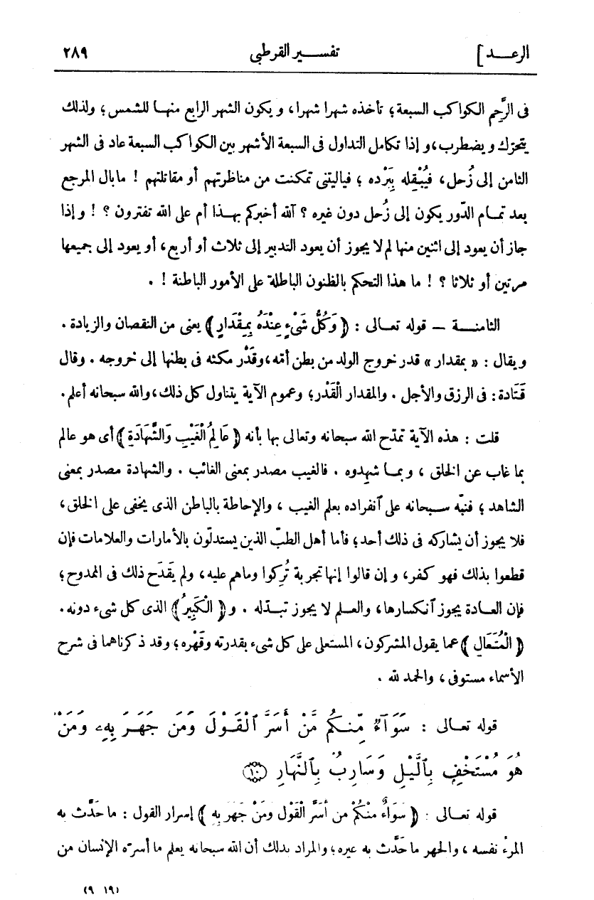 فِي الرَّحِمِ الْكَوَاكِبُ السَّبْعَةُ، تَأْخُذُهُ شَهْرًا شَهْرًا، وَيَكُونُ الشَّهْرُ الرَّابِعُ مِنْهَا لِلشَّمْسِ، وَلِذَلِكَ يَتَحَرَّكُ وَيَضْطَرِبُ، وَإِذَا تَكَامَلَ التَّدَاوُلُ فِي السَّبْعَةِ الْأَشْهُرِ بَيْنَ الْكَوَاكِبِ السَّبْعَةِ عَادَ فِي الشَّهْرِ الثَّامِنِ إِلَى زُحَلَ، فَيُبْقِلُهُ بِبَرْدِهِ، فَيَا لَيْتَنِي تَمَكَّنْتُ مِنْ مُنَاظَرَتِهِمْ أَوْ مُقَاتَلَتِهِمْ! مَا بَالُ الْمَرْجِعِ بَعْدَ تَمَامِ الدَّوْرِ يَكُونُ إِلَى زُحَلَ دُونَ غَيْرِهِ؟ اللَّهُ أَخْبَرَكُمْ بِهَذَا أَمْ عَلَى اللَّهِ تَفْتَرُونَ؟! وَإِذَا جَازَ أَنْ يَعُودَ إِلَى اثْنَيْنِ مِنْهَا لِمَ لَا يَجُوزُ أَنْ يَعُودَ التَّدْبِيرُ إِلَى ثَلَاثٍ أَوْ أَرْبَعٍ، أَوْ يَعُودُ إِلَى جَمِيعِهَا مَرَّتَيْنِ أَوْ ثَلَاثًا؟! مَا هَذَا التَّحَكُّمُ بِالظُّنُونِ الْبَاطِلَةِ عَلَى الْأُمُورِ الْبَاطِنَةِ!. الثَّامِنَةُ- قَوْلُهُ تَعَالَى: (وَكُلُّ شَيْءٍ عِنْدَهُ بِمِقْدارٍ) يَعْنِي مِنَ النُّقْصَانِ وَالزِّيَادَةِ. وَيُقَالُ:" بِمِقْدارٍ" قَدْرِ خُرُوجِ الْوَلَدِ من بطن أمه، وقد مُكْثِهِ فِي بَطْنِهَا إِلَى خُرُوجِهِ. وَقَالَ قَتَادَةُ: فِي الرِّزْقِ وَالْأَجَلِ. وَالْمِقْدَارُ الْقَدْرُ، وَعُمُومُ الْآيَةِ يَتَنَاوَلُ كُلَّ ذَلِكَ، وَاللَّهُ سُبْحَانَهُ أَعْلَمُ. قُلْتُ: هَذِهِ الْآيَةُ تَمَدَّحَ اللَّهُ سُبْحَانَهُ وَتَعَالَى بِهَا بِأَنَّهُ (عالِمُ الْغَيْبِ وَالشَّهادَةِ) أَيْ هُوَ عَالِمٌ بِمَا غَابَ عَنِ الْخَلْقِ، وَبِمَا شَهِدُوهُ. فَالْغَيْبُ مَصْدَرٌ بِمَعْنَى الْغَائِبِ. وَالشَّهَادَةُ مَصْدَرٌ بِمَعْنَى الشَّاهِدِ، فَنَبَّهَ سُبْحَانَهُ عَلَى انْفِرَادِهِ بِعِلْمِ الْغَيْبِ، وَالْإِحَاطَةِ بِالْبَاطِنِ الَّذِي يَخْفَى عَلَى الْخَلْقِ، فَلَا يَجُوزُ أَنْ يُشَارِكَهُ فِي ذَلِكَ أَحَدٌ، فَأَمَّا أَهْلُ الطِّبِّ الَّذِينَ يَسْتَدِلُّونَ بِالْأَمَارَاتِ وَالْعَلَامَاتِ فَإِنْ قَطَعُوا بِذَلِكَ فَهُوَ كُفْرٌ، وَإِنْ قَالُوا إِنَّهَا تَجْرِبَةٌ تُرِكُوا وَمَا هُمْ عَلَيْهِ، وَلَمْ يَقْدَحْ ذَلِكَ فِي الْمَمْدُوحِ، فَإِنَّ الْعَادَةَ يَجُوزُ انْكِسَارُهَا، وَالْعِلْمُ لَا يَجُوزُ تَبَدُّلُهُ. وَ (الْكَبِيرُ) الَّذِي كُلُّ شي دُونَهُ. (الْمُتَعالِ) عَمَّا يَقُولُ الْمُشْرِكُونَ، الْمُسْتَعْلِي عَلَى كل شي بِقُدْرَتِهِ وَقَهْرِهِ، وَقَدْ ذَكَرْنَاهُمَا فِي شَرْحِ الْأَسْمَاءِ مستوفى، والحمد لله.