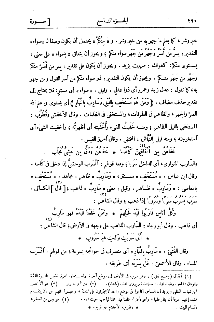 خَيْرٍ وَشَرٍّ، كَمَا يَعْلَمُ مَا جَهَرَ بِهِ مِنْ خَيْرٍ وَشَرٍّ. وَ" مِنْكُمْ" يَحْتَمِلُ أَنْ يَكُونَ وَصْفًا لِ" سَواءٌ" التَّقْدِيرُ: سِرُّ مَنْ أَسَرَّ وَجَهْرُ مَنْ جَهَرَ سَوَاءٌ مِنْكُمْ، وَيَجُوزُ أن يتعلق" بسواء" عَلَى مَعْنَى: يَسْتَوِي مِنْكُمْ، كَقَوْلِكَ: مَرَرْتُ بِزَيْدٍ. وَيَجُوزُ أَنْ يَكُونَ عَلَى تَقْدِيرِ: سِرُّ مَنْ أَسَرَّ مِنْكُمْ وَجَهْرُ مَنْ جَهَرَ مِنْكُمْ. وَيَجُوزُ أَنْ يَكُونَ التَّقْدِيرُ: ذُو سَوَاءٍ مِنْكُمْ مَنْ أَسَرَّ الْقَوْلَ وَمَنْ جَهَرَ بِهِ، كَمَا تَقُولُ: عَدْلُ زَيْدٍ وَعَمْرٍو أَيْ ذَوَا عَدْلٍ. وَقِيلَ:" سَواءٌ" أَيْ مُسْتَوٍ، فَلَا يَحْتَاجُ إِلَى تَقْدِيرِ حَذْفِ مُضَافٍ. (وَمَنْ هُوَ مُسْتَخْفٍ بِاللَّيْلِ وَسارِبٌ بِالنَّهارِ) أَيْ يَسْتَوِي فِي عِلْمِ اللَّهِ السِّرُّ وَالْجَهْرُ، وَالظَّاهِرُ فِي الطُّرُقَاتِ، وَالْمُسْتَخْفِي فِي الظُّلُمَاتِ. وَقَالَ الْأَخْفَشُ وَقُطْرُبُ: الْمُسْتَخْفِي بِاللَّيْلِ الظَّاهِرُ، وَمِنْهُ خَفَيْتُ الشَّيْءَ وَأَخْفَيْتُهُ أَيْ أَظْهَرْتُهُ، وَأَخْفَيْتُ الشَّيْءَ أَيِ اسْتَخْرَجْتُهُ، وَمِنْهُ قِيلَ لِلنَّبَّاشِ: الْمُخْتَفِي. وَقَالَ امْرُؤُ الْقَيْسِ: