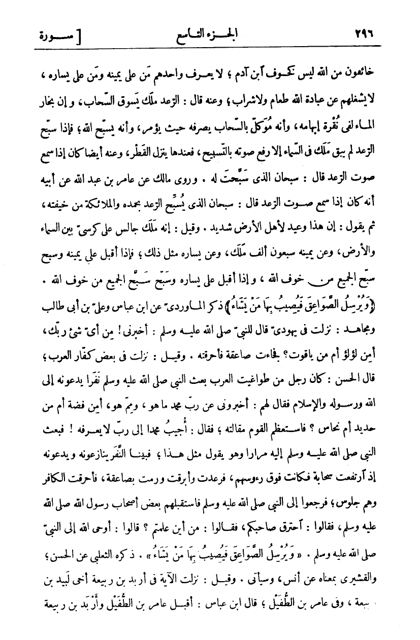خَائِفُونَ مِنَ اللَّهِ لَيْسَ كَخَوْفِ ابْنِ آدَمَ، لَا يَعْرِفُ وَاحِدُهُمْ مَنْ عَلَى يَمِينِهِ وَمَنْ عَلَى يَسَارِهِ، لَا يَشْغَلُهُمْ عَنْ عِبَادَةِ اللَّهِ طَعَامٌ وَلَا شَرَابٌ، وَعَنْهُ قَالَ: الرَّعْدُ مَلَكٌ يَسُوقُ السَّحَابَ، وَإِنَّ بُخَارَ الْمَاءِ لَفِي نُقْرَةِ إِبْهَامِهِ، وَإِنَّهُ مُوَكَّلٌ بِالسَّحَابِ يُصَرِّفُهُ حَيْثُ يُؤْمَرُ، وَإِنَّهُ يُسَبِّحُ اللَّهَ، فَإِذَا سَبَّحَ الرَّعْدُ لَمْ يَبْقَ مَلَكٌ فِي السَّمَاءِ إِلَّا رَفَعَ صَوْتَهُ بِالتَّسْبِيحِ، فَعِنْدَهَا يَنْزِلُ الْقَطْرُ، وَعَنْهُ أَيْضًا كَانَ إِذَا سَمِعَ صَوْتَ الرَّعْدِ قَالَ: سُبْحَانَ الَّذِي سَبَّحْتُ لَهُ. وَرَوَى مَالِكٌ عَنْ عَامِرِ بْنِ عَبْدِ اللَّهِ عَنْ أَبِيهِ أَنَّهُ كَانَ إِذَا سَمِعَ صَوْتَ الرَّعْدِ قَالَ: سُبْحَانَهُ الَّذِي يُسَبِّحُ الرَّعْدُ بِحَمْدِهِ وَالْمَلَائِكَةُ مِنْ خِيفَتِهِ، ثُمَّ يَقُولُ: إِنَّ هَذَا وَعِيدٌ لِأَهْلِ الْأَرْضِ شَدِيدٌ. وَقِيلَ: إِنَّهُ مَلَكٌ جَالِسٌ عَلَى كُرْسِيٍّ بَيْنَ السَّمَاءِ وَالْأَرْضِ، وَعَنْ يَمِينِهِ سَبْعُونَ أَلْفَ مَلَكٍ وَعَنْ يَسَارِهِ مِثْلُ ذَلِكَ، فَإِذَا أَقْبَلَ عَلَى يَمِينِهِ وَسَبَّحَ سَبَّحَ الْجَمِيعُ مِنْ خَوْفِ اللَّهِ، وَإِذَا أَقْبَلَ عَلَى يَسَارِهِ وَسَبَّحَ سَبَّحَ الْجَمِيعُ مِنْ خَوْفِ اللَّهِ. (وَيُرْسِلُ الصَّواعِقَ فَيُصِيبُ بِها مَنْ يَشاءُ)