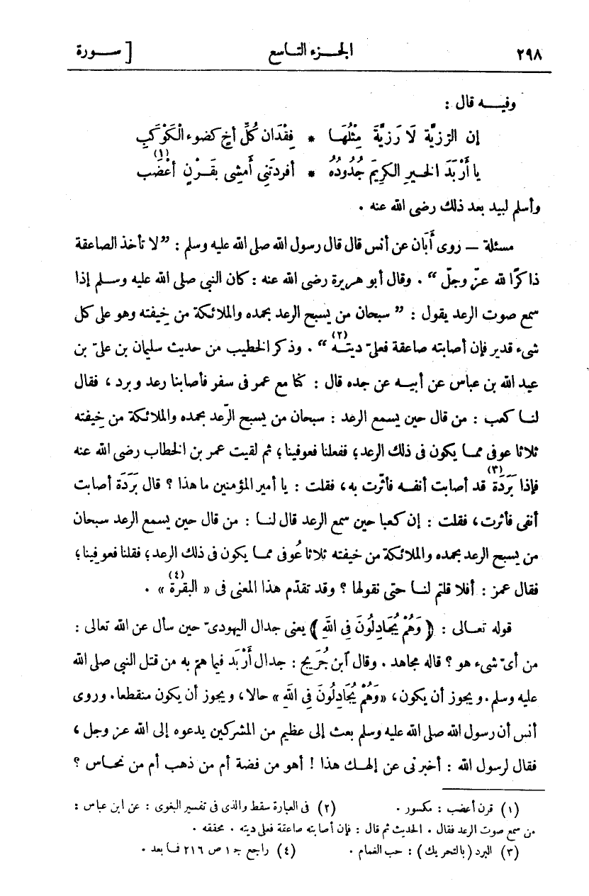 (٢). في العبارة سقط والذي في تفسير البغوي: عن ابن عباس: من سمع صوت الرعد فقال. الحديث ثم قال: فإن أصابته صاعقة فعلى ديته. محققه.