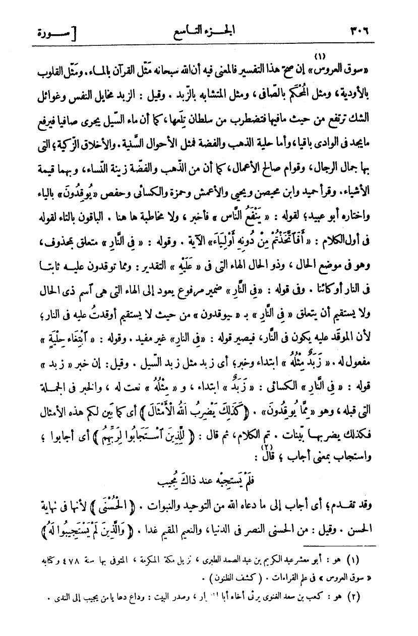 " سُوقِ الْعَرُوسِ" «١» إِنْ صَحَّ هَذَا التَّفْسِيرُ فَالْمَعْنَى فِيهِ أَنَّ اللَّهَ سُبْحَانَهُ مَثَّلَ الْقُرْآنَ بِالْمَاءِ. وَمَثَّلَ الْقُلُوبَ بِالْأَوْدِيَةِ، وَمَثَّلَ الْمُحْكَمَ بِالصَّافِي، وَمَثَّلَ الْمُتَشَابِهَ بِالزَّبَدِ. وَقِيلَ: الزَّبَدُ مَخَايِلُ النَّفْسِ وَغَوَائِلُ الشَّكِّ تَرْتَفِعُ مِنْ حَيْثُ مَا فِيهَا فَتَضْطَرِبُ مِنْ سُلْطَانِ تِلَعِهَا، كَمَا أَنَّ مَاءَ السَّيْلِ يَجْرِي صَافِيًا فَيَرْفَعُ مَا يَجِدُ فِي الْوَادِي بَاقِيًا، وَأَمَّا حِلْيَةُ الذَّهَبِ وَالْفِضَّةِ فَمِثْلُ الْأَحْوَالِ السُّنِّيَّةِ. وَالْأَخْلَاقِ الزَّكِيَّةِ، الَّتِي بِهَا جَمَالُ الرِّجَالِ، وَقَوَامُ صَالِحِ الْأَعْمَالِ، كَمَا أَنَّ مِنَ الذَّهَبِ وَالْفِضَّةِ زِينَةُ النِّسَاءِ. وَبِهِمَا قِيمَةُ الْأَشْيَاءِ. وَقَرَأَ حُمَيْدٌ وَابْنُ مُحَيْصِنٍ وَيَحْيَى وَالْأَعْمَشُ وَحَمْزَةُ وَالْكِسَائِيُّ وَحَفْصٌ،" يُوقِدُونَ" بِالْيَاءِ وَاخْتَارَهُ أَبُو عُبَيْدٍ، لِقَوْلِهِ:" يَنْفَعُ النَّاسَ" فَأَخْبَرَ، وَلَا مُخَاطَبَةَ هَاهُنَا. الْبَاقُونَ بِالتَّاءِ لِقَوْلِهِ فِي أَوَّلِ الْكَلَامِ:" أَفَاتَّخَذْتُمْ مِنْ دُونِهِ أَوْلِياءَ" [الرعد: ١٦] الآية. وَقَوْلُهُ:" فِي النَّارِ" مُتَعَلِّقٌ بِمَحْذُوفٍ، وَهُوَ فِي مَوْضِعِ الْحَالِ، وَذُو الْحَالِ الْهَاءُ الَّتِي فِي" عَلَيْهِ" التَّقْدِيرُ: وَمِمَّا تُوقِدُونَ عَلَيْهِ ثَابِتًا فِي النَّارِ أَوْ كَائِنًا. وَفِي قَوْلِهِ:" فِي النَّارِ" ضَمِيرٌ مَرْفُوعٌ يَعُودُ إِلَى الْهَاءِ الَّتِي هِيَ اسْمُ ذِي الْحَالِ وَلَا يَسْتَقِيمُ أَنْ يَتَعَلَّقَ" فِي النَّارِ" بِ" يُوقِدُونَ" مِنْ حَيْثُ لَا يَسْتَقِيمُ أَوْقَدْتُ عَلَيْهِ فِي النَّارِ، لِأَنَّ الْمُوقَدَ عَلَيْهِ يَكُونُ فِي النَّارِ، فَيَصِيرُ قَوْلُهُ:" فِي النَّارِ" غير مقيد. وَقَوْلُهُ:" ابْتِغاءَ حِلْيَةٍ" مَفْعُولٌ لَهُ." زَبَدٌ مِثْلُهُ" ابْتِدَاءٌ وَخَبَرٌ، أَيْ زَبَدٌ مِثْلُ زَبَدِ السَّيْلِ. وَقِيلَ: إِنَّ خَبَرَ" زَبَدٌ" قَوْلُهُ:" فِي النَّارِ" الْكِسَائِيُّ:" زَبَدٌ" ابْتِدَاءٌ، وَ" مِثْلُهُ" نَعْتٌ لَهُ، وَالْخَبَرُ فِي الْجُمْلَةِ الَّتِي قَبْلَهُ، وَهُوَ" مِمَّا يُوقِدُونَ". (كَذلِكَ يَضْرِبُ اللَّهُ الْأَمْثالَ) أَيْ كَمَا بَيَّنَ لَكُمْ هَذِهِ الْأَمْثَالَ فَكَذَلِكَ يَضْرِبُهَا بَيِّنَاتٍ. تَمَّ الْكَلَامُ، ثُمَّ قَالَ: (لِلَّذِينَ اسْتَجابُوا لِرَبِّهِمُ) أَيْ أَجَابُوا، وَاسْتَجَابَ بِمَعْنَى أَجَابَ، قَالَ «٢»: