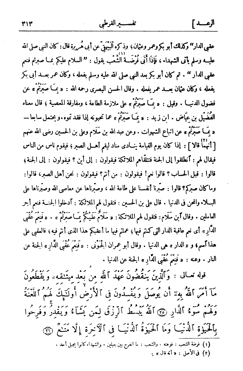 " وَكَذَلِكَ أَبُو بَكْرٍ وَعُمَرُ وَعُثْمَانُ، وَذَكَرَهُ الْبَيْهَقِيُّ عَنْ أَبِي هُرَيْرَةَ قَالَ: كَانَ النَّبِيُّ صَلَّى اللَّهُ عَلَيْهِ وَسَلَّمَ يَأْتِي الشُّهَدَاءَ، فإذا أتى فرضة الشعب «١» يقول:" سَلامٌ عَلَيْكُمْ بِما صَبَرْتُمْ فَنِعْمَ عُقْبَى الدَّارِ". ثُمَّ كَانَ أَبُو بَكْرٍ بَعْدَ النَّبِيِّ صَلَّى اللَّهُ عَلَيْهِ وَسَلَّمَ يَفْعَلُهُ، وَكَانَ عُمَرُ بَعْدَ أَبِي بَكْرٍ يَفْعَلُهُ، وَكَانَ عُثْمَانُ بَعْدَ عُمَرَ يَفْعَلُهُ. وَقَالَ الْحَسَنُ الْبَصْرِيُّ رَحِمَهُ اللَّهُ:" بِما صَبَرْتُمْ" عَنْ فُضُولِ الدُّنْيَا. وَقِيلَ:" بِما صَبَرْتُمْ" عَلَى مُلَازَمَةِ الطَّاعَةِ، وَمُفَارَقَةِ الْمَعْصِيَةِ، قَالَ مَعْنَاهُ الْفُضَيْلُ بْنُ عِيَاضٍ. ابْنُ زَيْدٍ:" بِما صَبَرْتُمْ" عَمَّا تُحِبُّونَهُ إِذَا فَقَدْتُمُوهُ. وَيَحْتَمِلُ سَابِعًا-" بِما صَبَرْتُمْ" عَنِ اتِّبَاعِ الشَّهَوَاتِ. وَعَنْ عَبْدِ اللَّهِ بْنِ سَلَامٍ وَعَلِيِّ بْنِ الْحُسَيْنِ رَضِيَ اللَّهُ عَنْهُمْ [أَنَّهُمَا قَالَا] «٢»: إِذَا كَانَ يَوْمُ الْقِيَامَةِ يُنَادِي مُنَادٍ لِيَقُمْ أَهْلُ الصَّبْرِ، فَيَقُومُ نَاسٌ مِنَ النَّاسِ فَيُقَالُ لَهُمُ: انْطَلِقُوا إِلَى الْجَنَّةِ فَتَتَلَقَّاهُمُ الْمَلَائِكَةُ فَيَقُولُونَ: إِلَى أَيْنَ؟ فَيَقُولُونَ: إِلَى الْجَنَّةِ، قَالُوا: قَبْلَ الْحِسَابِ؟ قَالُوا نَعَمْ! فَيَقُولُونَ: مَنْ أَنْتُمْ؟ فَيَقُولُونَ: نَحْنُ أَهْلُ الصَّبْرِ، قَالُوا: وَمَا كَانَ صَبْرُكُمْ؟ قَالُوا: صَبَرْنَا أَنْفُسَنَا عَلَى طَاعَةِ اللَّهِ، وَصَبَرْنَاهَا عَنْ مَعَاصِي اللَّهِ وَصَبَرْنَاهَا عَلَى الْبَلَاءِ وَالْمِحَنِ فِي الدُّنْيَا. قَالَ عَلِيُّ بْنُ الْحُسَيْنِ: فَتَقُولُ لَهُمُ الْمَلَائِكَةُ: ادْخُلُوا الْجَنَّةَ فَنِعْمَ أَجْرُ الْعَامِلِينَ. وَقَالَ ابْنُ سَلَامٍ: فَتَقُولُ لَهُمُ الْمَلَائِكَةُ:" سَلامٌ عَلَيْكُمْ بِما صَبَرْتُمْ فَنِعْمَ عُقْبَى الدَّارِ" أَيْ نِعْمَ عَاقِبَةُ الدَّارِ الَّتِي كُنْتُمْ فِيهَا، عَمِلْتُمْ فِيهَا مَا أَعْقَبَكُمْ هَذَا الَّذِي أَنْتُمْ فِيهِ، فَالْعُقْبَى عَلَى هَذَا اسْمٌ، و" الدَّارِ" هِيَ الدُّنْيَا. وَقَالَ أَبُو عِمْرَانَ الْجَوْنِيُّ:" فَنِعْمَ عُقْبَى الدَّارِ" الْجَنَّةُ عَنِ النَّارِ. وَعَنْهُ:" فَنِعْمَ عُقْبَى الدَّارِ" الجنة عن الدنيا.