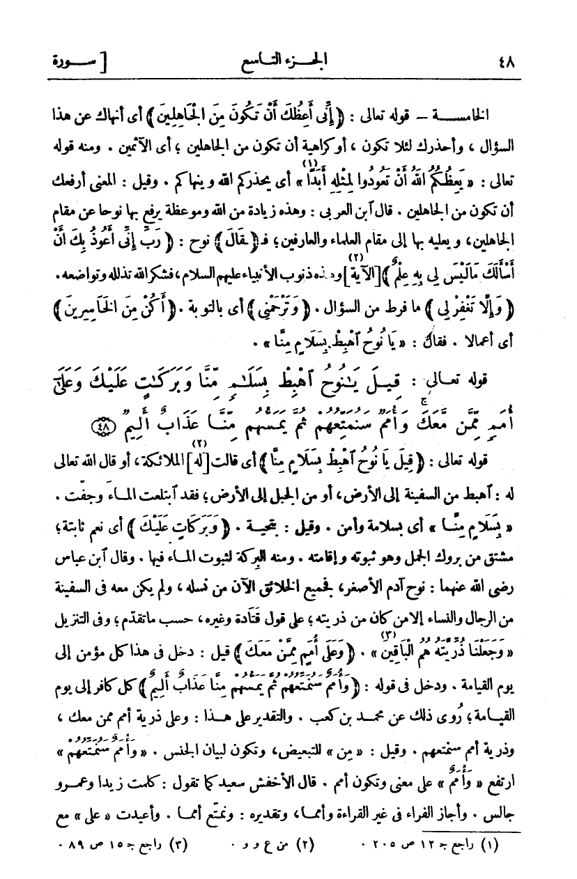 الْخَامِسَةُ- قَوْلُهُ تَعَالَى: (إِنِّي أَعِظُكَ أَنْ تَكُونَ مِنَ الْجاهِلِينَ) أَيْ أَنْهَاكَ عَنْ هَذَا السُّؤَالِ، وَأُحَذِّرُكَ لِئَلَّا تَكُونَ، أَوْ كَرَاهِيَةَ أَنْ تَكُونَ مِنَ الْجَاهِلِينَ، أَيِ الْآثِمِينَ. وَمِنْهُ قَوْلُهُ تَعَالَى:" يَعِظُكُمُ اللَّهُ أَنْ تَعُودُوا لِمِثْلِهِ أَبَداً" «١» [النور: ١٧] أَيْ يُحَذِّرُكُمُ اللَّهُ وَيَنْهَاكُمْ. وَقِيلَ: الْمَعْنَى أَرْفَعُكَ أَنْ تَكُونَ مِنَ الْجَاهِلِينَ. قَالَ ابْنُ الْعَرَبِيِّ: وَهَذِهِ زِيَادَةٌ مِنَ اللَّهِ وَمَوْعِظَةٌ يَرْفَعُ بِهَا نُوحًا عَنْ مَقَامِ الْجَاهِلِينَ، وَيُعْلِيهِ بِهَا إِلَى مَقَامِ الْعُلَمَاءِ وَالْعَارِفِينَ، فَ (قالَ) نُوحٌ: (رَبِّ إِنِّي أَعُوذُ بِكَ أَنْ أَسْئَلَكَ مَا لَيْسَ لِي بِهِ عِلْمٌ) [الْآيَةَ «٢»] وَهَذِهِ ذُنُوبُ الْأَنْبِيَاءِ عَلَيْهِمُ السَّلَامُ، فَشُكْرُ اللَّهِ تَذَلُّلُهُ وَتَوَاضُعُهُ. (وَإِلَّا تَغْفِرْ لِي) مَا فَرَطَ مِنَ السُّؤَالِ. (وَتَرْحَمْنِي) أَيْ بِالتَّوْبَةِ. (أَكُنْ مِنَ الْخاسِرِينَ) أَيْ أَعْمَالًا. فَقَالَ:" يَا نُوحُ اهْبِطْ بِسَلامٍ مِنَّا".