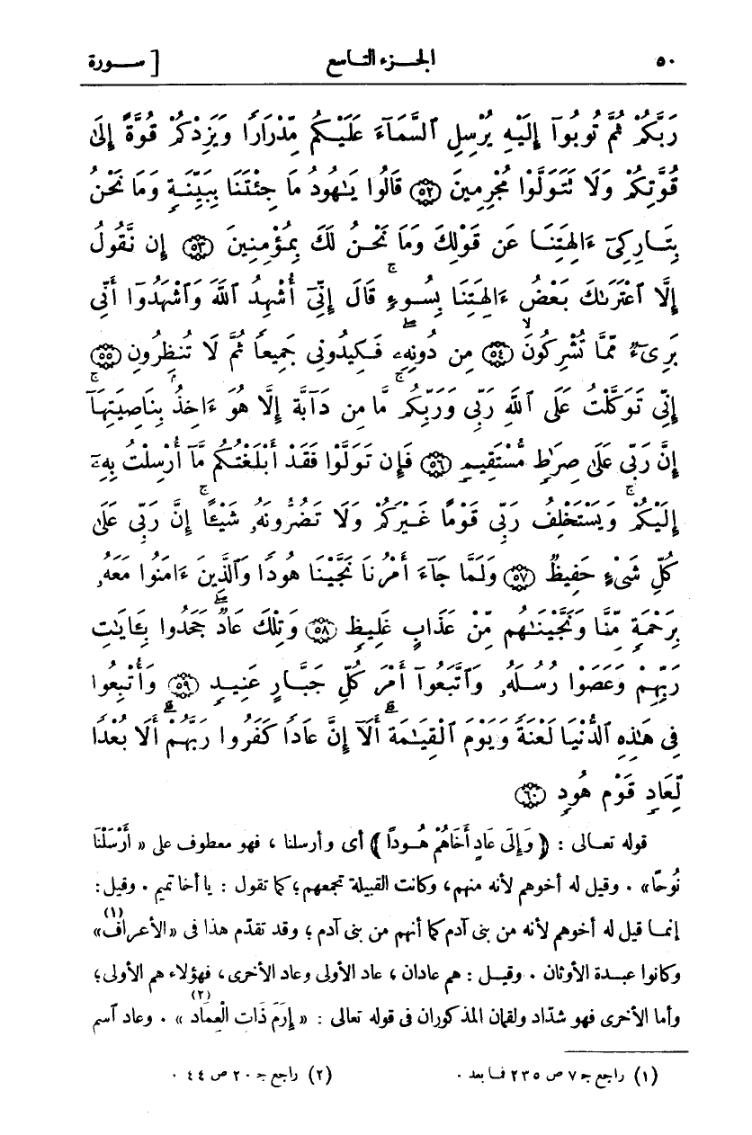 قَوْلُهُ تَعَالَى: (وَإِلى عادٍ أَخاهُمْ هُوداً) أَيْ وَأَرْسَلْنَا، فَهُوَ مَعْطُوفٌ عَلَى" أَرْسَلْنا نُوحاً". وَقِيلَ لَهُ أَخُوهُمْ لِأَنَّهُ مِنْهُمْ، وَكَانَتِ الْقَبِيلَةُ تَجْمَعُهُمْ، كَمَا تَقُولُ: يَا أَخَا تَمِيمٍ. وَقِيلَ: إِنَّمَا قِيلَ لَهُ أَخُوهُمْ لِأَنَّهُ مِنْ بَنِي آدَمَ كَمَا أَنَّهُمْ مِنْ بَنِي آدَمَ، وَقَدْ تَقَدَّمَ هَذَا فِي" الْأَعْرَافِ" «١» وَكَانُوا عَبَدَةَ الْأَوْثَانِ. وَقِيلَ: هُمْ عَادَانِ، عَادٌ الْأُولَى وَعَادٌ الْأُخْرَى، فَهَؤُلَاءِ هُمُ الْأُولَى، وَأَمَّا الْأُخْرَى فَهُوَ شَدَّادٌ وَلُقْمَانُ الْمَذْكُورَانِ فِي قَوْلِهِ تَعَالَى:" إِرَمَ ذاتِ الْعِمادِ" «٢» [الفجر: ٧]. وعاد اسم