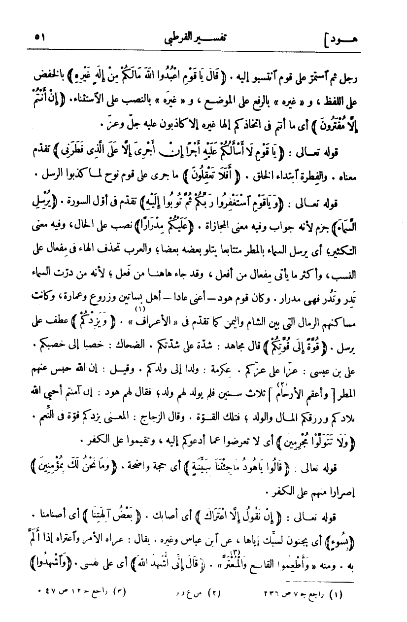 رَجُلٍ ثُمَّ اسْتَمَرَّ عَلَى قَوْمٍ انْتَسَبُوا إِلَيْهِ. (قالَ يَا قَوْمِ اعْبُدُوا اللَّهَ مَا لَكُمْ مِنْ إِلهٍ غَيْرُهُ) بِالْخَفْضِ عَلَى اللَّفْظِ، وَ" غَيْرُهُ" بِالرَّفْعِ عَلَى الْمَوْضِعِ، وَ" غَيْرُهُ" بِالنَّصْبِ عَلَى الِاسْتِثْنَاءِ. (إِنْ أَنْتُمْ إِلَّا مُفْتَرُونَ) أَيْ مَا أَنْتُمْ فِي اتِّخَاذِكُمْ إِلَهًا غَيْرَهُ إِلَّا كَاذِبُونَ عَلَيْهِ جَلَّ وَعَزَّ. قَوْلُهُ تَعَالَى: (يَا قَوْمِ لا أَسْئَلُكُمْ عَلَيْهِ أَجْراً إِنْ أَجْرِيَ إِلَّا عَلَى الَّذِي فَطَرَنِي) تَقَدَّمَ مَعْنَاهُ. وَالْفِطْرَةُ ابْتِدَاءُ الْخَلْقِ. (أَفَلا تَعْقِلُونَ) مَا جَرَى عَلَى قَوْمِ نُوحٍ لَمَّا كَذَّبُوا الرُّسُلَ. قَوْلُهُ تَعَالَى: (وَيا قَوْمِ اسْتَغْفِرُوا رَبَّكُمْ ثُمَّ تُوبُوا إِلَيْهِ) تَقَدَّمَ فِي أَوَّلِ السُّورَةِ. (يُرْسِلِ السَّماءَ) جُزِمَ لِأَنَّهُ جَوَابٌ وَفِيهِ مَعْنَى الْمُجَازَاةِ." (عَلَيْكُمْ مِدْراراً) " نُصِبَ عَلَى الْحَالِ، وَفِيهِ مَعْنَى التَّكْثِيرِ، أَيْ يُرْسِلِ السَّمَاءَ بِالْمَطَرِ مُتَتَابِعًا يَتْلُو بَعْضُهُ بَعْضًا، وَالْعَرَبُ تَحْذِفُ الْهَاءَ فِي مِفْعَالٍ عَلَى النَّسَبِ، وَأَكْثَرُ مَا يَأْتِي مِفْعَالٌ مِنْ أَفْعَلَ، وَقَدْ جَاءَ هَاهُنَا مِنْ فَعَلَ، لِأَنَّهُ مِنْ دَرَّتِ السَّمَاءُ تَدِرُّ وَتَدُرُّ فَهِيَ مِدْرَارٌ. وَكَانَ قَوْمُ هُودٍ- أَعْنِي عَادًا- أَهْلَ بَسَاتِينَ وَزُرُوعٍ وَعِمَارَةٍ، وَكَانَتْ مَسَاكِنُهُمُ الرِّمَالَ الَّتِي بَيْنَ الشَّامِ وَالْيَمَنِ كَمَا تَقَدَّمَ فِي" الْأَعْرَافِ" «١». (وَيَزِدْكُمْ) عَطْفٌ عَلَى يُرْسِلْ. (قُوَّةً إِلى قُوَّتِكُمْ) قَالَ مُجَاهِدٌ: شِدَّةٌ عَلَى شِدَّتِكُمْ. الضَّحَّاكُ: خِصْبًا إِلَى خِصْبِكُمْ. عَلِيُّ بْنُ عِيسَى: عِزًّا عَلَى عِزِّكُمْ. عِكْرِمَةُ: وَلَدًا إِلَى وَلَدِكُمْ. وَقِيلَ: إِنَّ اللَّهَ حَبَسَ عَنْهُمُ الْمَطَرَ [وَأَعْقَمَ الْأَرْحَامَ «٢»] ثَلَاثَ سِنِينَ فَلَمْ يُولَدْ لَهُمْ وَلَدٌ، فَقَالَ لهم هود: إن آمنتم أحيى اللَّهُ بِلَادَكُمْ وَرَزَقَكُمُ الْمَالَ وَالْوَلَدَ، فَتِلْكَ الْقُوَّةُ. وَقَالَ الزَّجَّاجُ: الْمَعْنَى يَزِدْكُمْ قُوَّةً فِي النِّعَمِ. (وَلا تَتَوَلَّوْا مُجْرِمِينَ) أَيْ لَا تُعْرِضُوا عَمَّا أَدْعُوكُمْ إِلَيْهِ، وَتُقِيمُوا عَلَى الْكُفْرِ. قَوْلُهُ تَعَالَى: (قالُوا يَا هُودُ مَا جِئْتَنا بِبَيِّنَةٍ) أَيْ حُجَّةٍ وَاضِحَةٍ. (وَما نَحْنُ لَكَ بِمُؤْمِنِينَ) إِصْرَارًا مِنْهُمْ عَلَى الْكُفْرِ. قَوْلُهُ تَعَالَى: (إِنْ نَقُولُ إِلَّا اعْتَراكَ) أَيْ أَصَابَكَ. (بَعْضُ آلِهَتِنا) أَيْ أَصْنَامِنَا. (بِسُوءٍ) أَيْ بِجُنُونٍ لِسَبِّكَ إِيَّاهَا، عَنِ ابْنِ عَبَّاسٍ وَغَيْرِهِ. يُقَالُ: عَرَاهُ الْأَمْرُ وَاعْتَرَاهُ إِذَا أَلَمَّ بِهِ. وَمِنْهُ" وَأَطْعِمُوا الْقانِعَ وَالْمُعْتَرَّ" «٣» [الحج: ٣٦]. (قالَ إِنِّي أُشْهِدُ اللَّهَ) أَيْ عَلَى نَفْسِي. (وَاشْهَدُوا)
