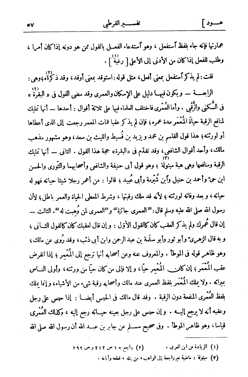 عِمَارَتَهَا فَإِنَّهُ جَاءَ بِلَفْظِ اسْتَفْعَلَ، وَهُوَ اسْتِدْعَاءُ الْفِعْلِ بِالْقَوْلِ مِمَّنْ هُوَ دُونَهُ إِذَا كَانَ أَمْرًا، وَطَلَبٌ لِلْفِعْلِ إِذَا كَانَ مِنَ الْأَدْنَى إِلَى الْأَعْلَى [رَغْبَةً «١»]. قُلْتُ: لَمْ يُذْكَرِ اسْتَفْعَلَ بِمَعْنَى أَفْعَلَ، مِثْلَ قَوْلِهِ: اسْتَوْقَدَ بِمَعْنَى أَوْقَدَ، وَقَدْ ذَكَرْنَاهُ، «٢» وَهِيَ: الرَّابِعَةُ- وَيَكُونُ فِيهَا دَلِيلٌ عَلَى الْإِسْكَانِ وَالْعُمْرَى وَقَدْ مَضَى الْقَوْلُ فِي" الْبَقَرَةِ" «٣» فِي السُّكْنَى وَالرُّقْبَى. وَأَمَّا الْعُمْرَى فَاخْتَلَفَ العلماء فيها على ثلاثة أقوال: أحدهما- أَنَّهَا تَمْلِيكٌ لِمَنَافِعِ الرَّقَبَةِ حَيَاةَ الْمُعْمَرِ مُدَّةَ عُمْرِهِ، فَإِنْ لَمْ يَذْكُرْ عَقِبًا فَمَاتَ الْمُعْمَرُ رَجَعَتْ إِلَى الَّذِي أَعْطَاهَا أَوْ لِوَرَثَتِهِ، هَذَا قَوْلُ الْقَاسِمِ بْنِ مُحَمَّدٍ وَيَزِيدَ بْنِ قُسَيْطٍ وَاللَّيْثِ بْنِ سَعْدٍ، وَهُوَ مَشْهُورُ مَذْهَبِ مَالِكٍ، وَأَحَدُ أَقْوَالِ الشَّافِعِيِّ، وَقَدْ تَقَدَّمَ فِي" الْبَقَرَةِ" حُجَّةُ هَذَا الْقَوْلِ. الثَّانِي أَنَّهَا تَمْلِيكُ الرَّقَبَةِ ومنافعا وَهِيَ هِبَةٌ مَبْتُولَةٌ «٤» وَهُوَ قَوْلُ أَبِي حَنِيفَةَ وَالشَّافِعِيِّ وَأَصْحَابِهِمَا وَالثَّوْرِيِّ والحسن ابن حَيِّ وَأَحْمَدَ بْنِ حَنْبَلٍ وَابْنِ شُبْرُمَةَ وَأَبِي عُبَيْدٍ، قَالُوا مَنْ أَعْمَرَ رَجُلًا شَيْئًا حَيَاتَهُ فَهُوَ لَهُ حَيَاتَهُ، وَبَعْدَ وَفَاتِهِ لِوَرَثَتِهِ، لِأَنَّهُ قَدْ مَلَكَ رَقَبَتَهَا، وَشَرْطُ الْمُعْطِي الْحَيَاةَ وَالْعُمْرَ بَاطِلٌ، لِأَنَّ رَسُولَ اللَّهِ صَلَّى اللَّهُ عَلَيْهِ وَسَلَّمَ قال:" العمرى جائزة"" والعمرى لِمَنْ وُهِبَتْ لَهُ" الثَّالِثُ- إِنْ قَالَ عُمْرَكَ وليم يَذْكُرِ الْعَقِبَ كَانَ كَالْقَوْلِ الْأَوَّلِ: وَإِنْ قَالَ لِعَقِبِكَ كَانَ كَالْقَوْلِ الثَّانِي، وَبِهِ قَالَ الزُّهْرِيُّ وَأَبُو ثَوْرٍ وَأَبُو سَلَمَةَ بْنُ عَبْدِ الرَّحْمَنِ وَابْنُ أَبِي ذِئْبٍ، وَقَدْ رُوِيَ عَنْ مَالِكٍ، وَهُوَ ظَاهِرُ قَوْلِهِ فِي الْمُوَطَّأِ. وَالْمَعْرُوفُ عَنْهُ وَعَنْ أَصْحَابِهِ أَنَّهَا تَرْجِعُ إِلَى الْمُعْمِرِ، إِذَا انقرض عقب المعمر، إذا كَانَ الْمُعْمِرُ حَيًّا، وَإِلَّا فَإِلَى مَنْ كَانَ حَيًّا مِنْ وَرَثَتِهِ، وَأَوْلَى النَّاسِ بِمِيرَاثِهِ. وَلَا يملك المعمر بلفظ العمرى عند مَالِكٌ فِي الْحَبْسِ أَيْضًا: إِذَا حُبِسَ عَلَى رَجُلٍ وَعَقِبِهِ أَنَّهُ لَا يَرْجِعُ إِلَيْهِ. وَإِنْ حُبِسَ عَلَى رَجُلٍ بِعَيْنِهِ حَيَاتَهُ رَجَعَ إِلَيْهِ، وَكَذَلِكَ الْعُمْرَى قِيَاسًا، وَهُوَ ظَاهِرُ الْمُوَطَّأِ. وَفِي صَحِيحِ مُسْلِمٌ عَنْ جَابِرِ بْنِ عَبْدِ اللَّهِ أَنَّ رَسُولَ اللَّهِ صلى الله