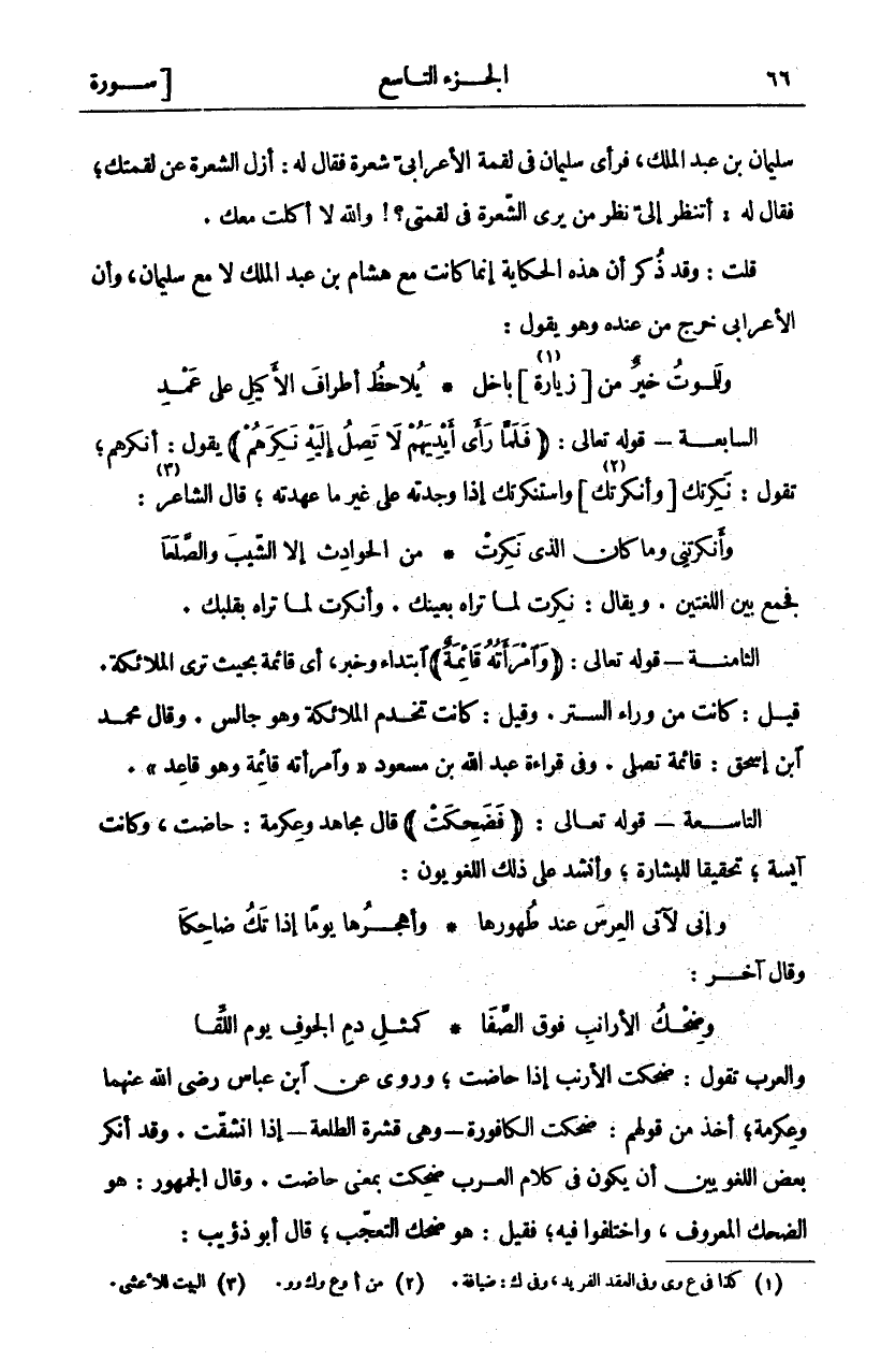 سليمان ابن عَبْدِ الْمَلِكِ، فَرَأَى سُلَيْمَانُ فِي لُقْمَةِ الْأَعْرَابِيِّ شَعْرَةً فَقَالَ لَهُ: أَزِلِ الشَّعْرَةَ عَنْ لُقْمَتِكَ، فَقَالَ لَهُ: أَتَنْظُرُ إِلَيَّ نَظَرَ مَنْ يَرَى الشَّعْرَةَ فِي لُقْمَتِي؟! وَاللَّهِ لَا أَكَلْتُ مَعَكَ. قُلْتُ وَقَدْ ذُكِرَ أَنَّ هَذِهِ الْحِكَايَةَ إِنَّمَا كَانَتْ مَعَ هِشَامِ بْنِ عَبْدِ الْمَلِكِ لَا مَعَ سُلَيْمَانَ، وَأَنَّ الْأَعْرَابِيَّ خَرَجَ مِنْ عِنْدِهِ وَهُوَ يَقُولُ: