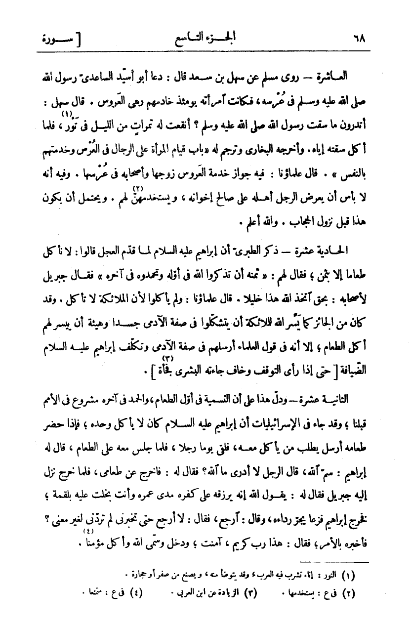 الْعَاشِرَةُ- رَوَى مُسْلِمٌ عَنْ سَهْلِ بْنِ سَعْدٍ قَالَ: دَعَا أَبُو أُسَيْدٍ السَّاعِدِيُّ رَسُولَ اللَّهِ صَلَّى اللَّهُ عَلَيْهِ وَسَلَّمَ فِي عُرْسِهِ، فَكَانَتِ امرأته خادمهم يومئذ وَهِيَ الْعَرُوسُ. قَالَ سَهْلٌ: أَتَدْرُونَ مَا سَقَتْ رَسُولَ اللَّهِ صَلَّى اللَّهُ عَلَيْهِ وَسَلَّمَ؟ أَنْقَعَتْ لَهُ تَمَرَاتٍ مِنَ اللَّيْلِ فِي تَوْرٍ «١»، فَلَمَّا أَكَلَ سَقَتْهُ إِيَّاهُ. وَأَخْرَجَهُ الْبُخَارِيُّ وَتَرْجَمَ لَهُ" بَابُ قِيَامِ الْمَرْأَةِ عَلَى الرِّجَالِ فِي الْعُرْسِ وَخِدْمَتِهِمْ بِالنَّفْسِ". قَالَ عُلَمَاؤُنَا: فِيهِ جَوَازُ خِدْمَةِ الْعَرُوسِ زَوْجَهَا وَأَصْحَابَهُ فِي عُرْسِهَا. وَفِيهِ أَنَّهُ لَا بَأْسَ أَنْ يَعْرِضَ الرَّجُلُ أَهْلَهُ عَلَى صَالِحِ إِخْوَانِهِ، وَيَسْتَخْدِمُهُنَّ «٢» لَهُمْ. وَيَحْتَمِلُ أَنْ يَكُونَ هَذَا قَبْلَ نُزُولِ الْحِجَابِ وَاللَّهُ أَعْلَمُ الْحَادِيَةَ عَشْرَةَ- ذَكَرَ الطَّبَرِيُّ أَنَّ إِبْرَاهِيمَ عَلَيْهِ السَّلَامُ لَمَّا قَدَّمَ الْعِجْلَ قَالُوا: لَا نَأْكُلُ طَعَامًا إِلَّا بِثَمَنٍ، فَقَالَ لَهُمْ:" ثَمَنُهُ أَنْ تَذْكُرُوا اللَّهَ فِي أَوَّلِهِ وَتَحْمَدُوهُ فِي آخِرِهِ" فَقَالَ جِبْرِيلُ لِأَصْحَابِهِ: بِحَقٍّ اتَّخَذَ اللَّهُ هَذَا خَلِيلًا. قَالَ عُلَمَاؤُنَا: وَلَمْ يَأْكُلُوا لِأَنَّ الْمَلَائِكَةَ لَا تَأْكُلُ. وَقَدْ كَانَ مِنَ الْجَائِزِ كَمَا يَسَّرَ اللَّهُ لِلْمَلَائِكَةِ أَنْ يَتَشَكَّلُوا فِي صِفَةِ الْآدَمِيِّ جَسَدًا وَهَيْئَةً أَنْ يُيَسِّرَ لَهُمْ أَكْلَ الطَّعَامِ، إِلَّا أَنَّهُ فِي قَوْلِ الْعُلَمَاءِ أَرْسَلَهُمْ فِي صِفَةِ الْآدَمِيِّ وَتَكَلَّفَ إِبْرَاهِيمُ عَلَيْهِ السَّلَامُ الضِّيَافَةَ [حَتَّى إِذَا رَأَى التَّوَقُّفَ وَخَافَ جَاءَتْهُ الْبُشْرَى فَجْأَةً «٣»] الثَّانِيَةَ عَشْرَةَ- وَدَلَّ هَذَا عَلَى أَنَّ التَّسْمِيَةَ فِي أَوَّلِ الطَّعَامِ، وَالْحَمْدَ فِي آخِرِهِ مَشْرُوعٌ فِي الْأُمَمِ قَبْلَنَا، وَقَدْ جَاءَ فِي الإسرائيليات أن إبراهيم كَانَ لَا يَأْكُلُ وَحْدَهُ، فَإِذَا حَضَرَ طَعَامُهُ أَرْسَلَ يَطْلُبُ مَنْ يَأْكُلُ مَعَهُ، فَلَقِيَ يَوْمًا رَجُلًا، فَلَمَّا جَلَسَ مَعَهُ عَلَى الطَّعَامِ، قَالَ لَهُ إِبْرَاهِيمُ: سَمِّ اللَّهَ، قَالَ الرَّجُلُ لَا أَدْرِي مَا اللَّهُ؟ فَقَالَ لَهُ: فَاخْرُجْ عَنْ طَعَامِي، فَلَمَّا خَرَجَ نَزَلَ إِلَيْهِ جِبْرِيلُ فَقَالَ لَهُ: يَقُولُ اللَّهُ إِنَّهُ يَرْزُقُهُ عَلَى كُفْرِهِ مَدَى عُمْرِهِ وَأَنْتَ بَخِلْتَ عَلَيْهِ بِلُقْمَةٍ، فَخَرَجَ إِبْرَاهِيمُ فَزِعًا يَجُرُّ رِدَاءَهُ، وَقَالَ: ارْجِعْ، فَقَالَ: لَا أَرْجِعُ حَتَّى تُخْبِرَنِي لِمَ تَرُدُّنِي لِغَيْرِ مَعْنًى؟ فَأَخْبَرَهُ بِالْأَمْرِ، فَقَالَ هَذَا رَبٌّ كَرِيمٌ، آمنت، ودخل وسمي الله واكل مؤمنا «٤»