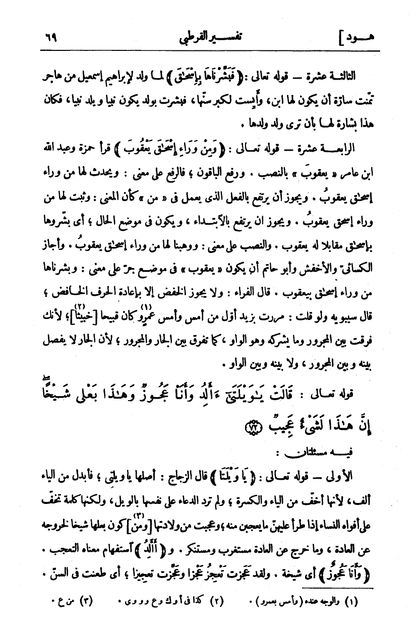 الثَّالِثَةَ عَشْرَةَ- قَوْلُهُ تَعَالَى: (فَبَشَّرْناها بِإِسْحاقَ) لَمَّا وُلِدَ لِإِبْرَاهِيمَ إِسْمَاعِيلُ مِنْ هَاجَرَ تَمَنَّتْ سَارَةُ أَنْ يَكُونَ لَهَا ابْنٌ، وَأَيِسَتْ لِكِبَرِ سِنِّهَا، فَبُشِّرَتْ بِوَلَدٍ يَكُونُ نَبِيًّا وَيَلِدُ نَبِيًّا، فَكَانَ هَذَا بِشَارَةً لَهَا بِأَنْ تَرَى وَلَدَ وَلَدِهَا. الرَّابِعَةَ عَشْرَةَ- قَوْلُهُ تَعَالَى: (وَمِنْ وَراءِ إِسْحاقَ يَعْقُوبَ) قرأ حمزة وعبد الله ابن عَامِرٍ" يَعْقُوبَ" بِالنَّصْبِ. وَرَفَعَ الْبَاقُونَ، فَالرَّفْعِ عَلَى مَعْنَى: وَيُحْدِثُ لَهَا مِنْ وَرَاءِ إِسْحَاقَ يَعْقُوبُ. وَيَجُوزُ أَنْ يَرْتَفِعَ بِالْفِعْلِ الَّذِي يَعْمَلُ فِي" مِنْ" كَأَنَّ الْمَعْنَى: وَثَبَتَ لَهَا مِنْ وَرَاءِ إِسْحَاقَ يَعْقُوبُ. وَيَجُوزُ أَنْ يَرْتَفِعَ بِالِابْتِدَاءِ، وَيَكُونُ فِي مَوْضِعِ الْحَالِ، أَيْ بَشَّرُوهَا بِإِسْحَاقَ مُقَابِلًا لَهُ يَعْقُوبُ. وَالنَّصْبُ عَلَى مَعْنَى: وَوَهَبْنَا لَهَا مِنْ وَرَاءِ إِسْحَاقَ يَعْقُوبَ. وَأَجَازَ الْكِسَائِيُّ وَالْأَخْفَشُ وَأَبُو حَاتِمٍ أَنْ يَكُونَ" يَعْقُوبَ" فِي مَوْضِعِ جَرٍّ عَلَى مَعْنَى: وَبَشَّرْنَاهَا مِنْ وَرَاءِ إِسْحَاقَ يعقوب. قَالَ الْفَرَّاءُ: وَلَا يَجُوزُ الْخَفْضُ إِلَّا بِإِعَادَةِ الْحَرْفِ الْخَافِضِ، قَالَ سِيبَوَيْهِ وَلَوْ قُلْتَ: مَرَرْتُ بِزَيْدٍ أَوَّلَ مِنْ أَمْسِ وَأَمْسِ عَمْرٍو «١» كَانَ قَبِيحًا [خَبِيثًا] «٢»، لِأَنَّكَ فَرَّقْتَ بَيْنَ الْمَجْرُورِ وَمَا يشركه وهو الواو، كما تفرق بَيْنَ الْجَارِّ وَالْمَجْرُورِ، لِأَنَّ الْجَارَّ لَا يُفْصَلُ بَيْنَهُ وَبَيْنَ الْمَجْرُورِ، وَلَا بَيْنَهُ وَبَيْنَ الْوَاوِ.